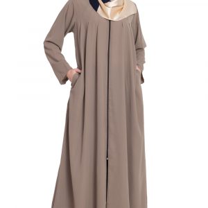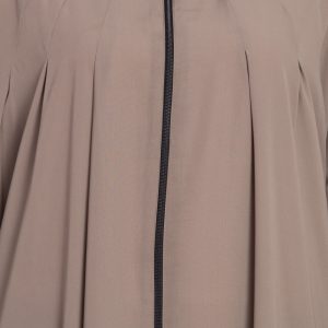 Elevate your wardrobe with the Badami Nida Abaya, crafted from premium imported Nida for a rich, opaque drape and a graceful A-line flare highlighted by chic coffee-colored stripes. This closed abaya is perfect for both formal events and everyday elegance; dry clean only.