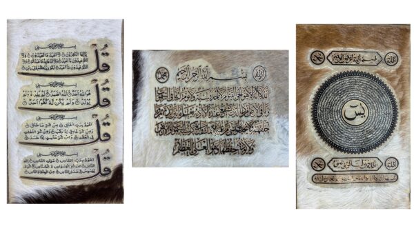 - Sacred Trio: Ayatul Kursi, Yaseen Sharif, & Four Quls beautifully printed on goat skin.