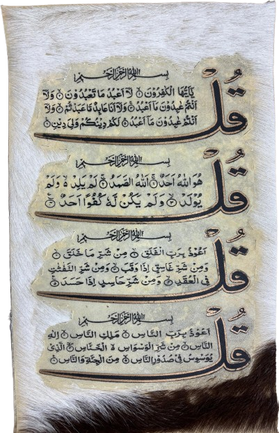 Islamic Wall Art: Ayatul Kursi, Yaseen Sharif, & Four Quls Tughra Combo on Goat Skin.