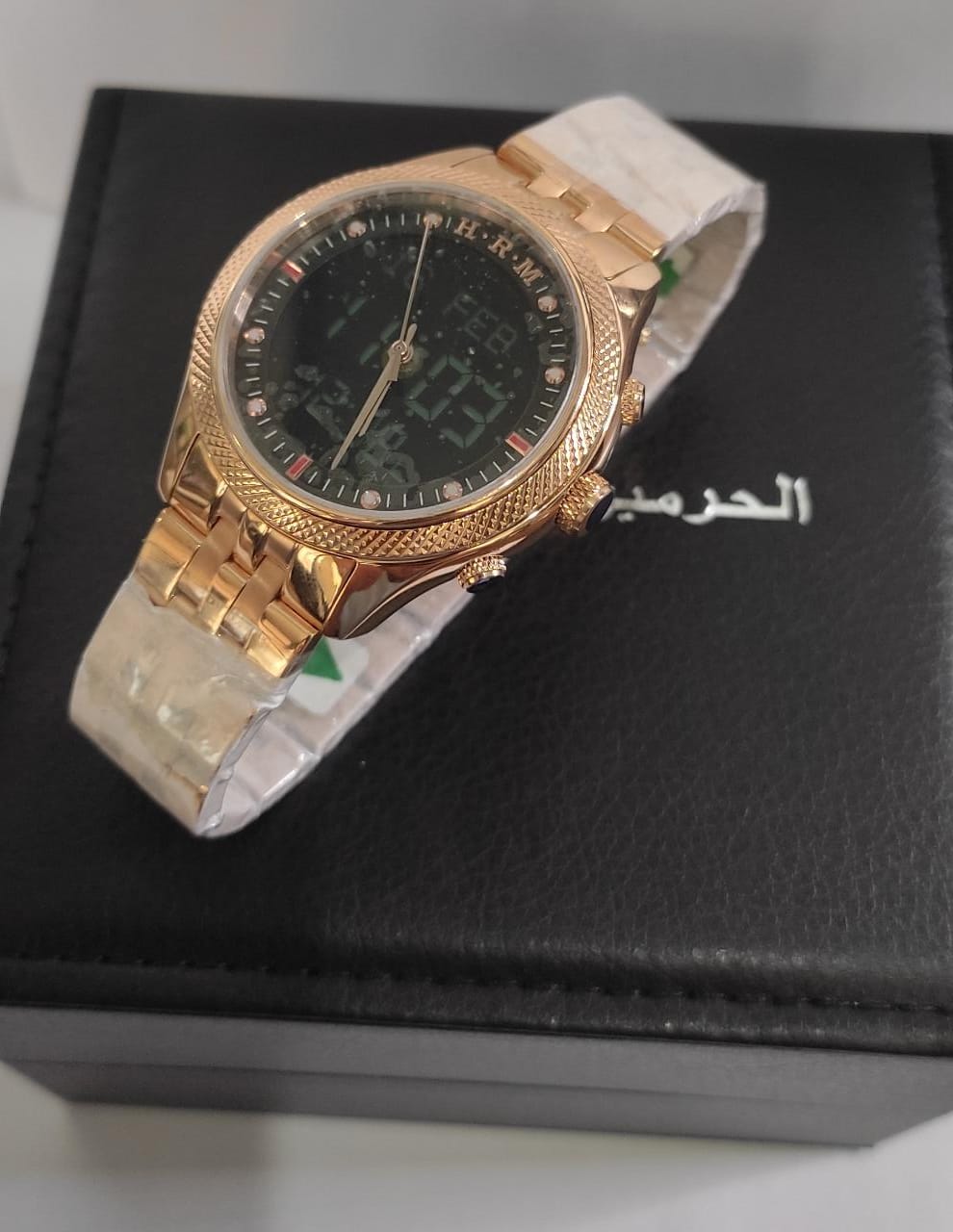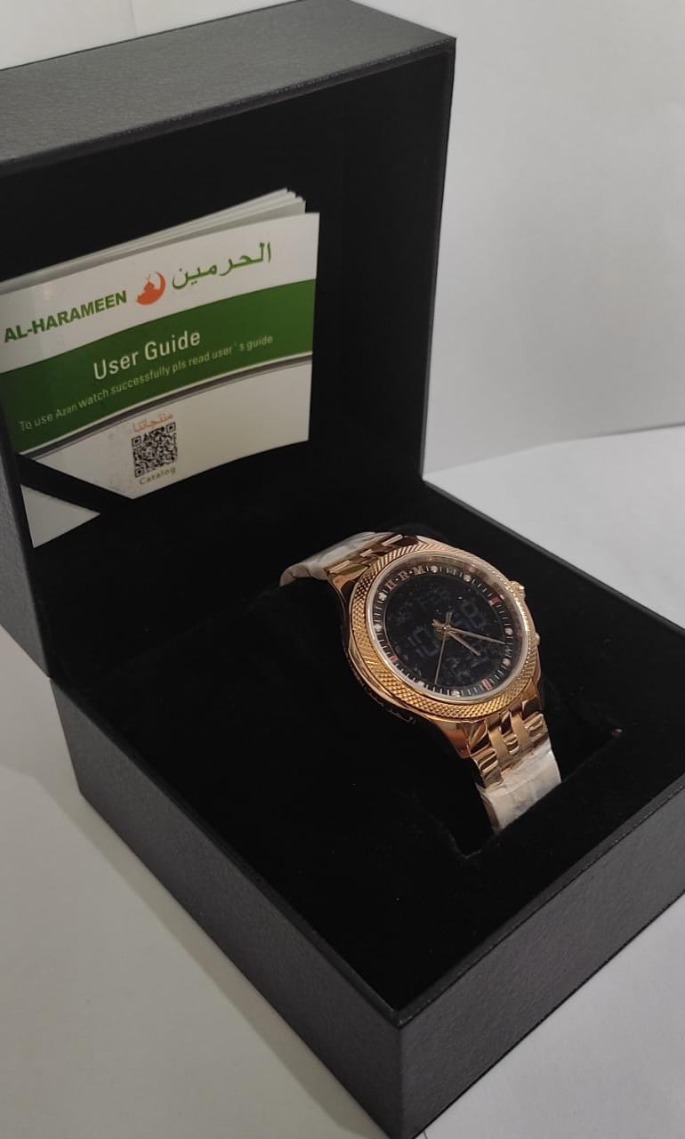 Al Harameen Wrist Watch Golden Belt Black Dial HA-6105-FRB Worldwide prayer times Auto Qibla Direction Hijri and Gregorian calendar with day week Daily alarm and prayer alarms Two languages (English and Arabic) Water-res