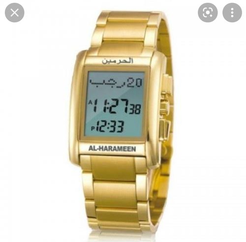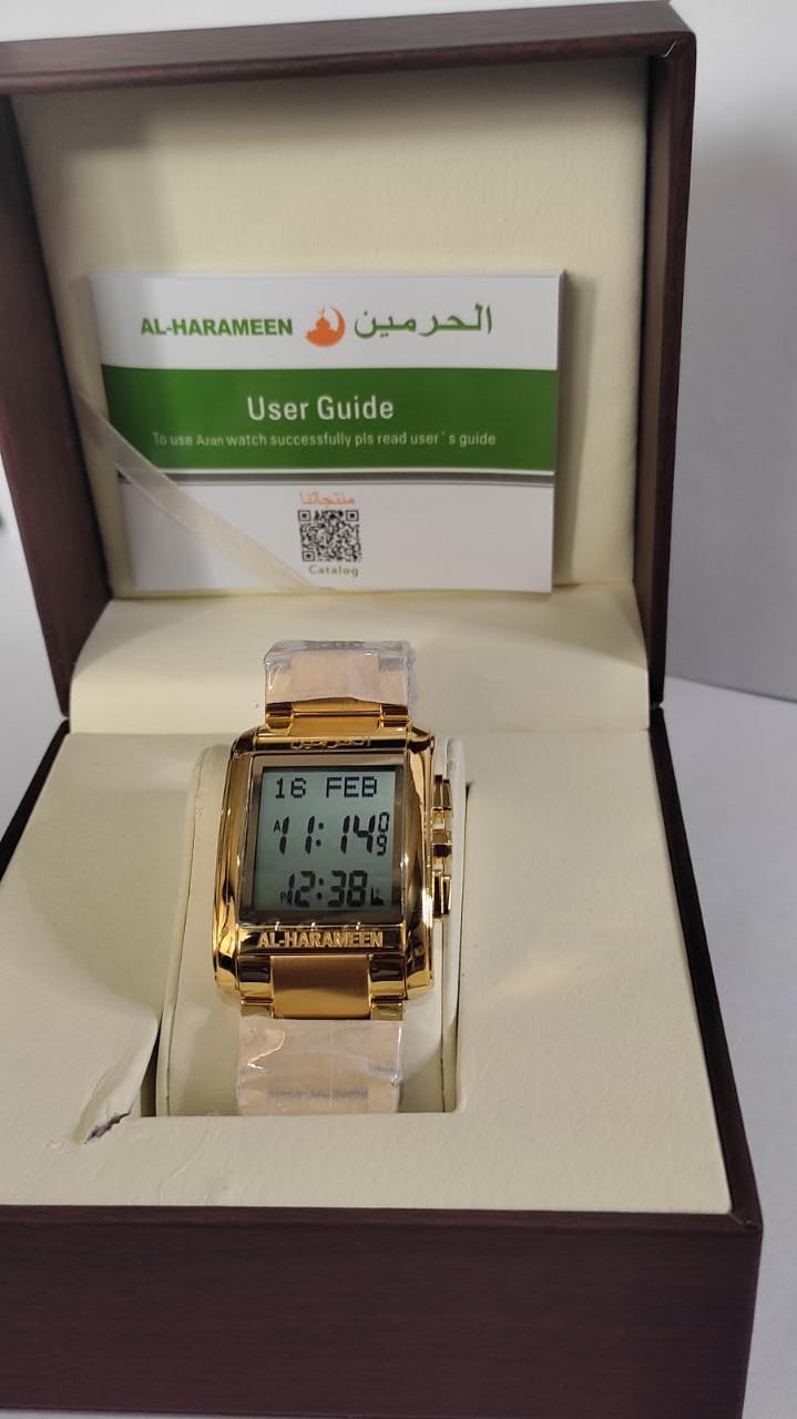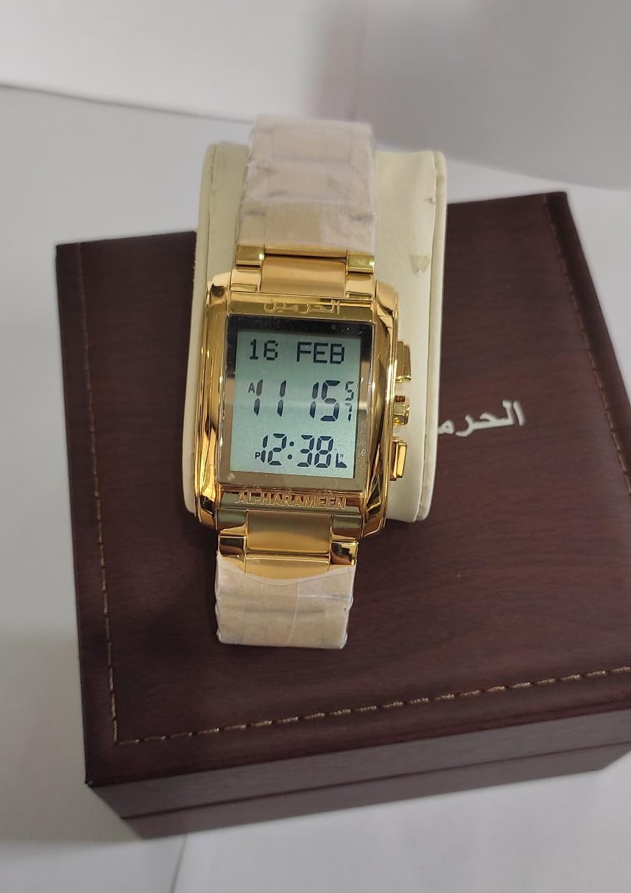 Azan Watches – Al Harameen Wrist Watch HA-6210-FGW HA-6210 DiamondsWorldwide prayer times Auto Qibla Direction Hijri and Gregorian calendar with day week Daily alarm and prayer alarms Two language (English and Arabic) Water resistant