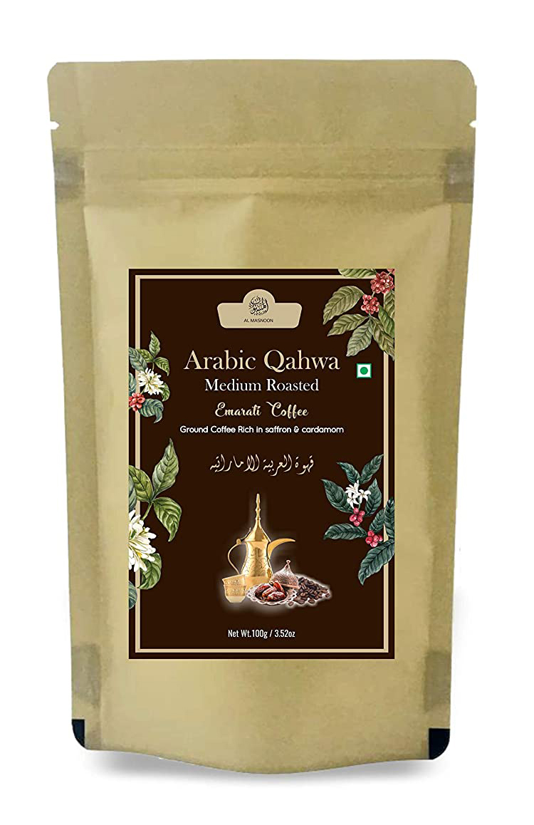al masnoon arabic emarati qahwa is made from finest quality of ground dark roasted coffee beans rich in pure saffron and cardamom . a perfect blend of emarati qahwa
