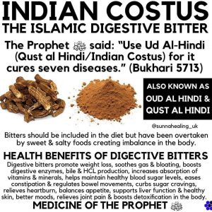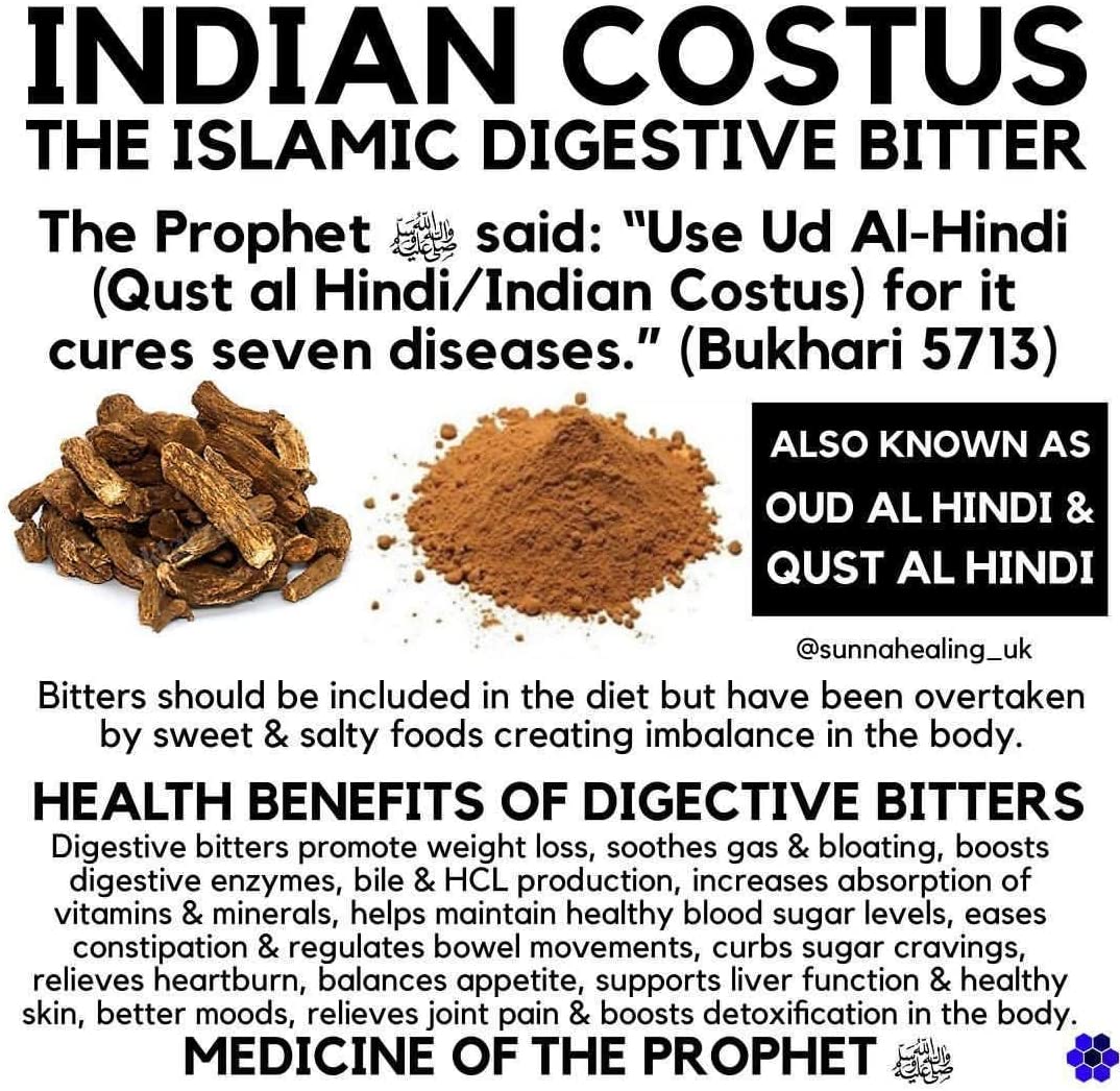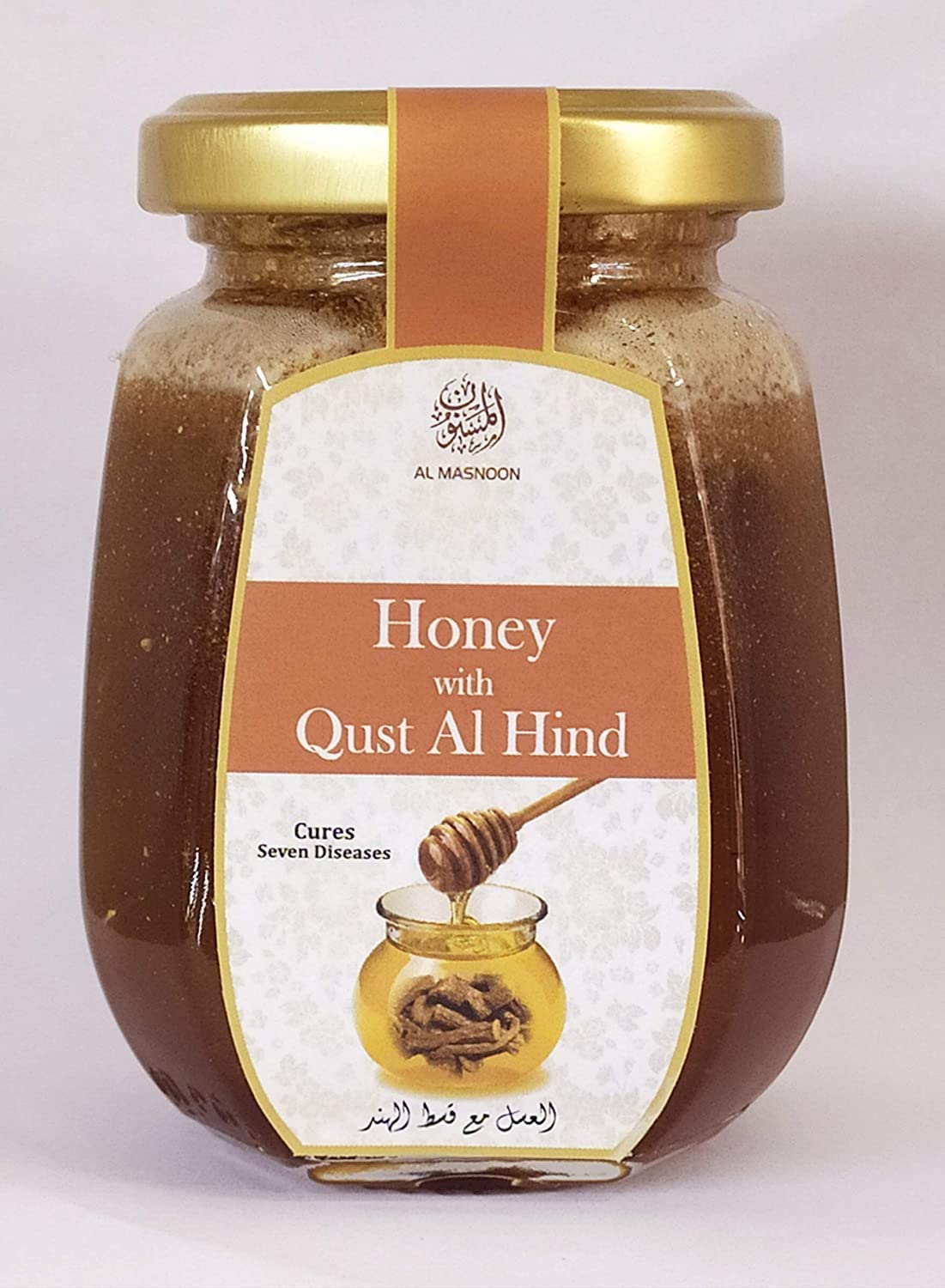 AL Masnoon honey with qust al hindi is blended with pure honey and indian cotus root . indian costus root is an islamic herb and medicine of the prophet. The Prophet (peace be upon him) said ” use qust al hindi / indian costus for it cures seven diseases (bukhari 5713).