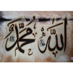 Allah Muhammad On Goat Skin Print (Small) is an exquisite piece of Islamic art that embodies the profound beauty of faith. Carefully crafted on authentic goat skin, this artwork features the sacred names of Allah and Muhammad in elegant Arabic calligraphy. It serves as a constant reminder of spirituality and devotion, making it a perfect addition to any Islamic home or workspace.