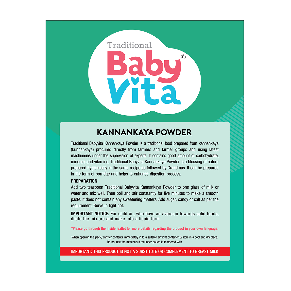 Discover the richness of Kannankaya Powder by Traditional Babyvita. Crafted from premium kannankaya sourced directly from local farmers and farmer groups, this product is a true embodiment of tradition and quality. The manufacturing process, overseen by experts, ensures the preservation of its rich nutritional profile, abundant in carbohydrates, minerals, and vitamins.