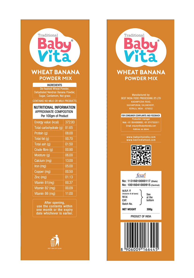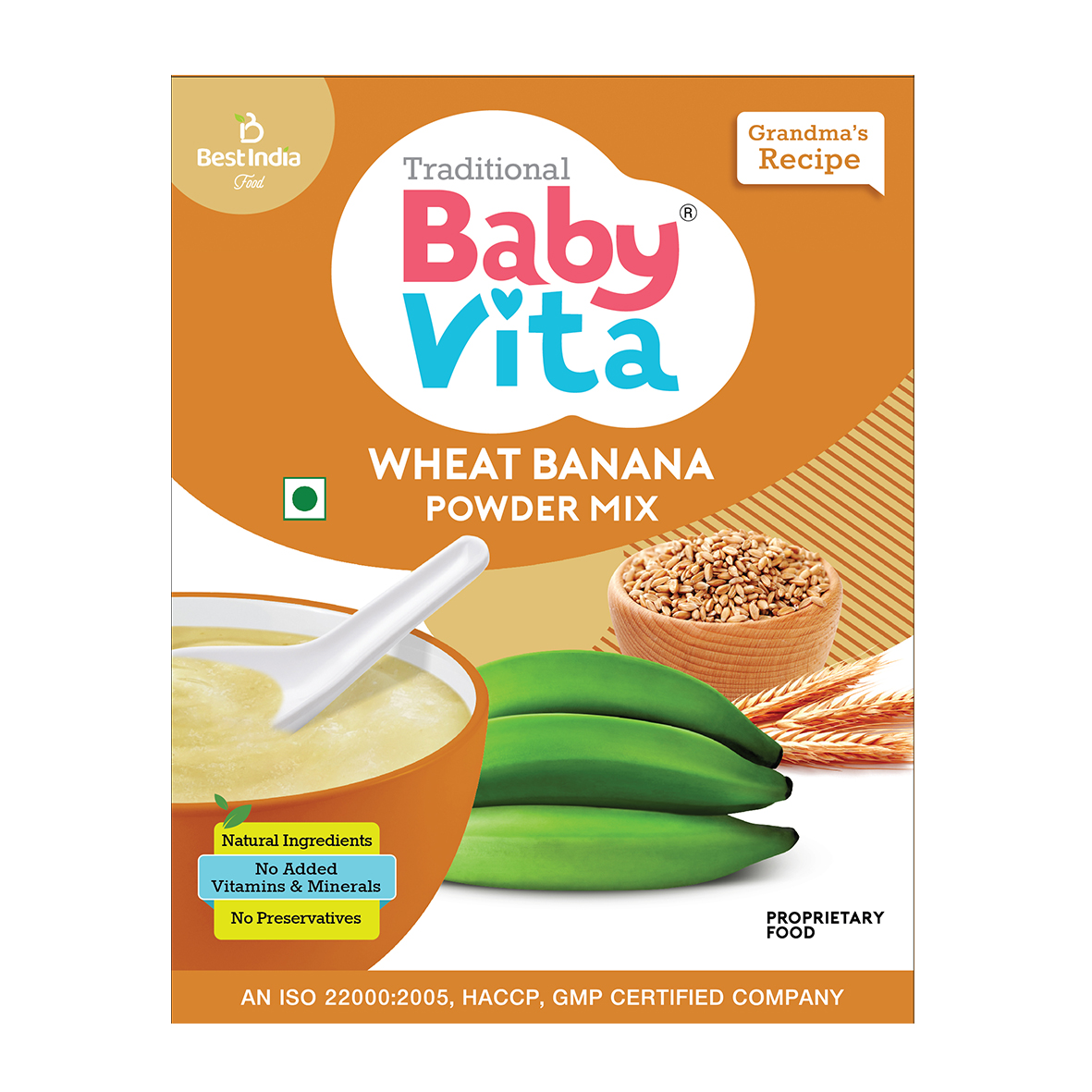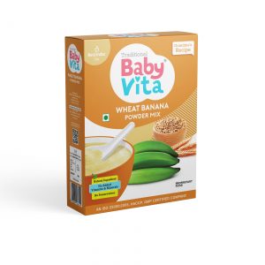 Introducing Babyvita’s time-honored blend – the Nendran Banana Wheat Mix. At Babyvita, we specialize in creating natural products, and our Wheat Banana Mix is a testament to our commitment to purity. Crafted from dehydrated Nendran bananas, de-husked wheat, muthanga (nut grass), sugar, and cardamom, this mix follows the cherished wisdom of our Grandmas.