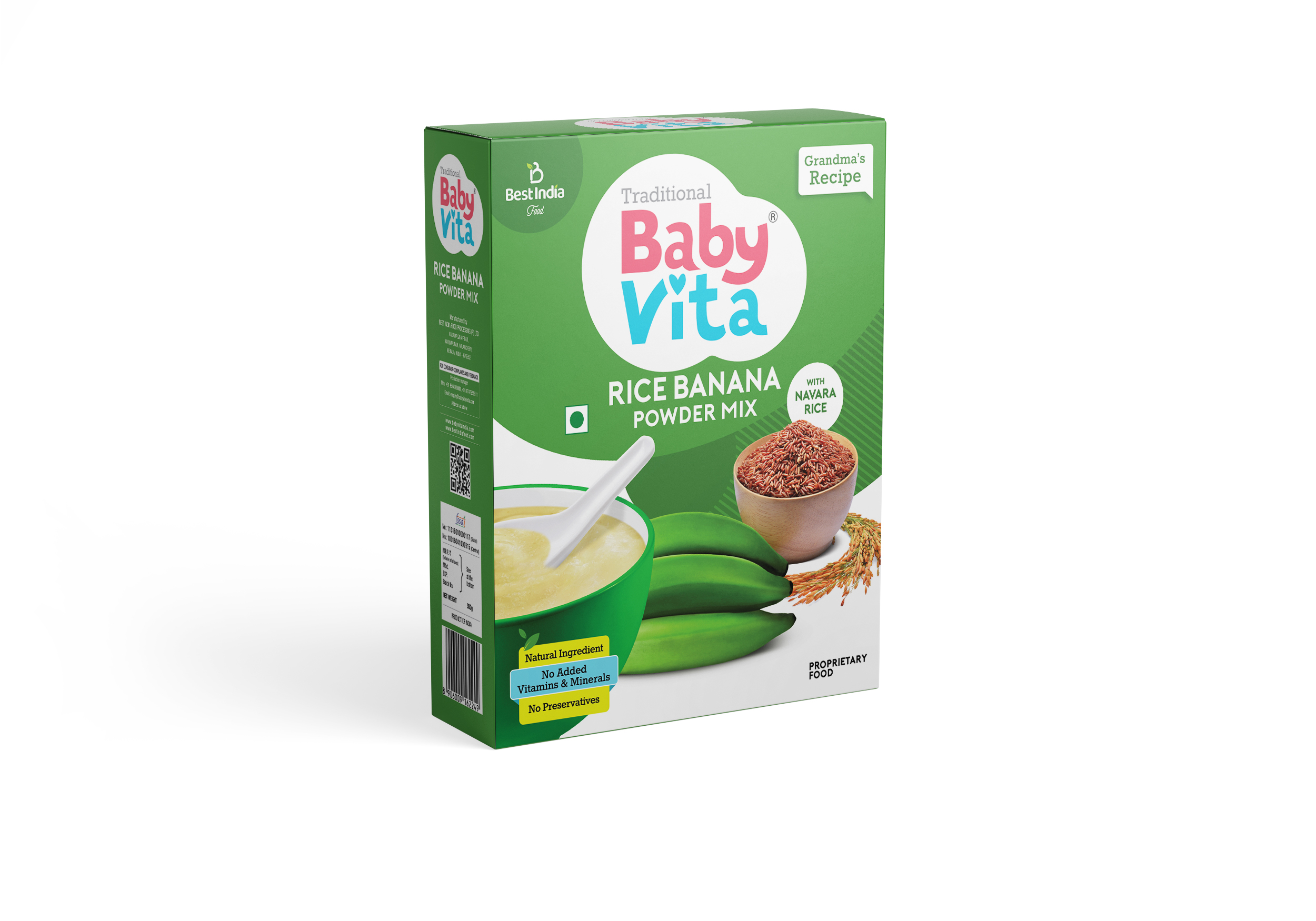 Embrace the wholesome goodness of Traditional Babyvita with our Rice Banana Powder Mix. Crafted with a blend of dehydrated Nendran bananas, Navara rice, regular rice, muthanga (nut grass), sugar, and cardamom, this product follows a time-tested recipe that echoes the flavors of Grandma’s kitchen. At Traditional Babyvita, we’re committed to using natural ingredients and avoiding preservatives or chemicals in our manufacturing process.