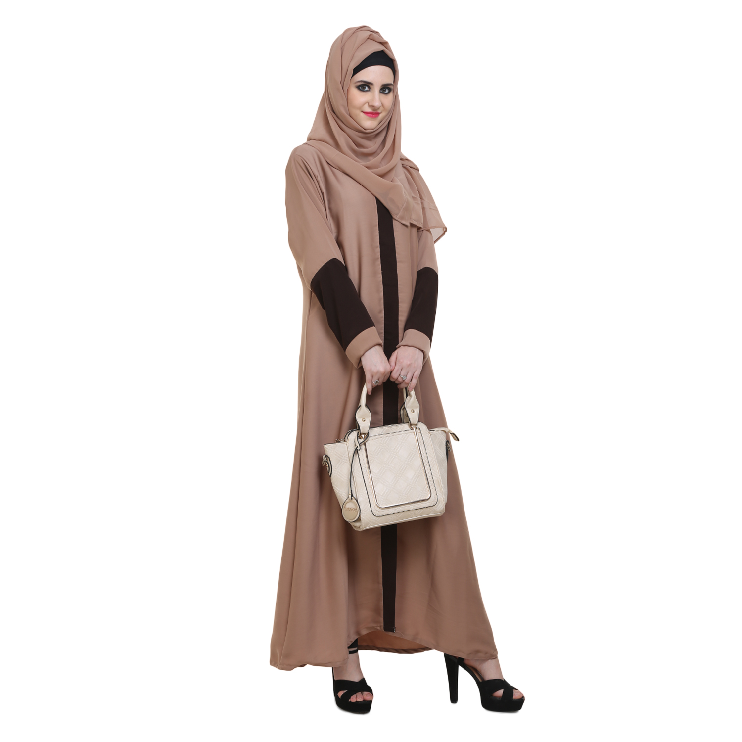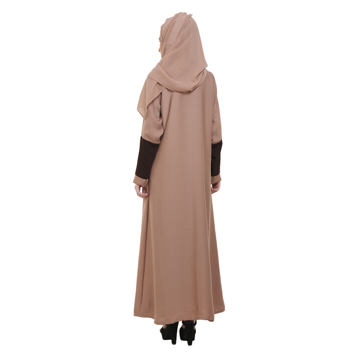 Elevate your wardrobe with the Badami Nida Abaya, crafted from premium imported Nida for a rich, opaque drape and a graceful A-line flare highlighted by chic coffee-colored stripes. This closed abaya is perfect for both formal events and everyday elegance; dry clean only.