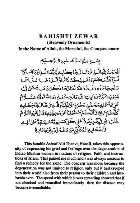 It is therefore high time to show the Muslim best way, of living a life of obedience to God providing him with the full knowledge and understanding of Islam. In view of the pressing need of the time and realising its importance for English reading public, our academy has made an attempt first of all to present the most valuable book consisting the detailed study of Islamic faith and paradise named Bahishti-Zewar (Heavenly Ornaments). This is the book which has won the admiration and applause of the Muslims and Non-Muslim scholars all over the world. The learned Author Name(s) of this book, Maulana Ashraf Ali Thanvi is well known by the honorary name of Hakeem-ul-Ummat through-out the world of Islam, and needs no introduction. He is Author Name(s) of more than one thousand books and pamphlets on Islam, providing the present age Revival of Islam with the intellectual foundations.