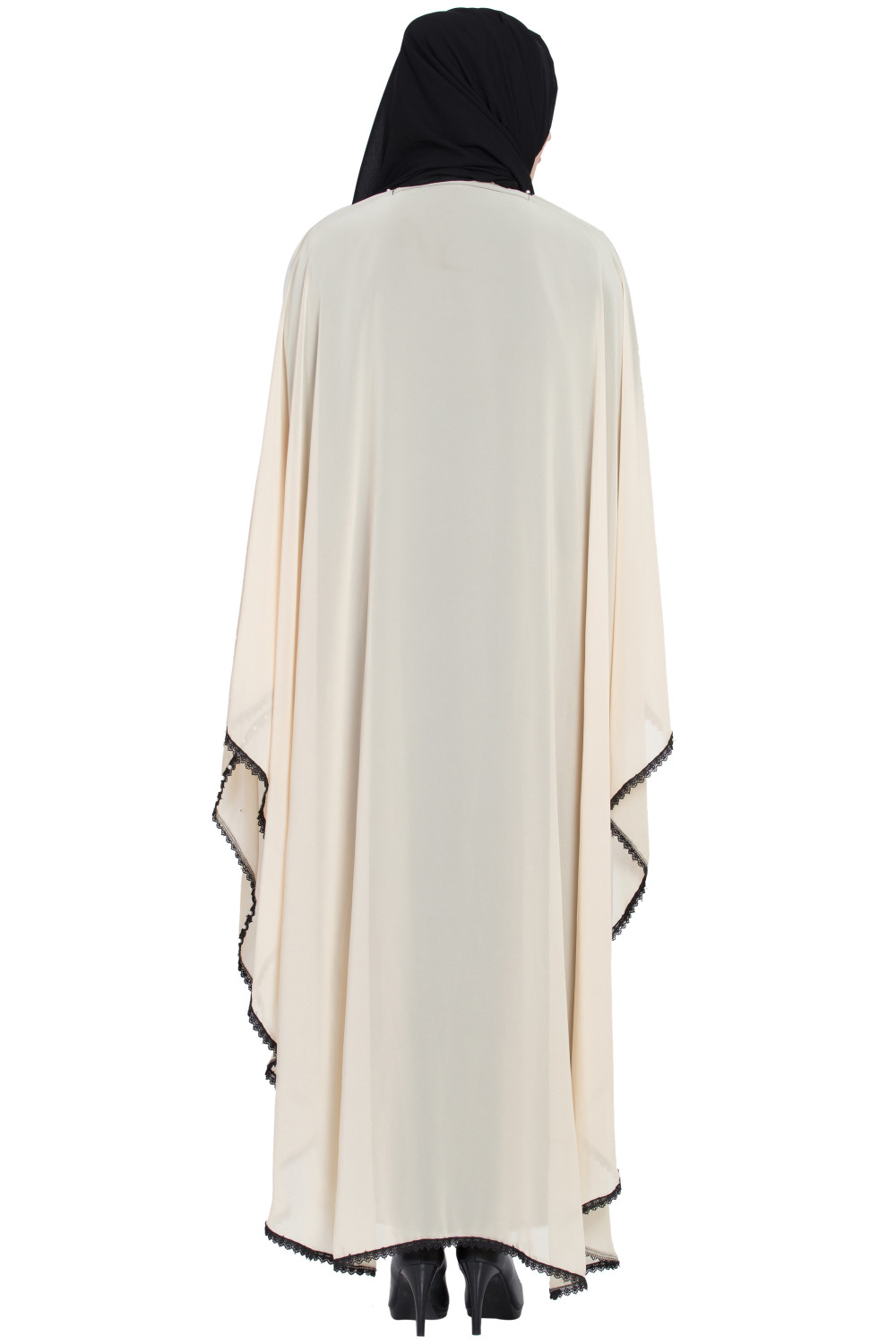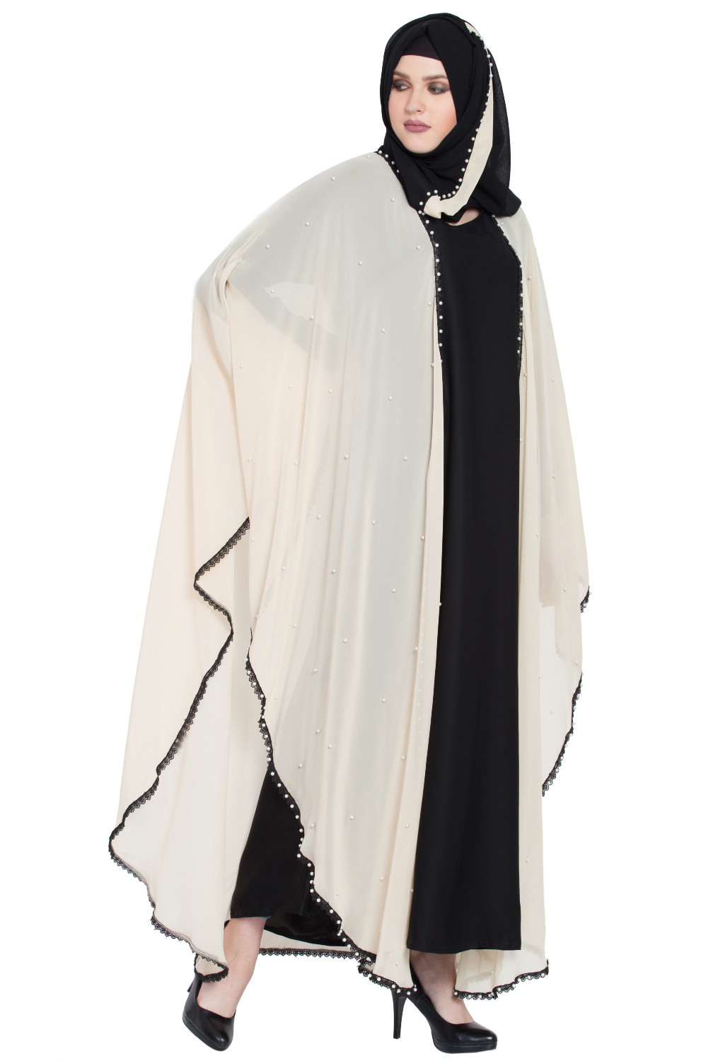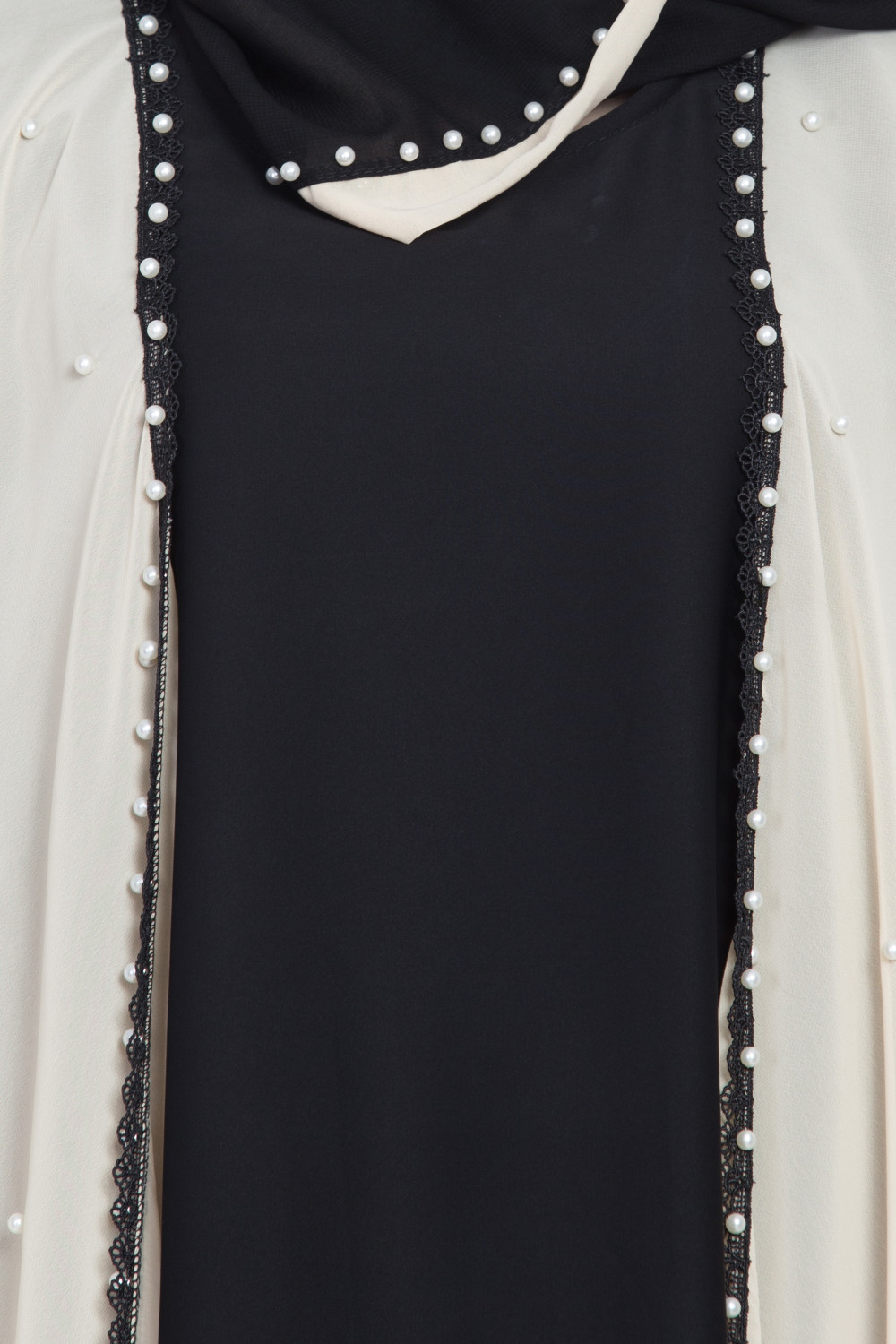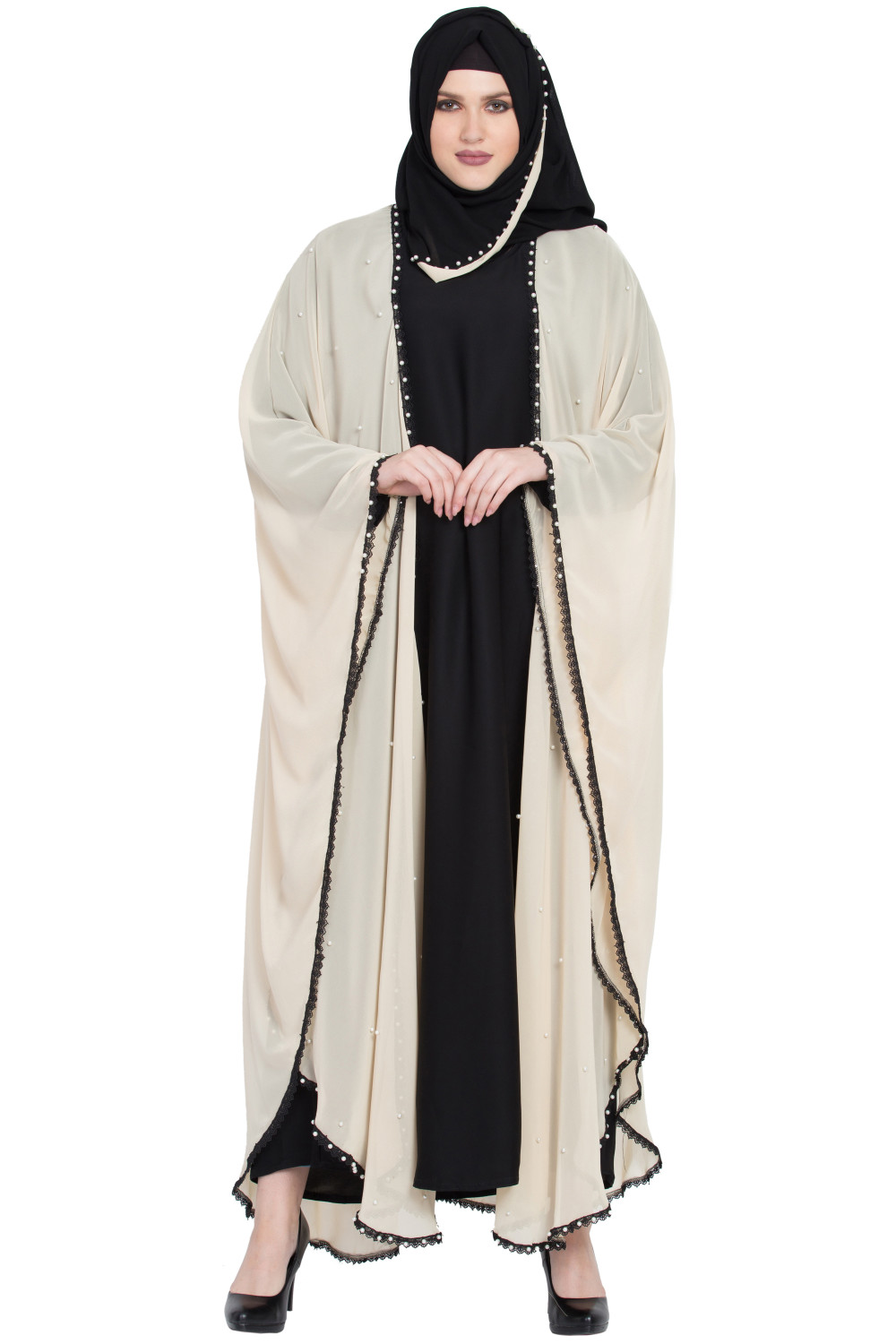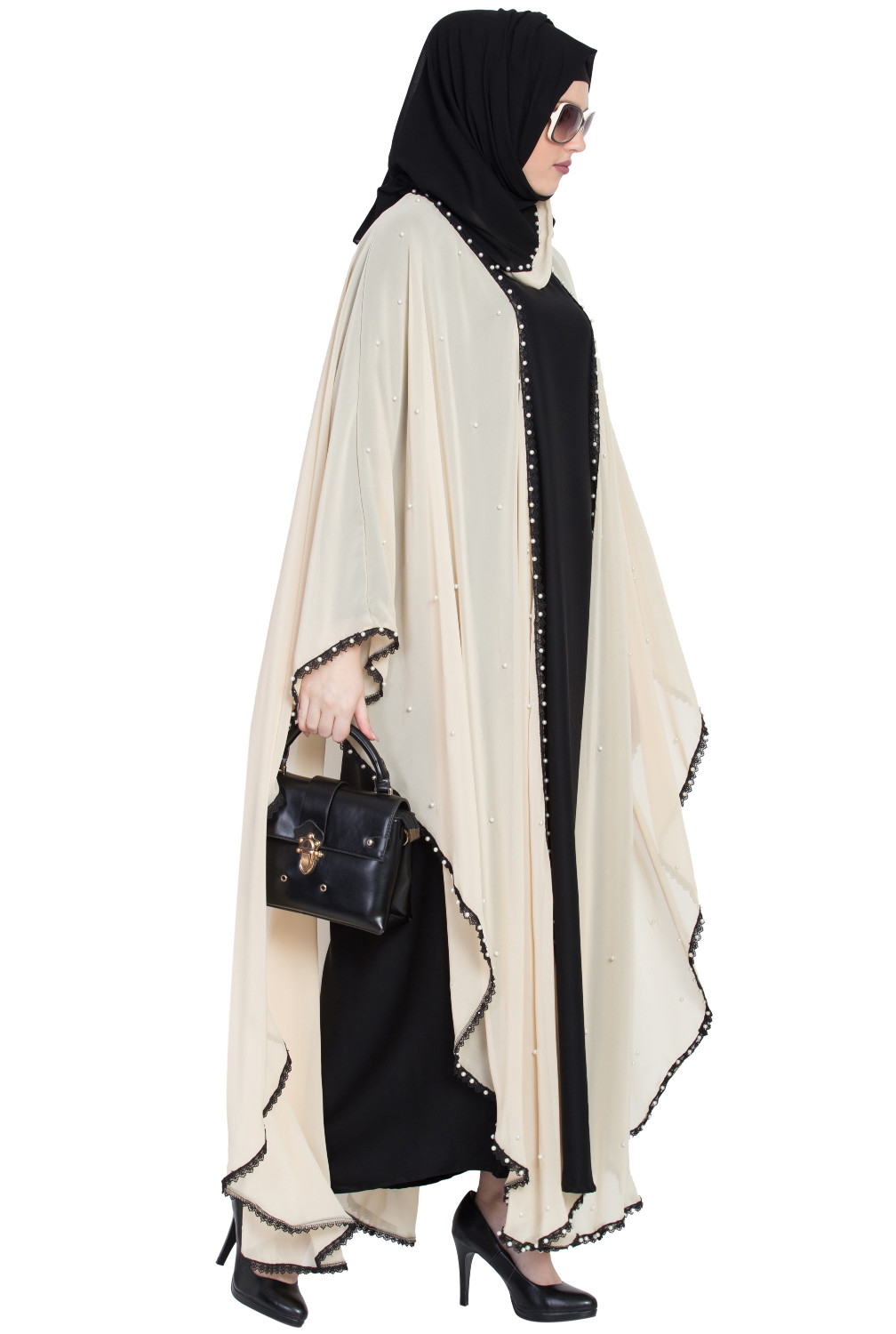 Designed with a graceful butterfly cut that drapes beautifully, this abaya offers effortless movement and a flattering, flowy shape. The front-open, full-length zipper adds convenience without compromising on sophistication, while pintuck detailing on both the front and back provides subtle structure. Pearl embellishments enhance the overall elegance, lending a delicate shimmer that catches the light in the most refined way.