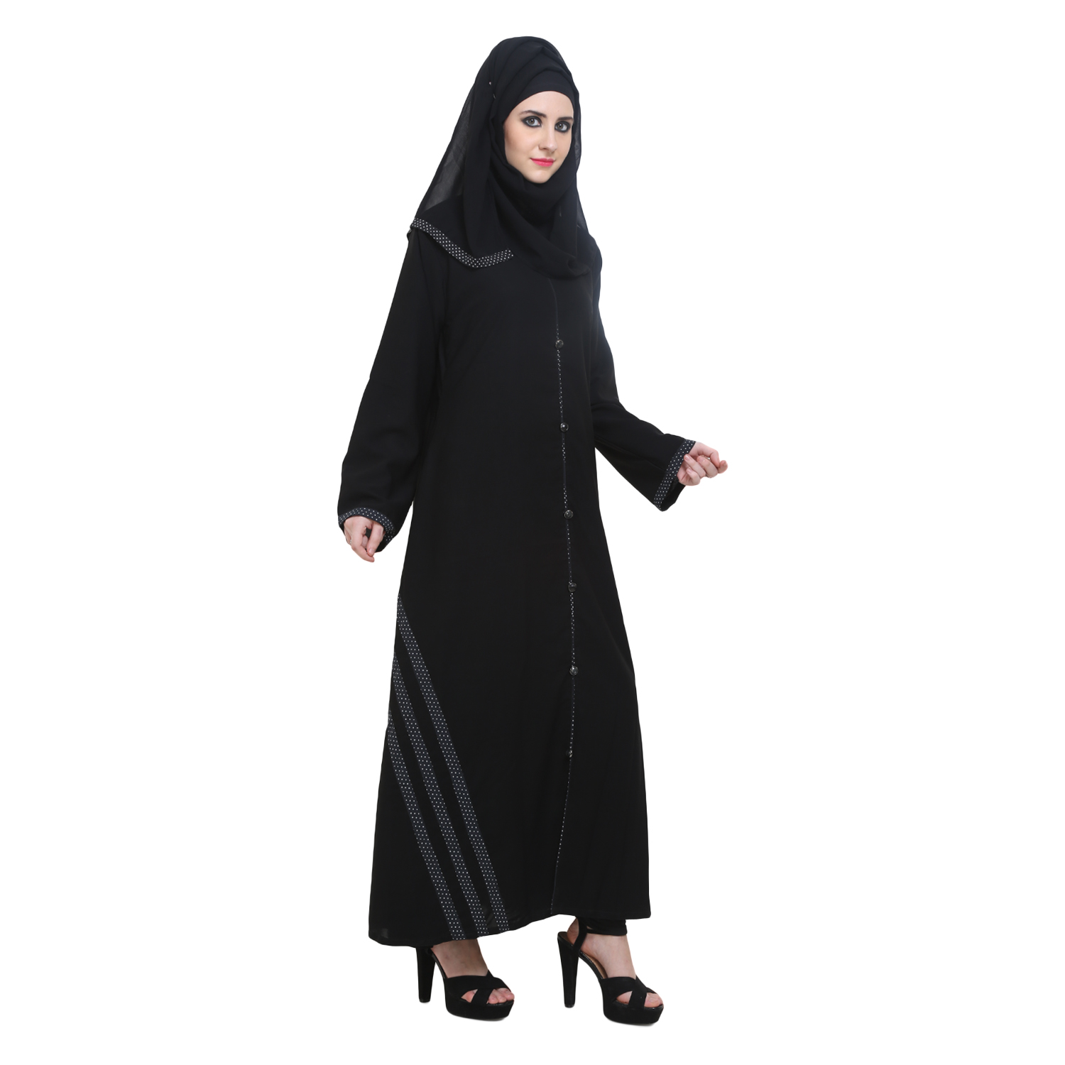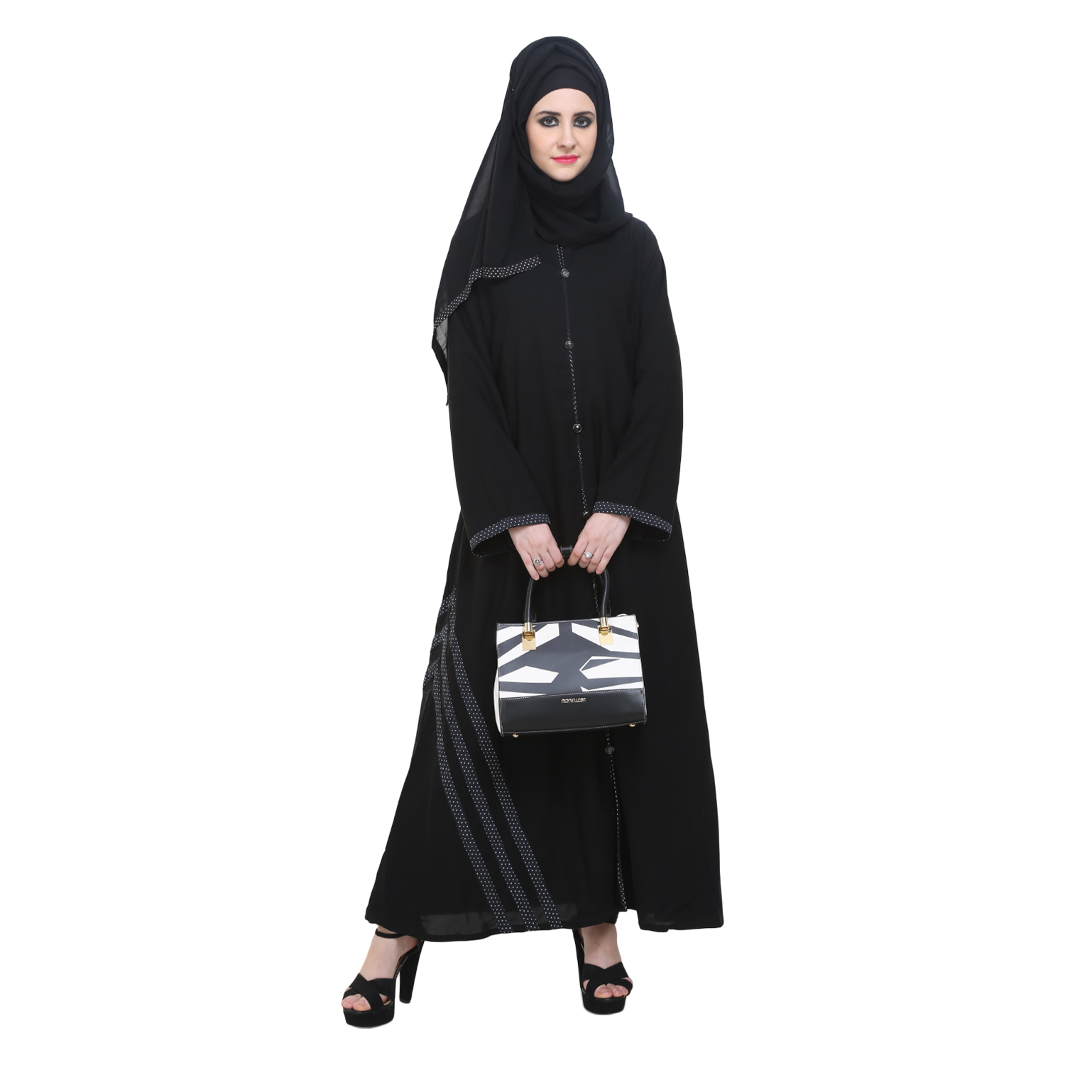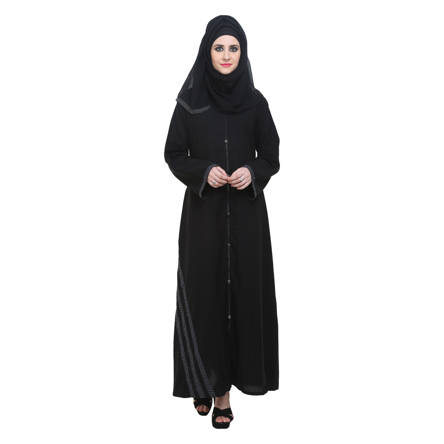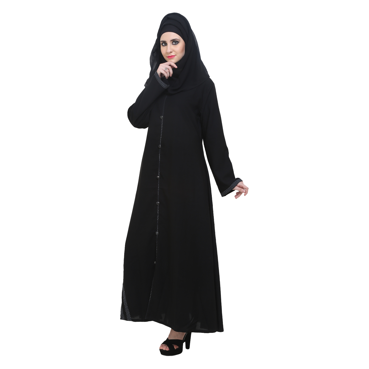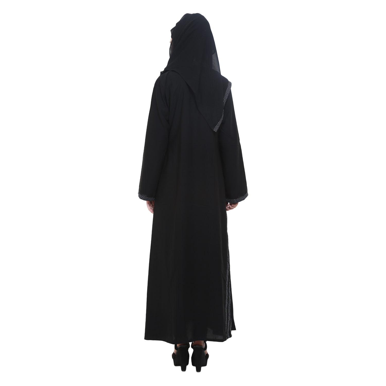 Elevate your everyday style with our stunning black crepe A-line abaya, crafted from premium imported crepe for a rich, flowy drape and finished with chic polka dot piping—matching hijab included. Featuring a closed design for effortless coverage; colors may vary slightly and dry clean only.