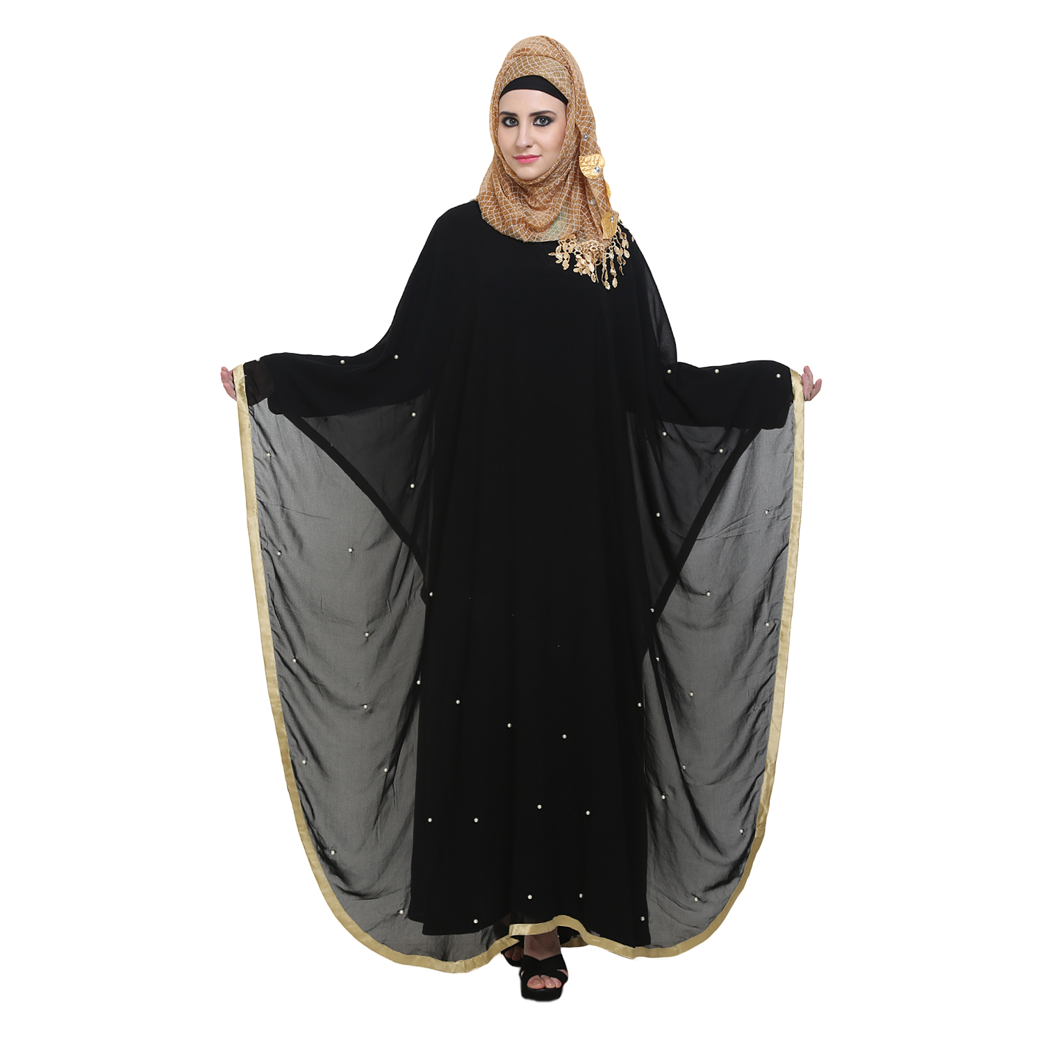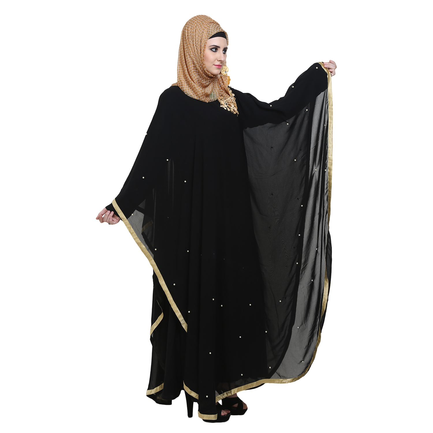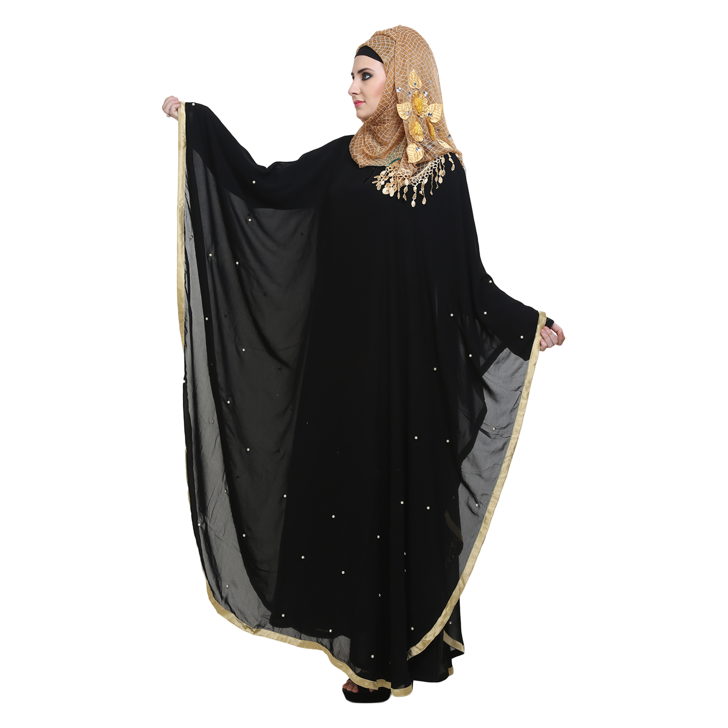 Abaya with golden color border and pearl work which makes the