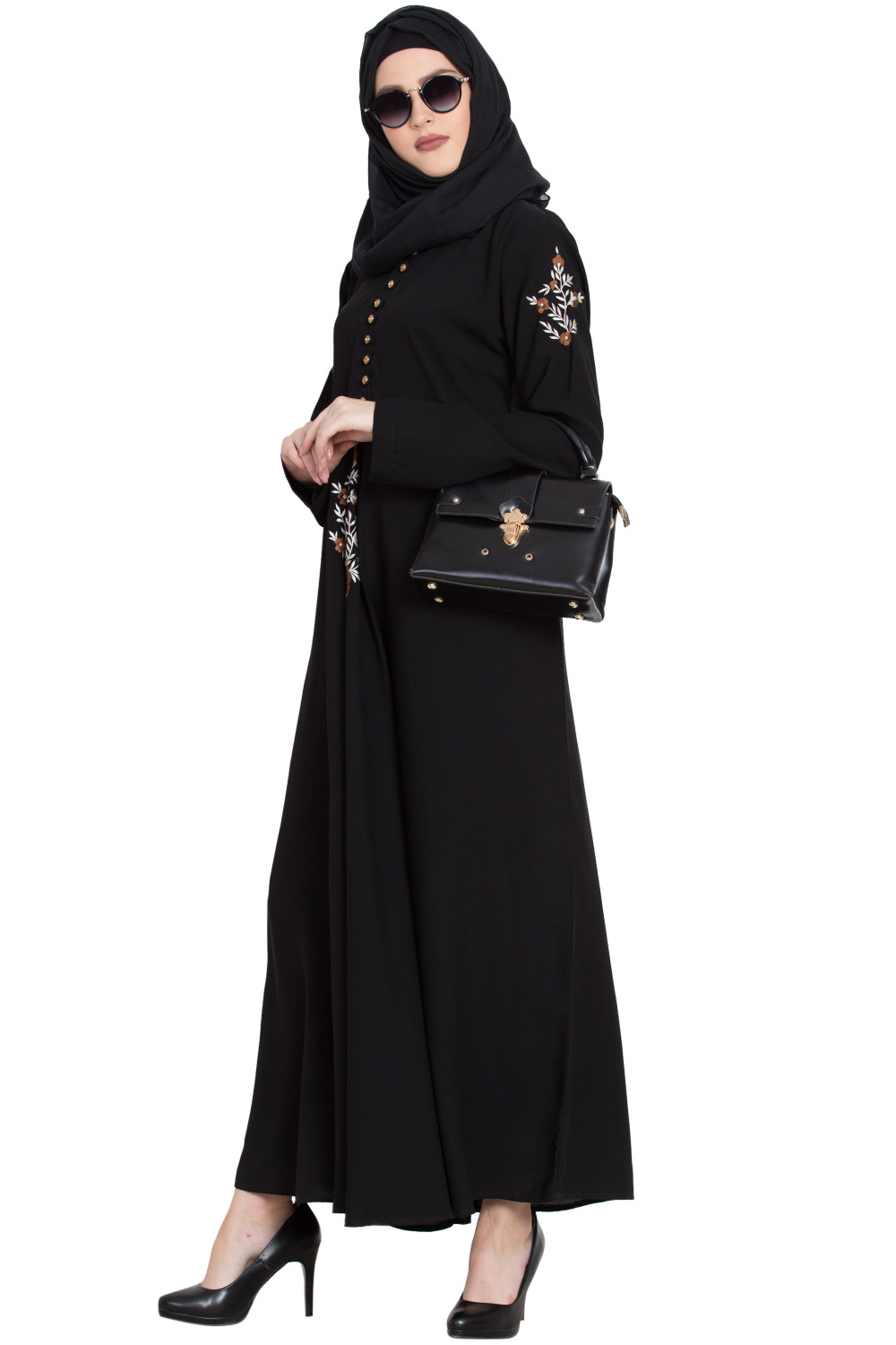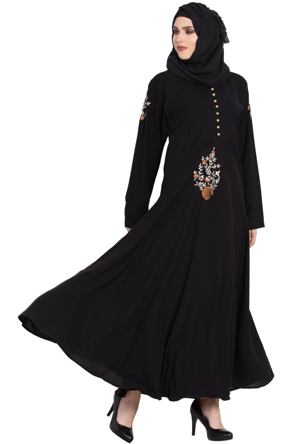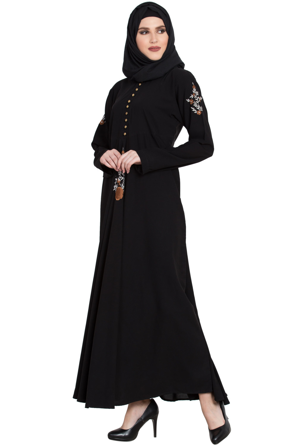 – Silhouette: Umbrella-style Flared Abaya with a gown-like sweep