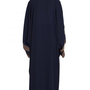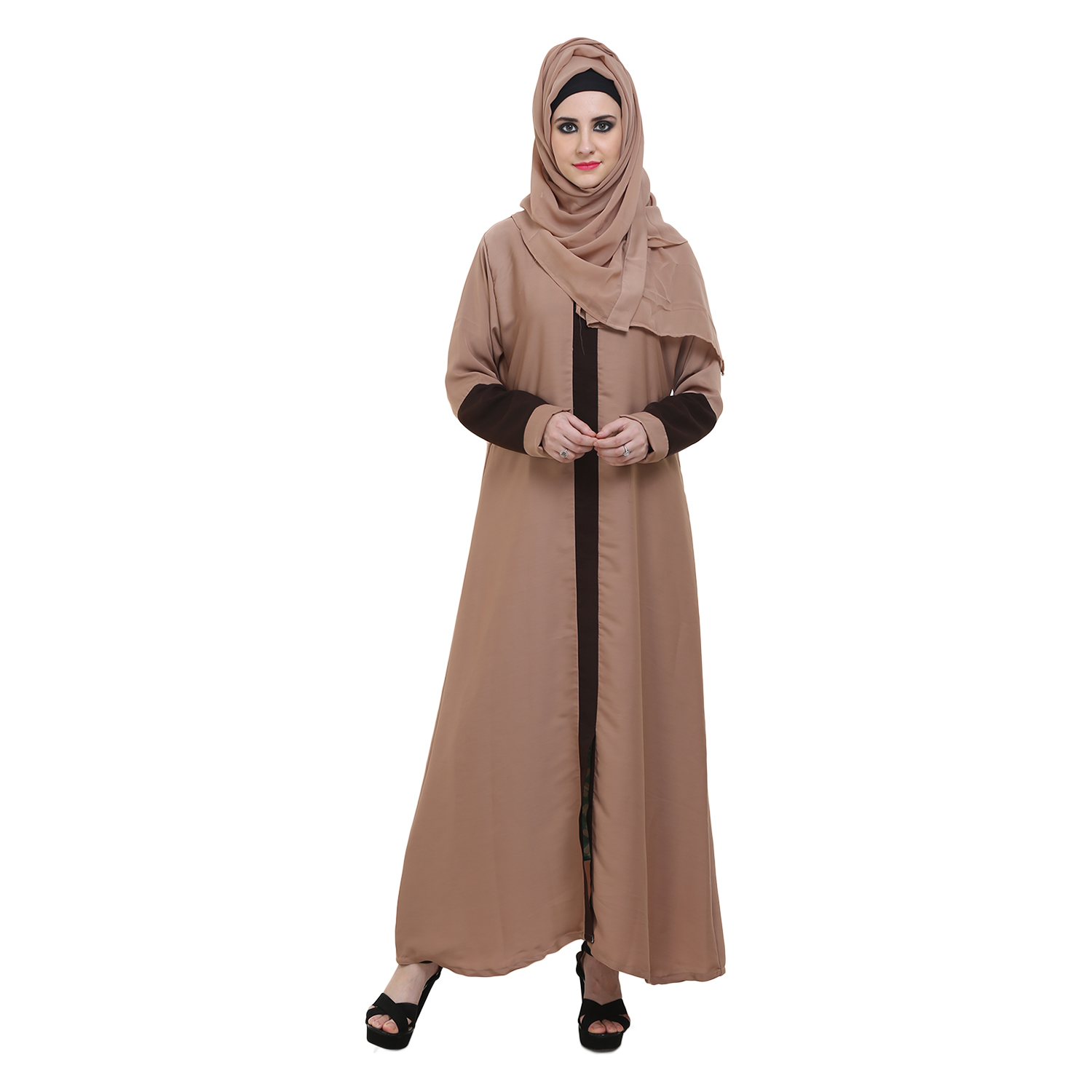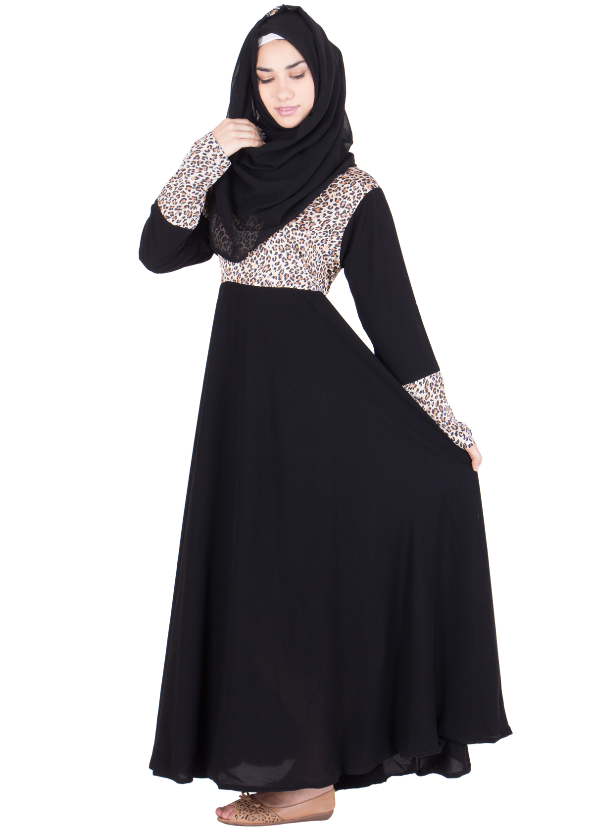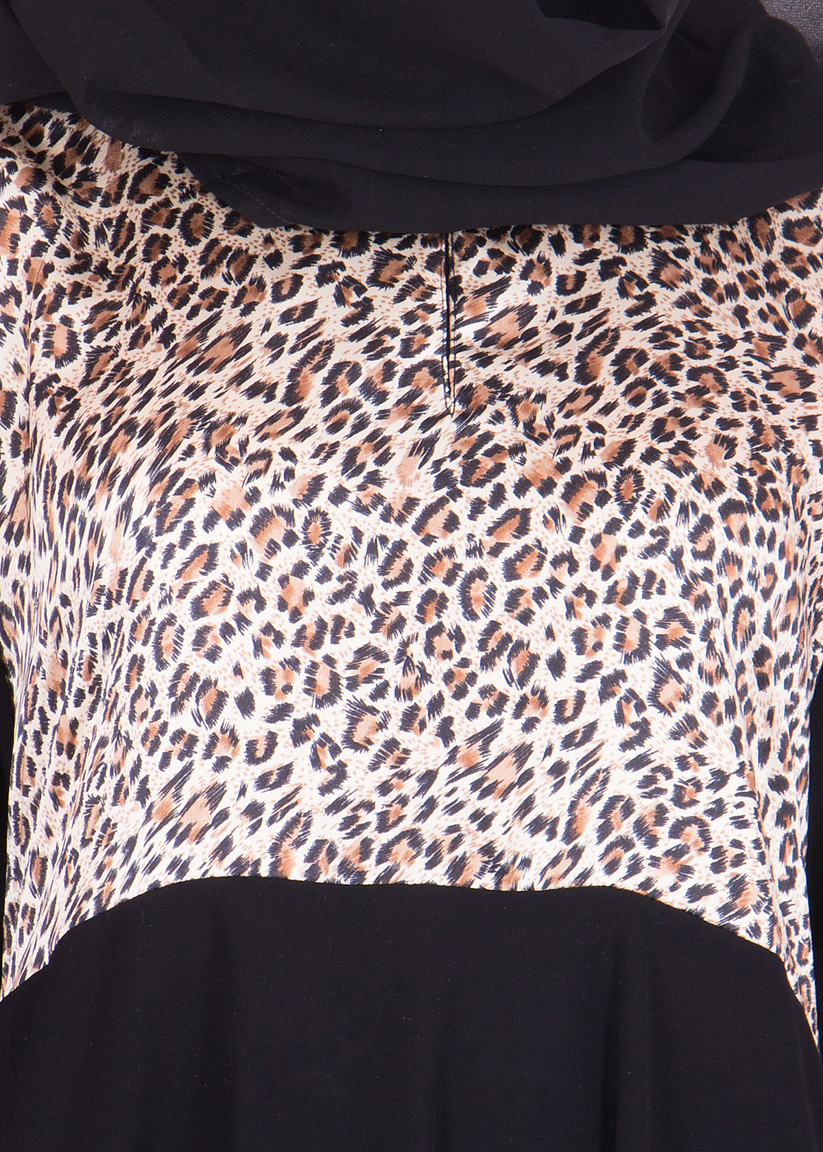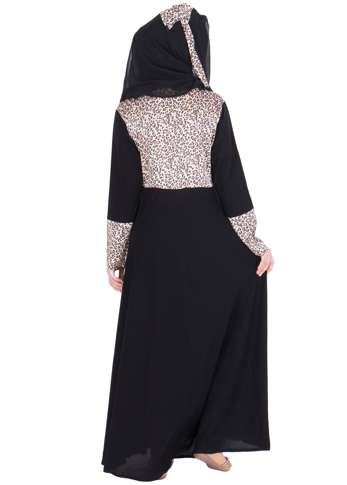 This Pretty Gown Style Abaya dress round neckline. TIger Print satin fabric used for designing on waist and sleeves.