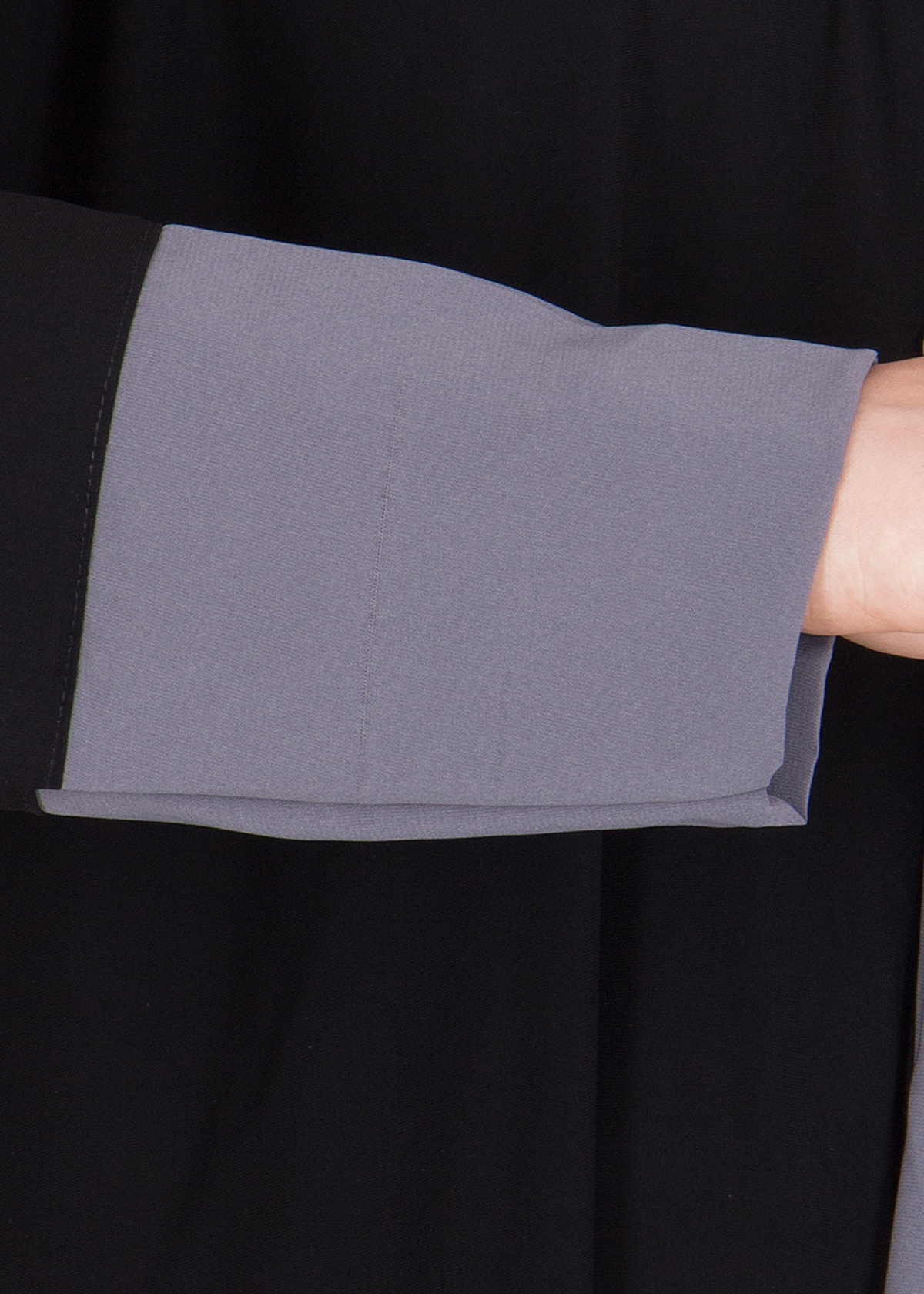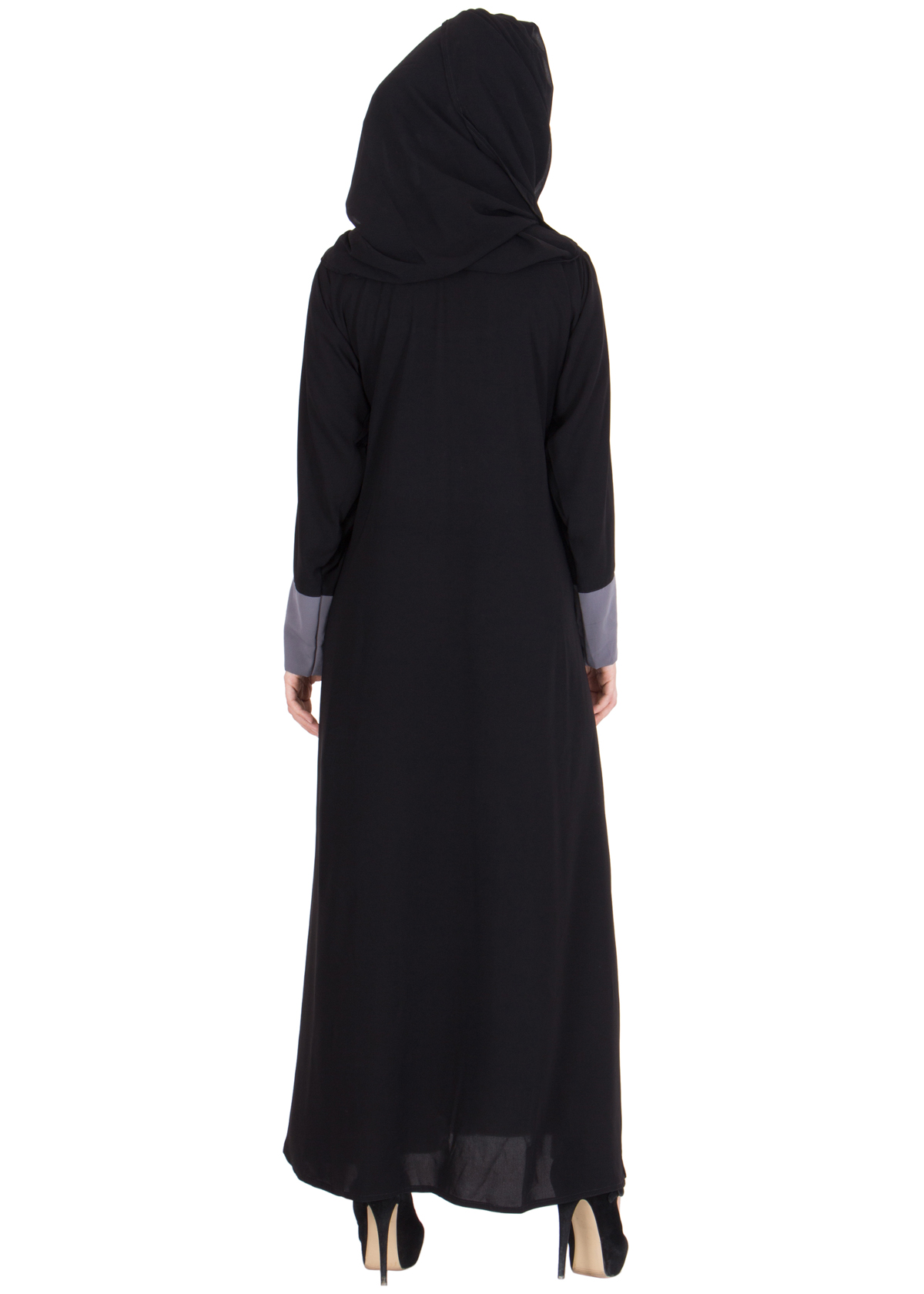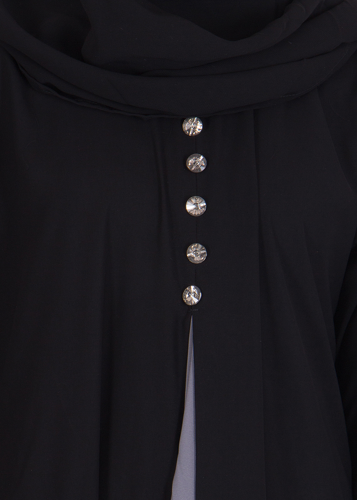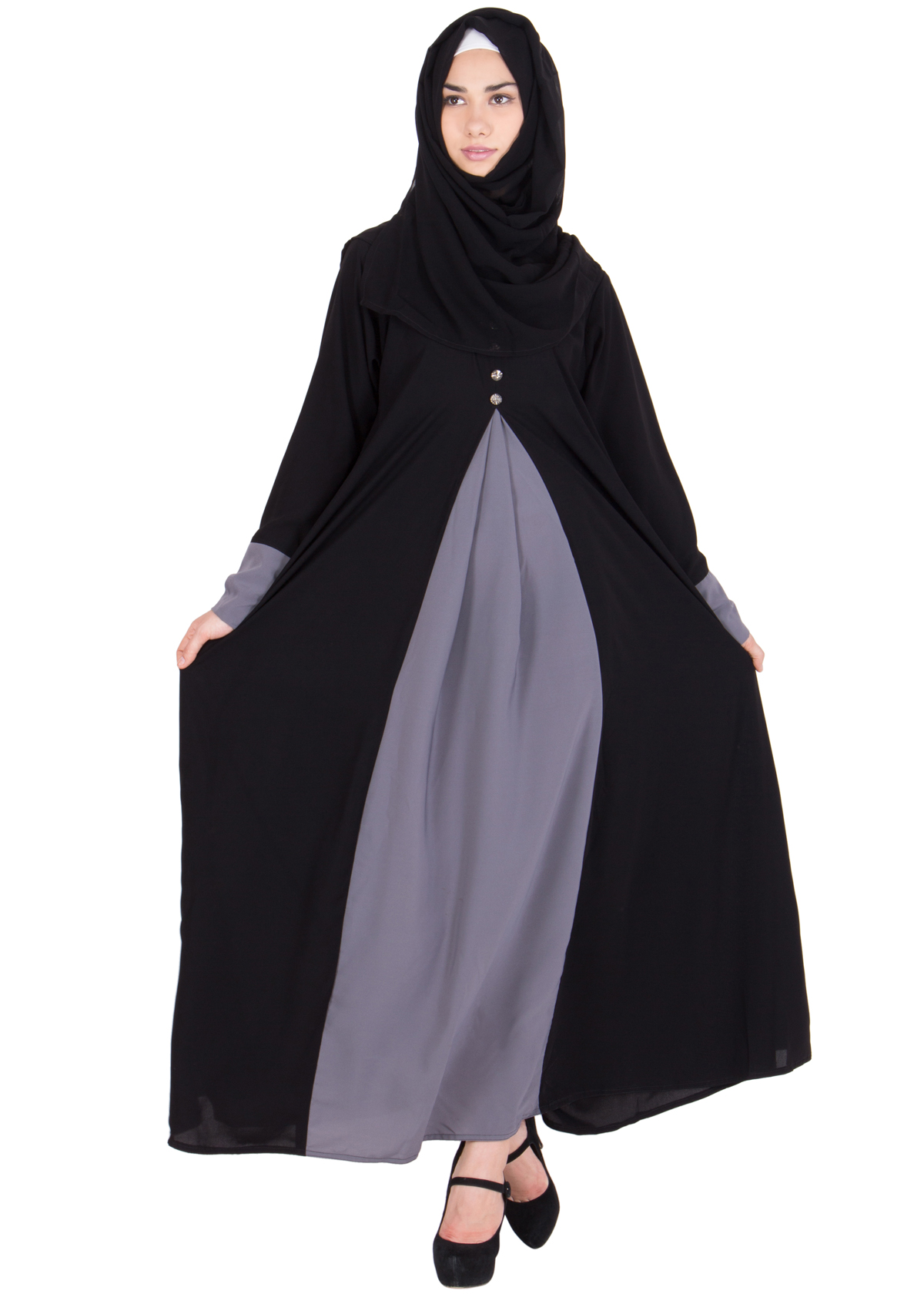The formal light grey panel adds a pop of freshness to this layered formal Abaya. This Abaya comes with a matching hijab. Colar over neckline with front Stone Buttons