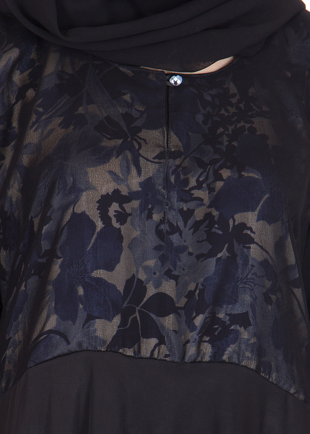 This Umbrella Abaya is made up with Black high quality Nida Fabric. Blue Printed Satin Fabric is used for designing in Waist & and in bottom flare. Matching Hijab is Included