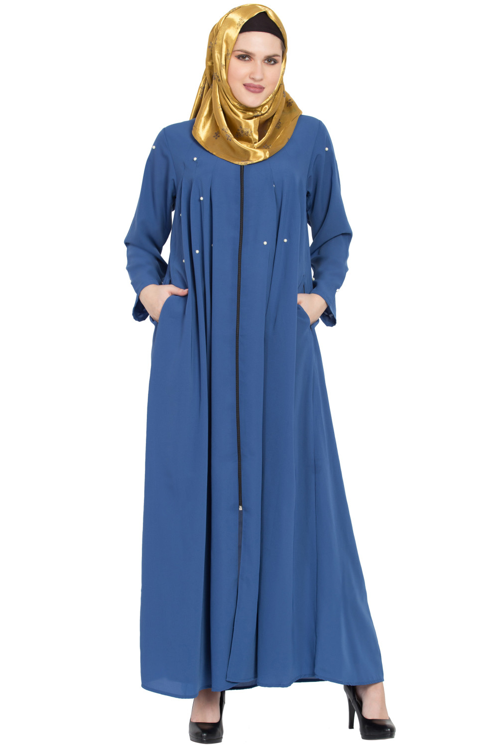 • Blue crepe abaya with pearl embellishment,