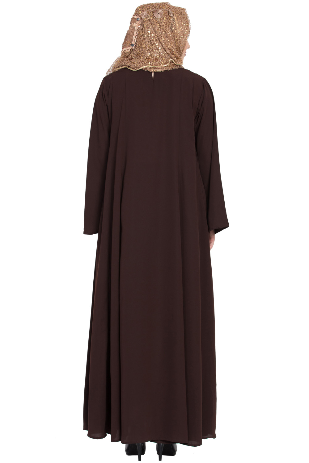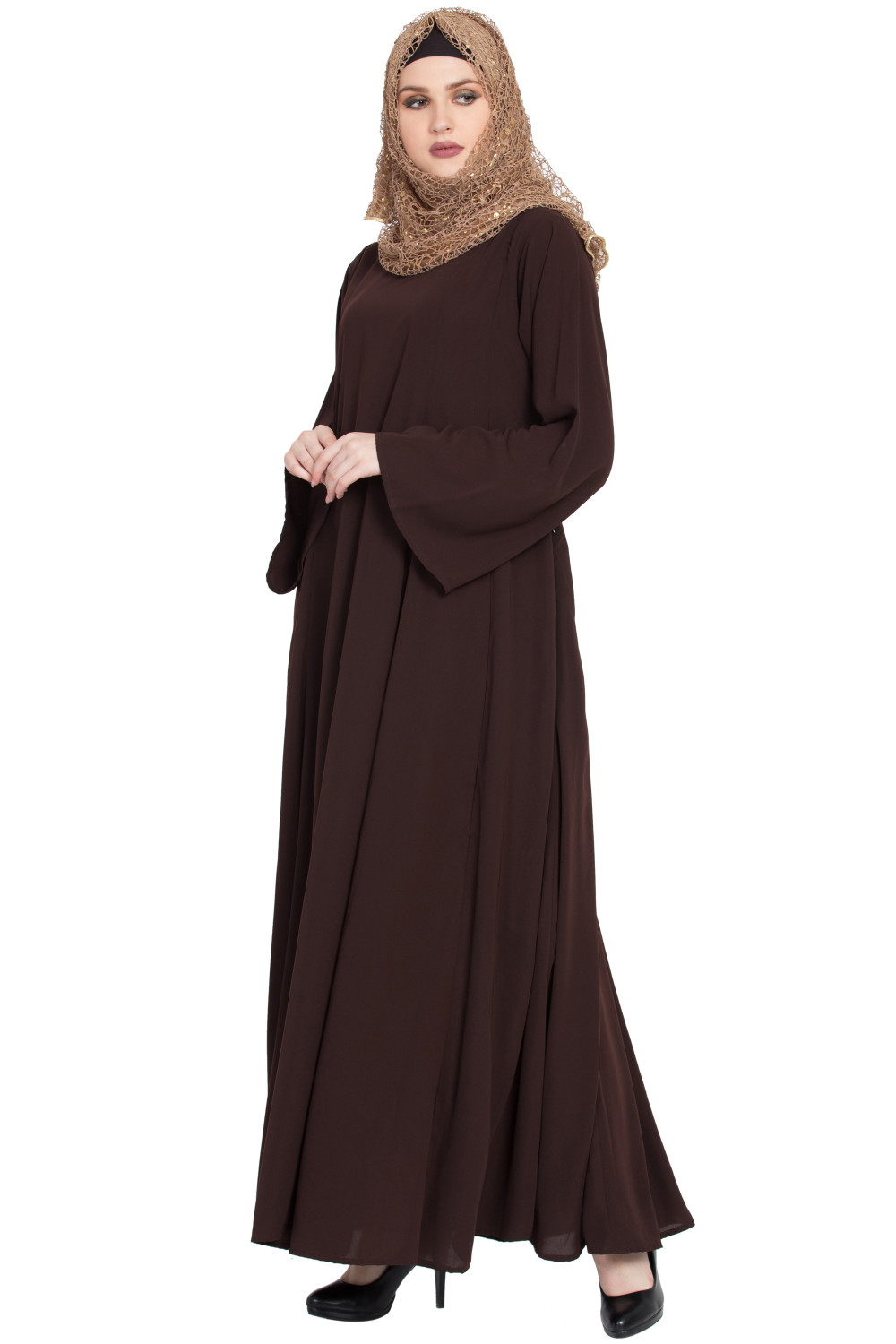 This abaya’s standout feature is its expansive flare, which creates a striking gown look while preserving a modest profile. Generously cut and beautifully balanced, the silhouette opens into a dramatic umbrella sweep that moves with poise. Box pleats at the waist and all around the skirt add depth and structure, ensuring the fabric falls in clean, elegant lines. The result is a timeless design that flatters without fuss—sophisticated, comfortable, and ready for any setting.