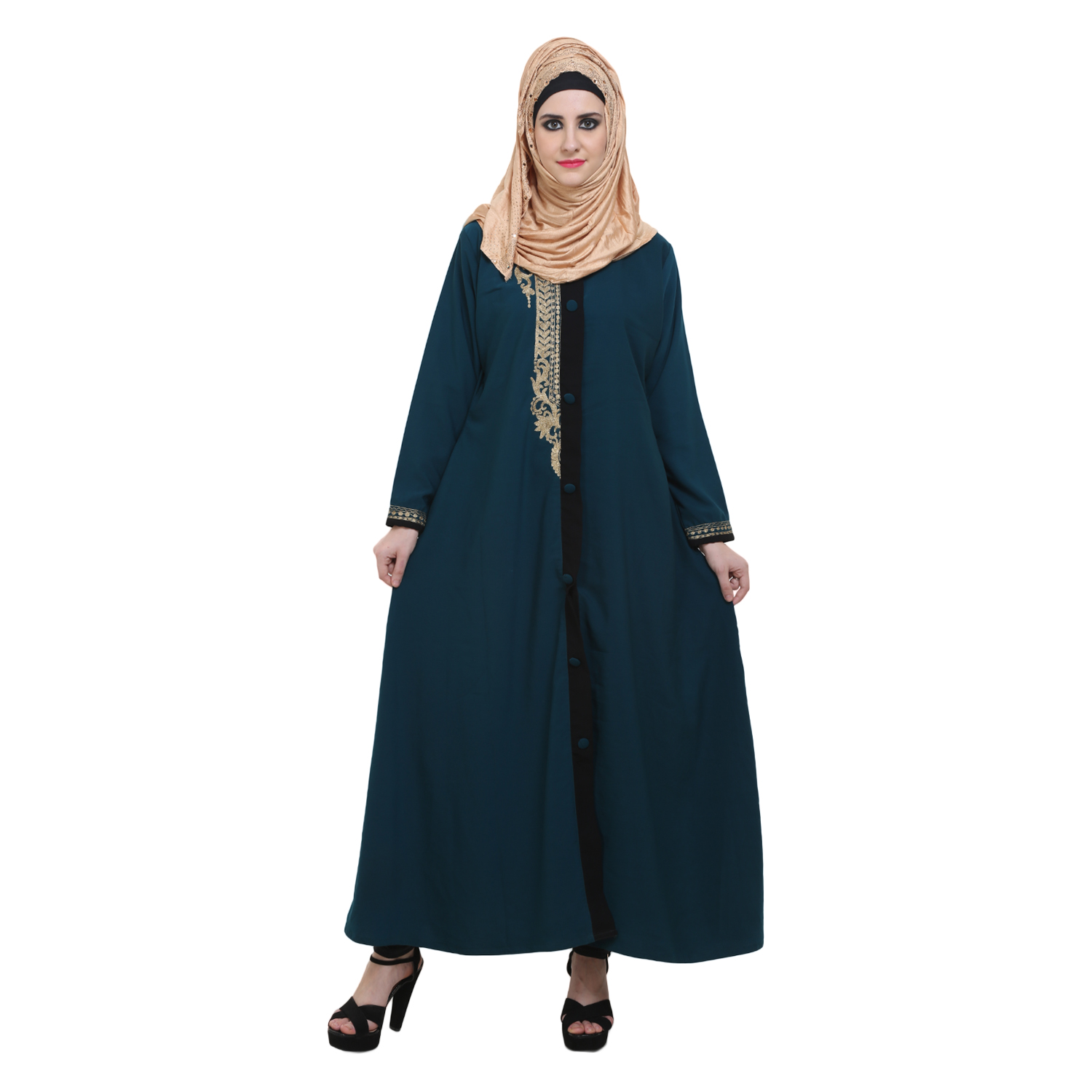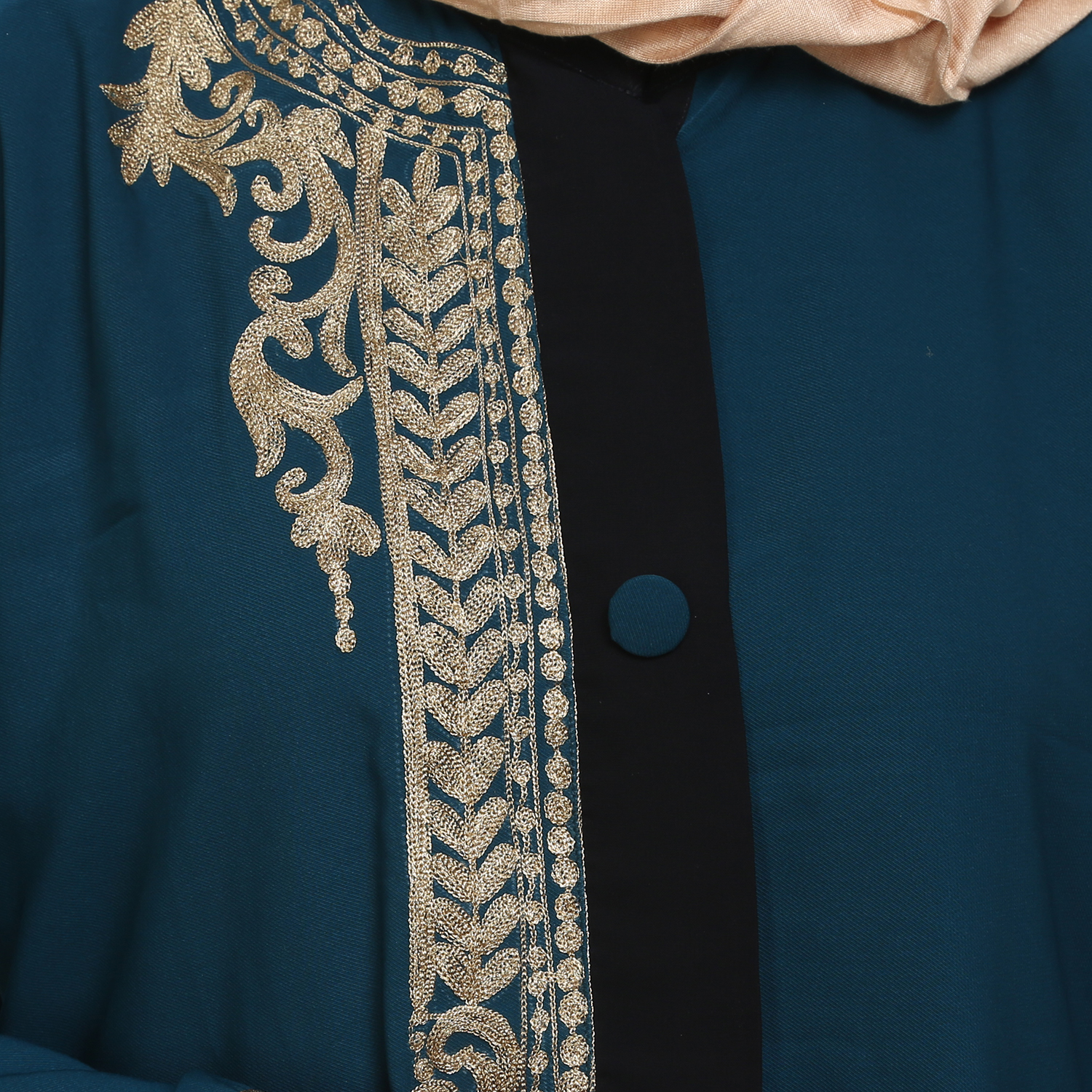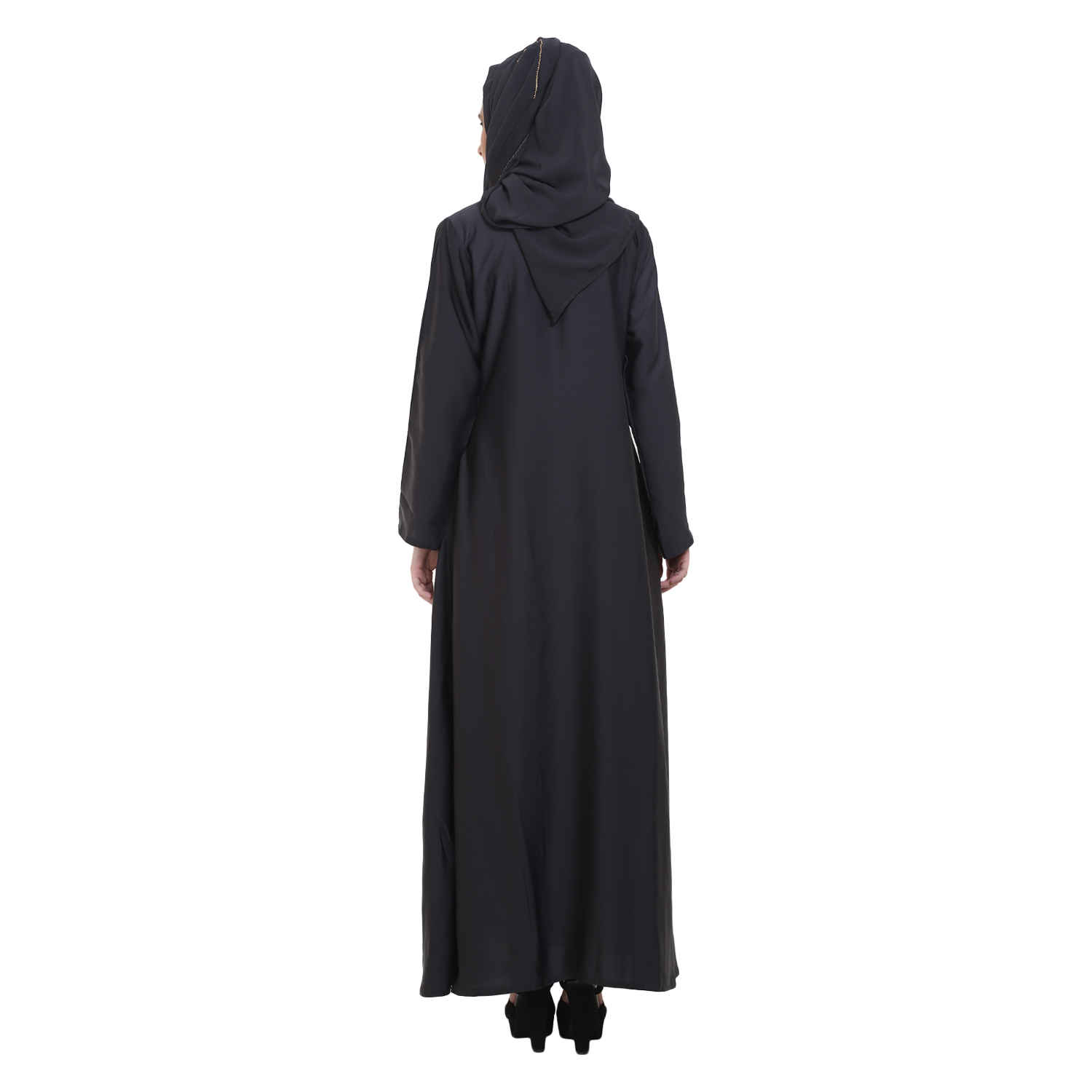 This abaya stands out for its refined color palette and artisanal touches. The deep grey hue serves as a contemporary alternative to traditional tones, allowing the zari embellishments to shine without overpowering your look. The hand-applied golden details add dimension and luminosity, creating a beautiful contrast that photographs elegantly in both natural daylight and indoor lighting.