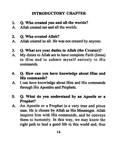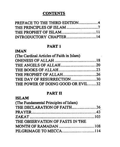 The necessity of the presentation of the elementary teachings of Islam, explaining its Cardinal Articles of Faith and the Fundamental Principles in the simplest possible English language is therefore, obvious, for such a publication would not only serve to acquaint the English-knowing new Muslims with the essentials of Faith and the directions for engaging in devotion to Allah, but also supply the long-felt need of a handy book for imparting the rudiments of Islam to the Muslim children of those countries where the English Language rules supreme and children are sent away to school using English as medium of instruction, without having any knowledge, whatsoever, of their religion.