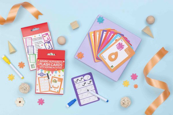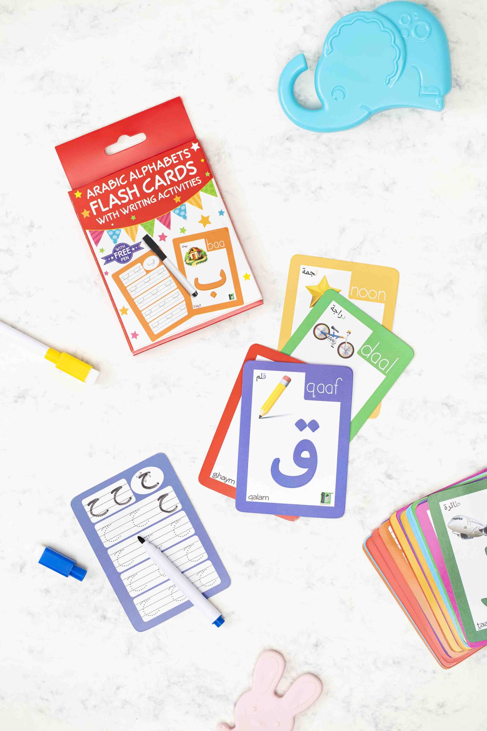 These 28 Colorful flash cards with box every card laminated in English/Arabic language. It will help to young children to learn Arabic Alphabet easily.