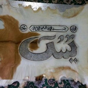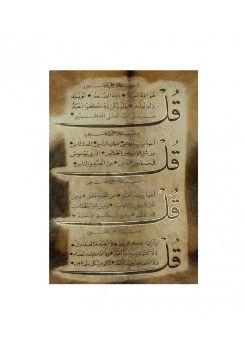 Infuse your home with the blessings of the Four Quls and exquisite Islamic art with this stunning Tughra on genuine goat skin! Measuring 32×22 inches, this captivating piece features the powerful verses of Surah Al-Ikhlas, Al-Falaq, An-Nas, and Al-Nasr, beautifully inscribed in intricate Tughra calligraphy.