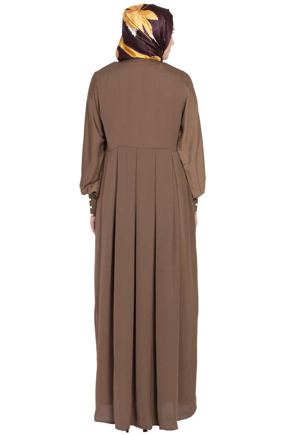 Elevate your wardrobe with a Front Open Abaya crafted from premium imported Nida—an exquisite fabric celebrated for its smooth drape, rich texture, and opaque coverage. Thoughtfully designed with elegant black patchwork and delicate black pearl accents, this abaya blends timeless modesty with modern sophistication. The button-down front makes dressing effortless and versatile, whether you’re heading to a bridal event, an evening gathering, or simply seeking an elegant everyday layer.