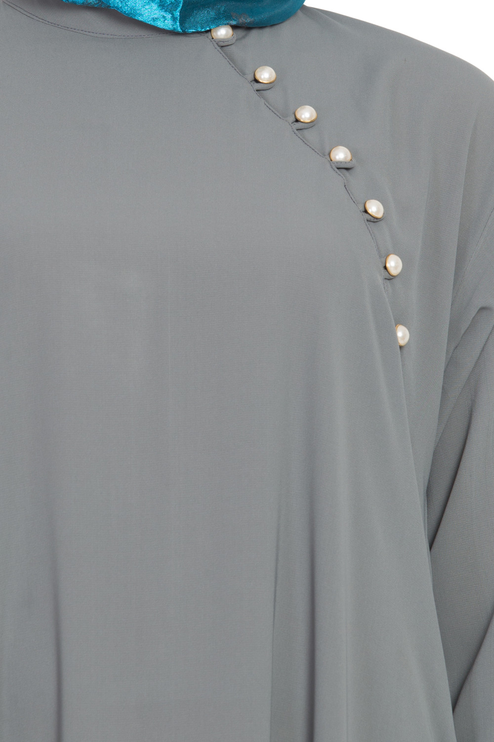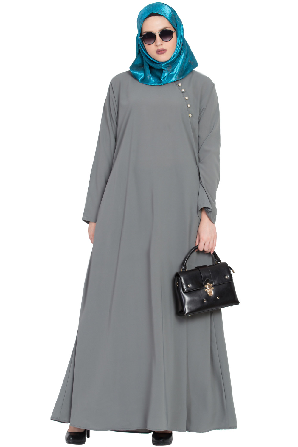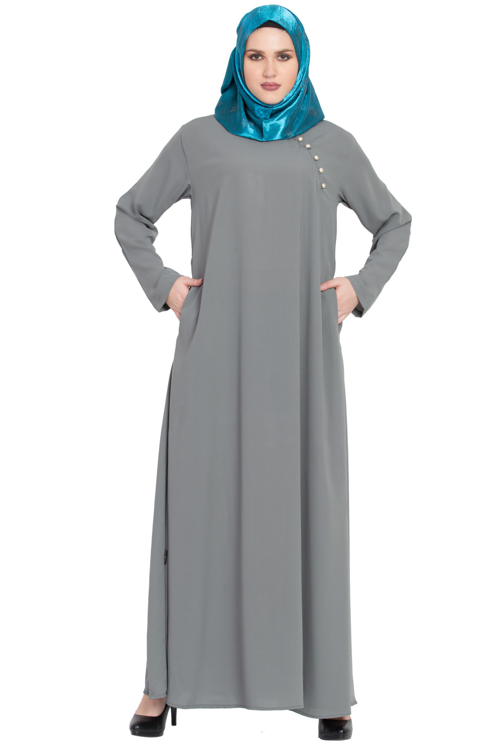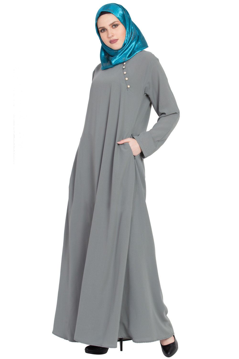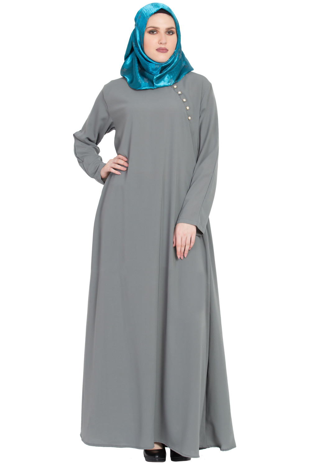 – Evening refinement: Elevate the Grey A-shaped Formal Abaya with a tonal scarf, heeled sandals, and delicate jewelry that echoes the pearl detailing.
