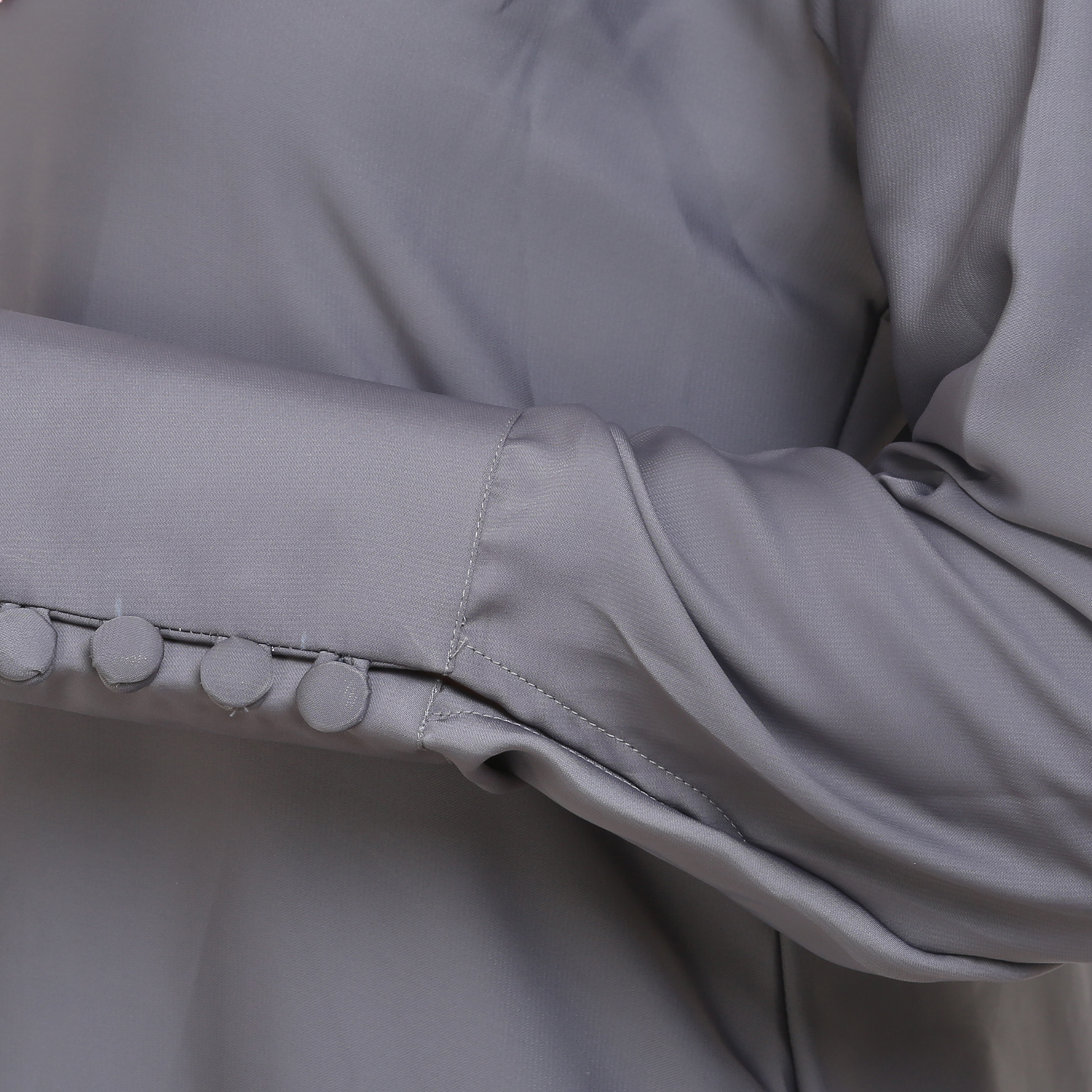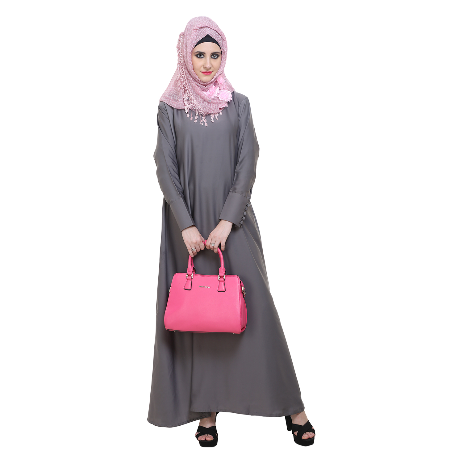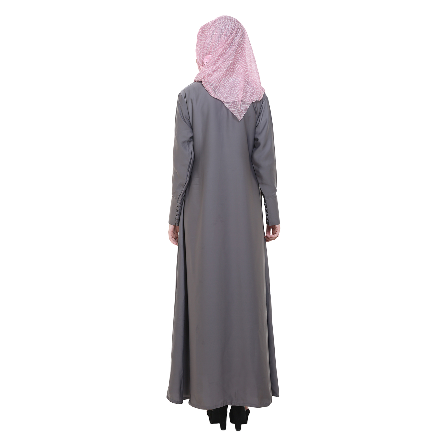 The A-shaped cut is universally flattering. It offers ease of movement while maintaining structure, making it a reliable choice for long days and formal moments alike. The sophisticated grey tone adds a contemporary edge—subtle enough for professional settings yet elegant for evening wear. With its front-open design, this abaya gives you styling flexibility: layer it over neutrals for a minimalist look or pair it with tonal pieces for a sleek, monochrome ensemble.