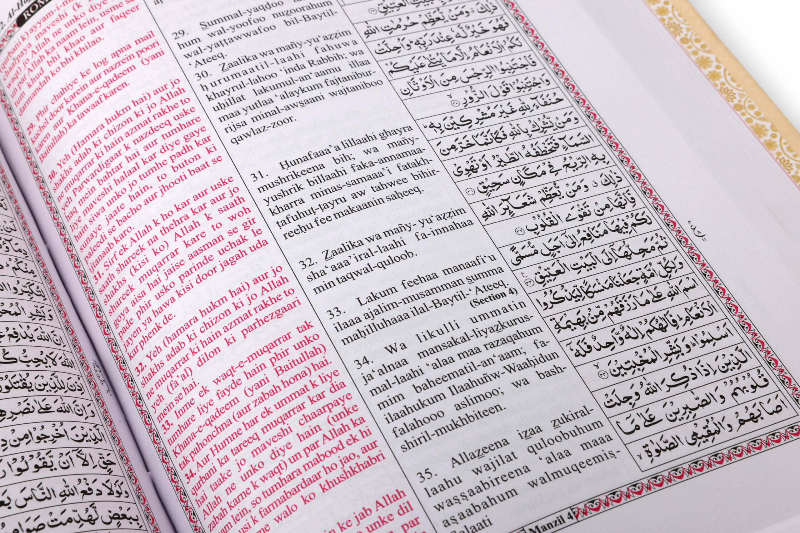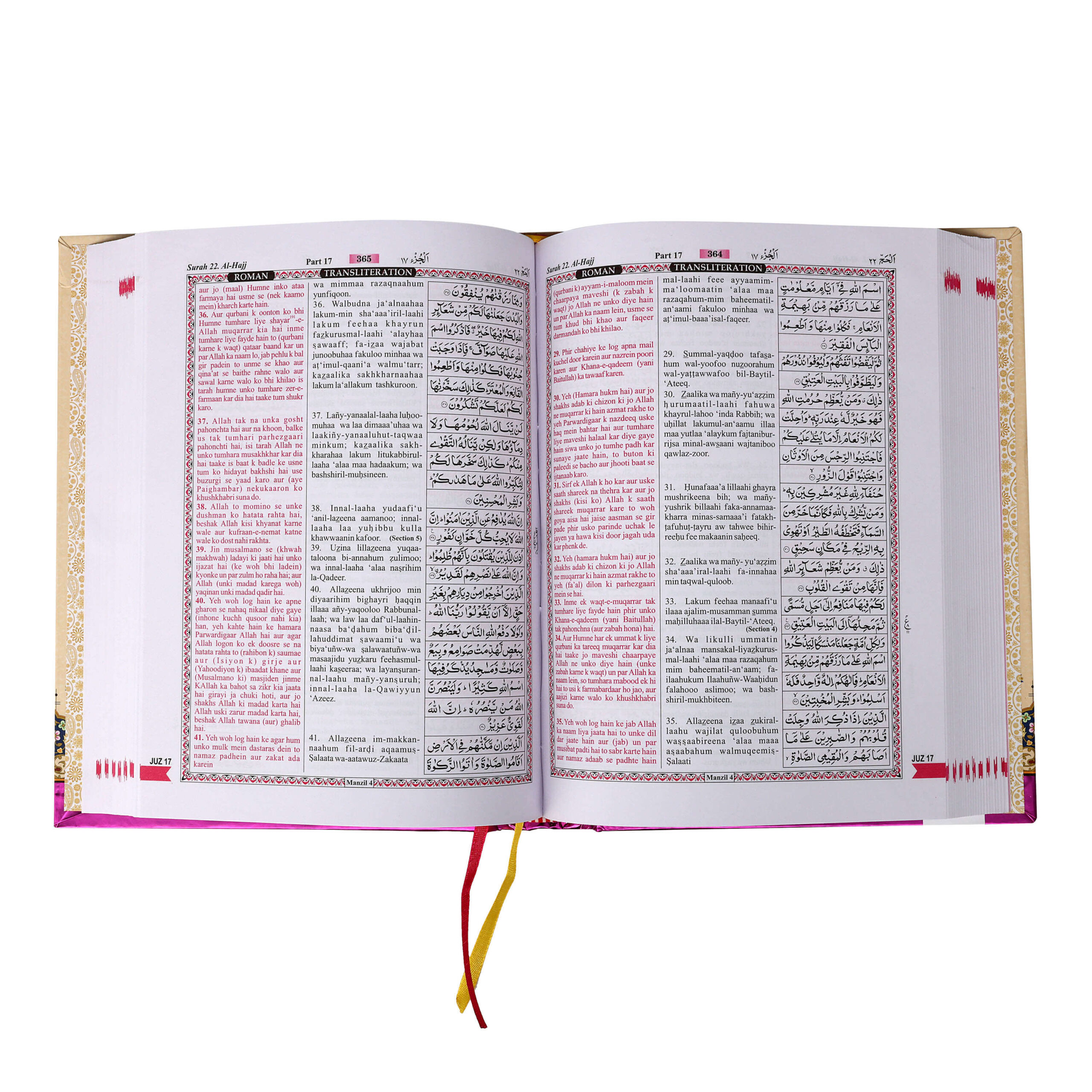 This Qura’n has Urdu Translation in Roman Script with English and Arabic text so the reader can easily understand the meaning.