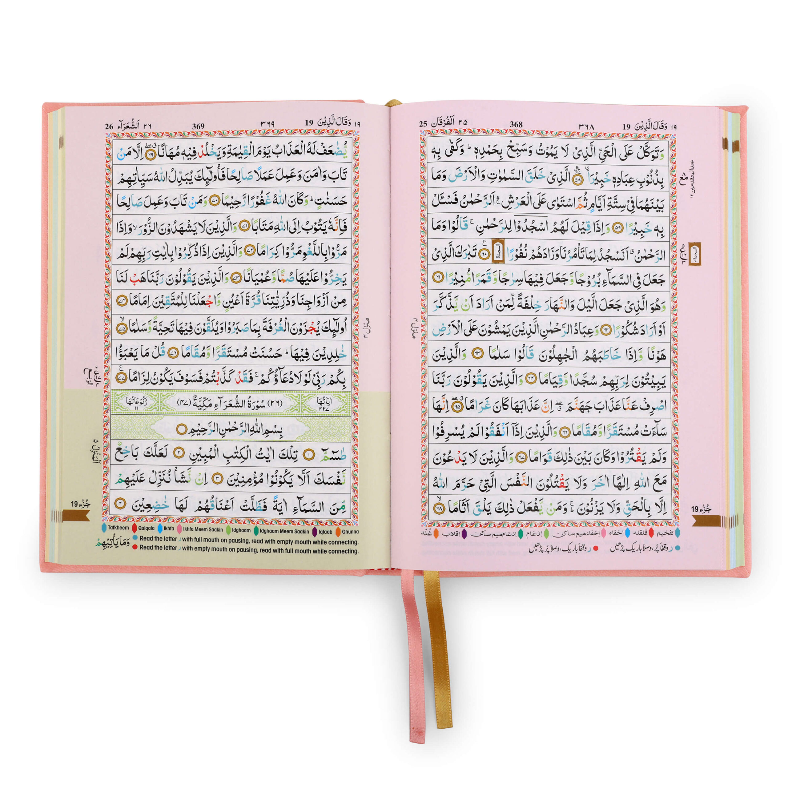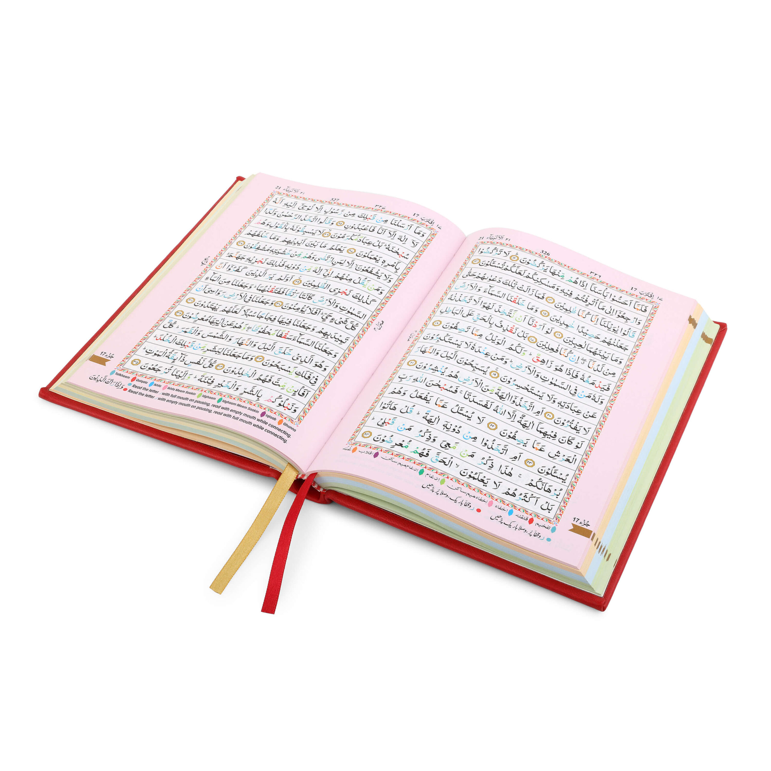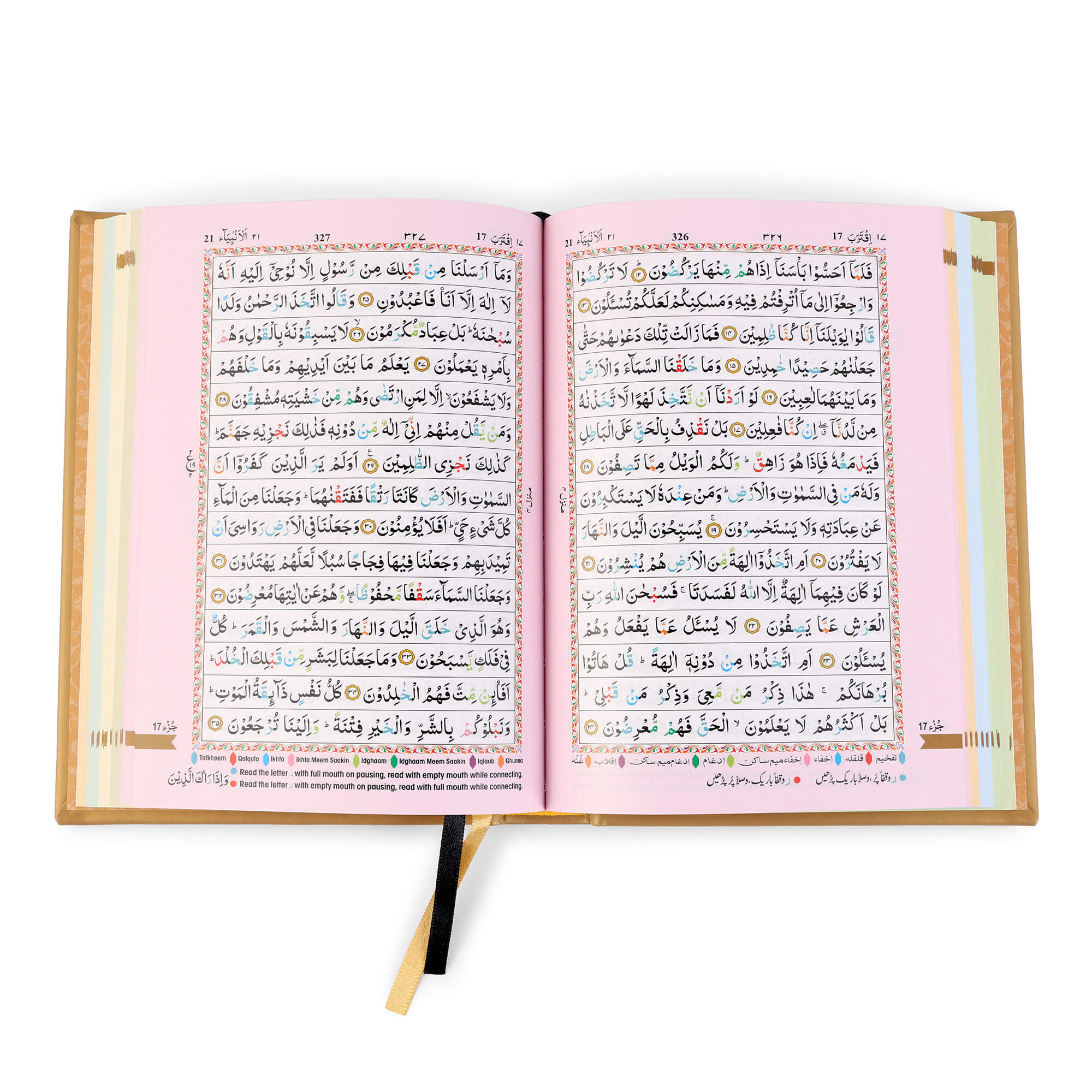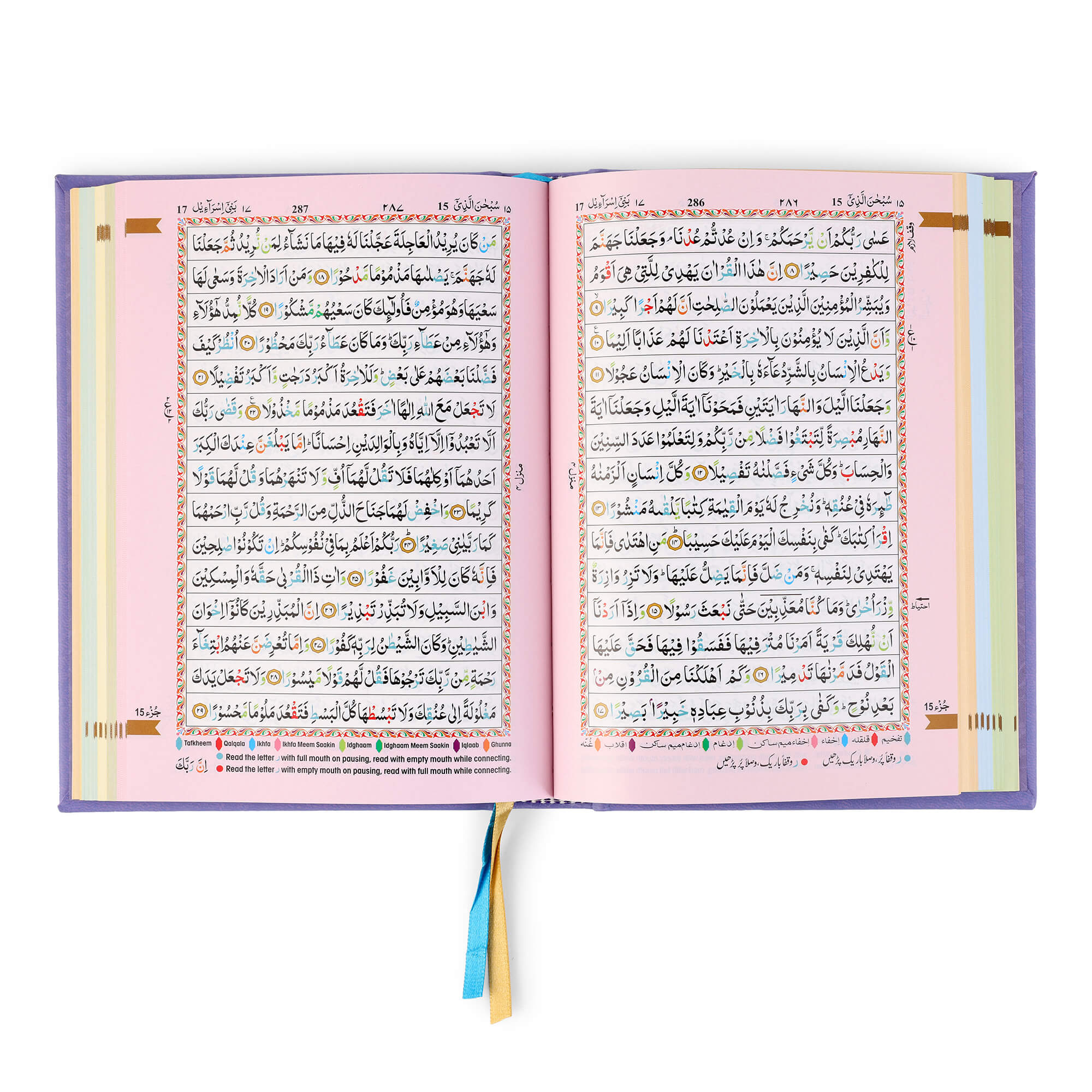 - Colour Coded Tajweed Rules to enhance pronunciation and fluency.