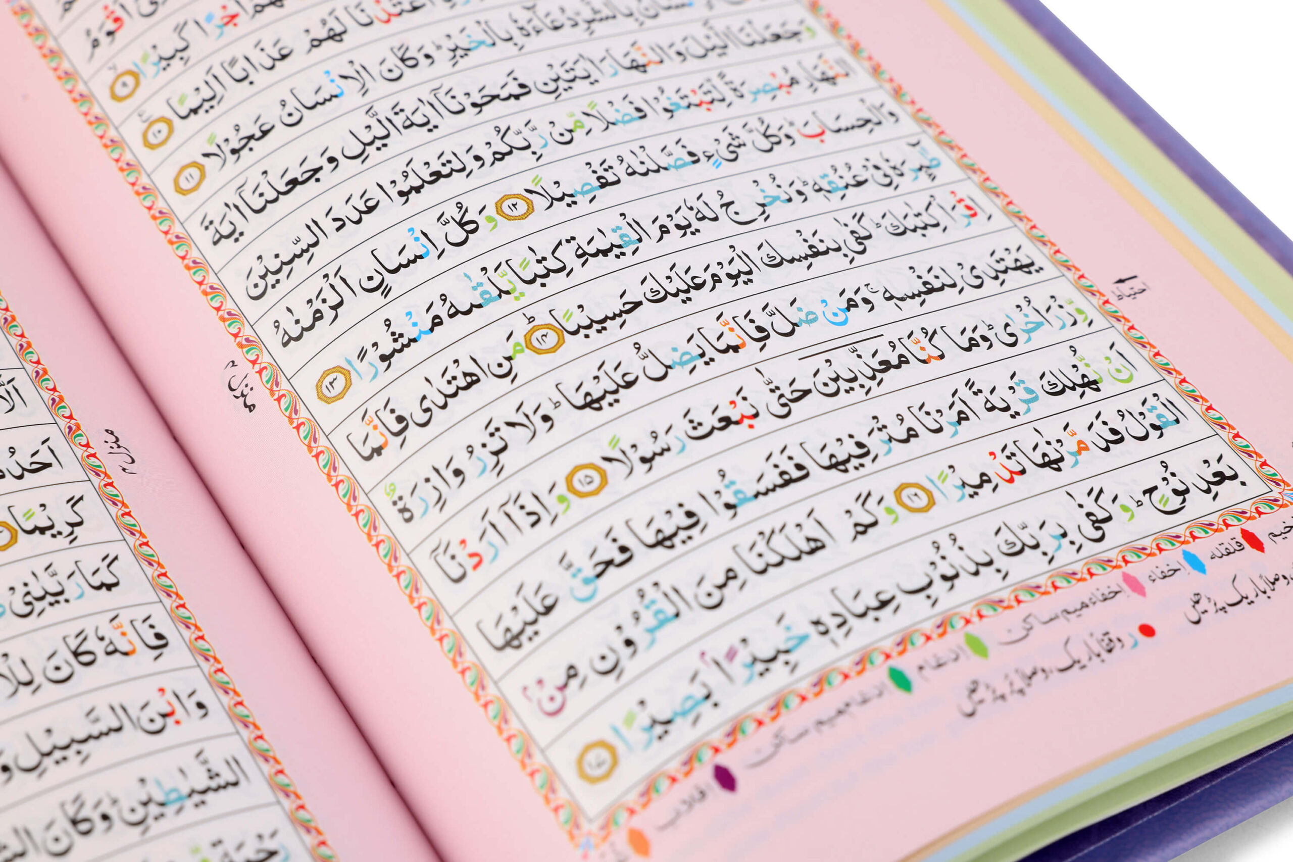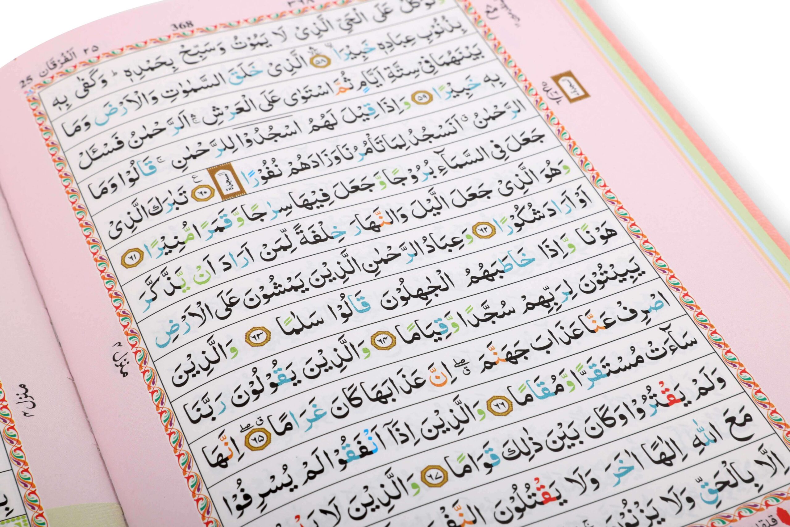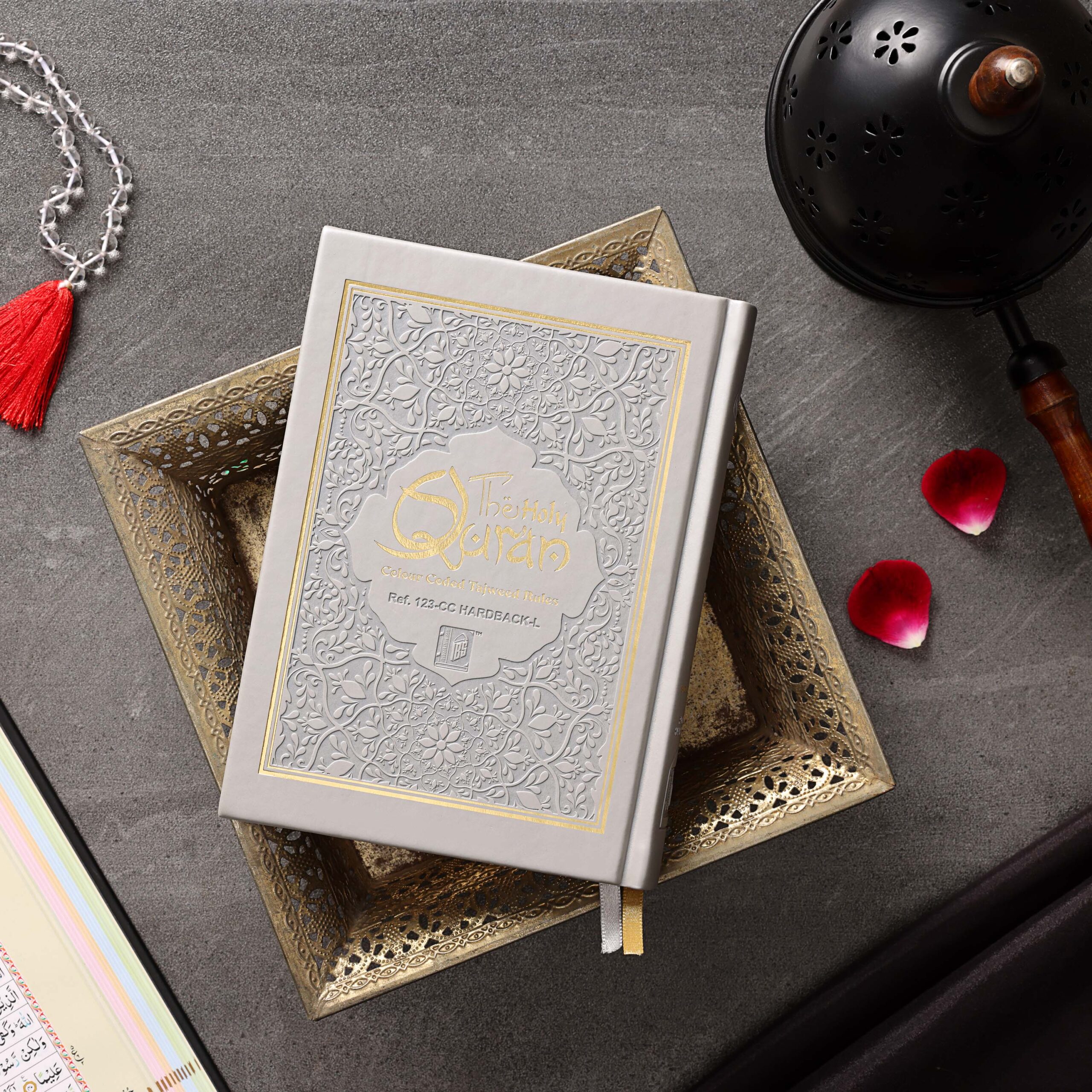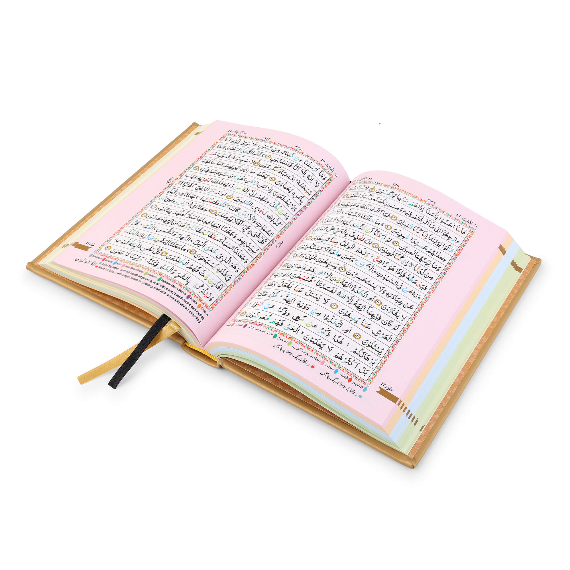 - Colour Coded Tajweed Rules to enhance pronunciation and fluency.