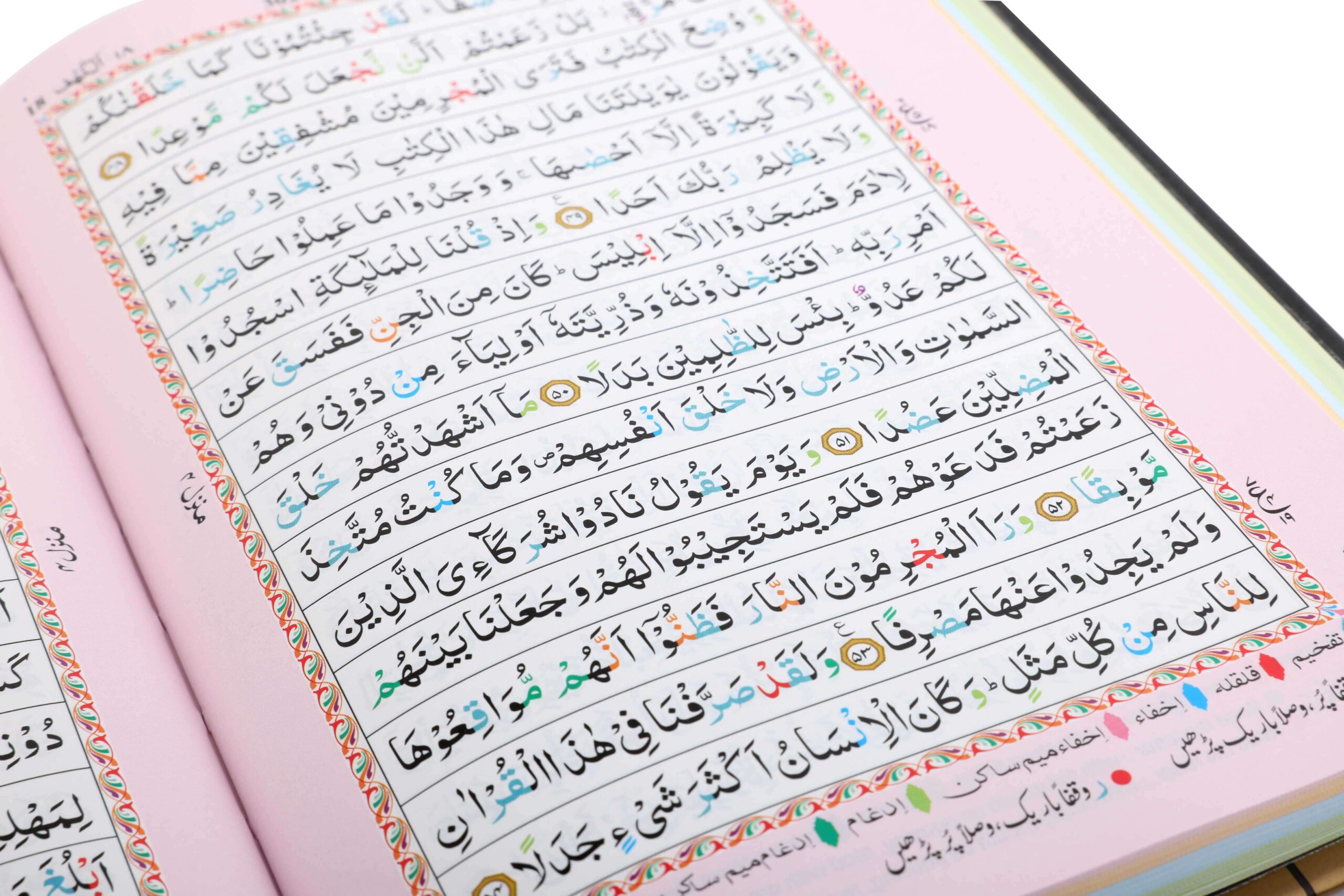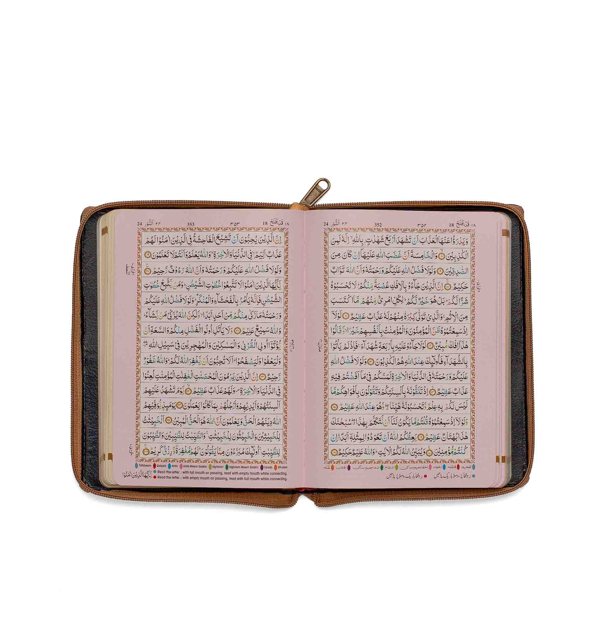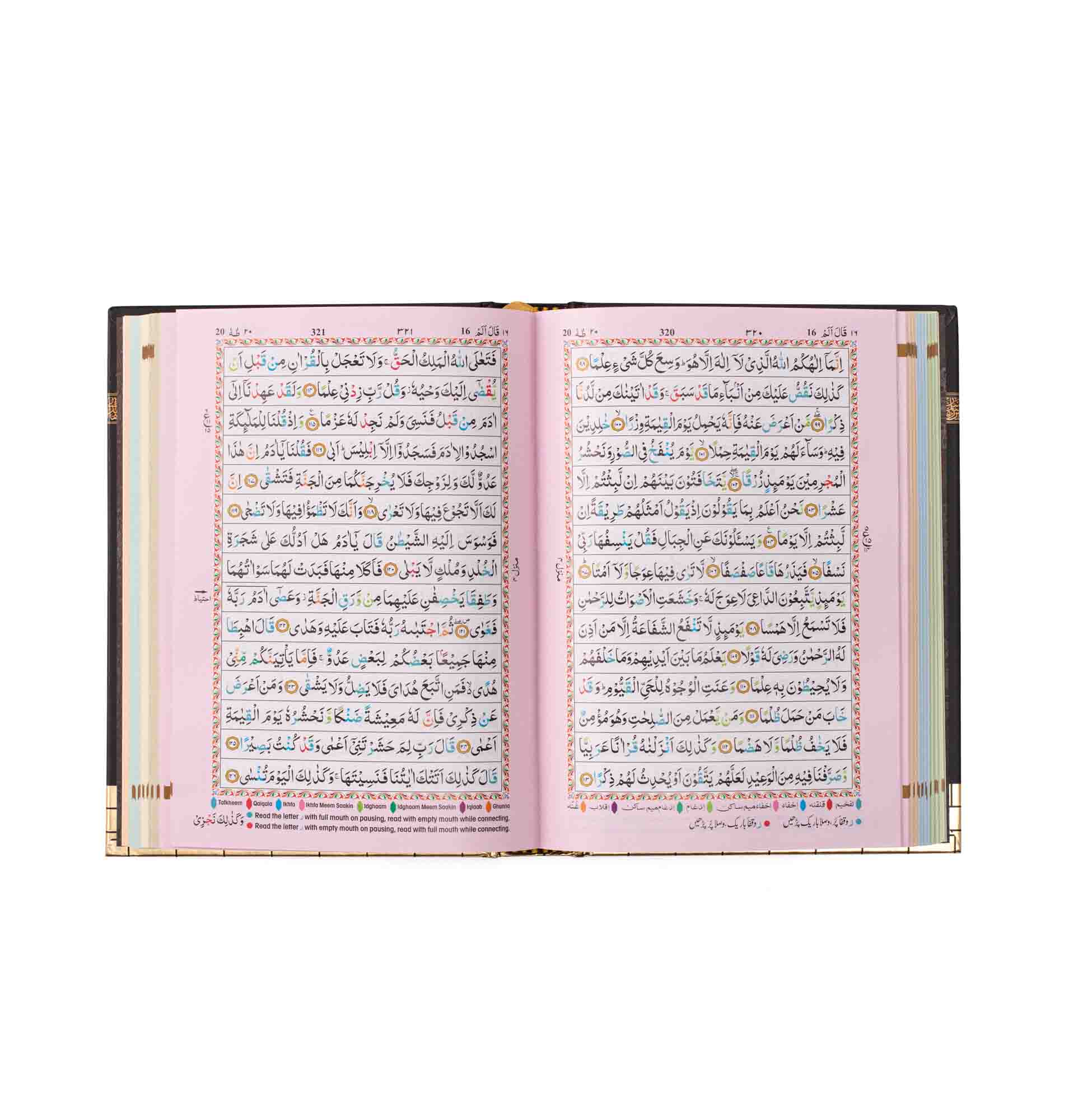 - Colour Coded Tajweed Rules to enhance pronunciation and fluency.