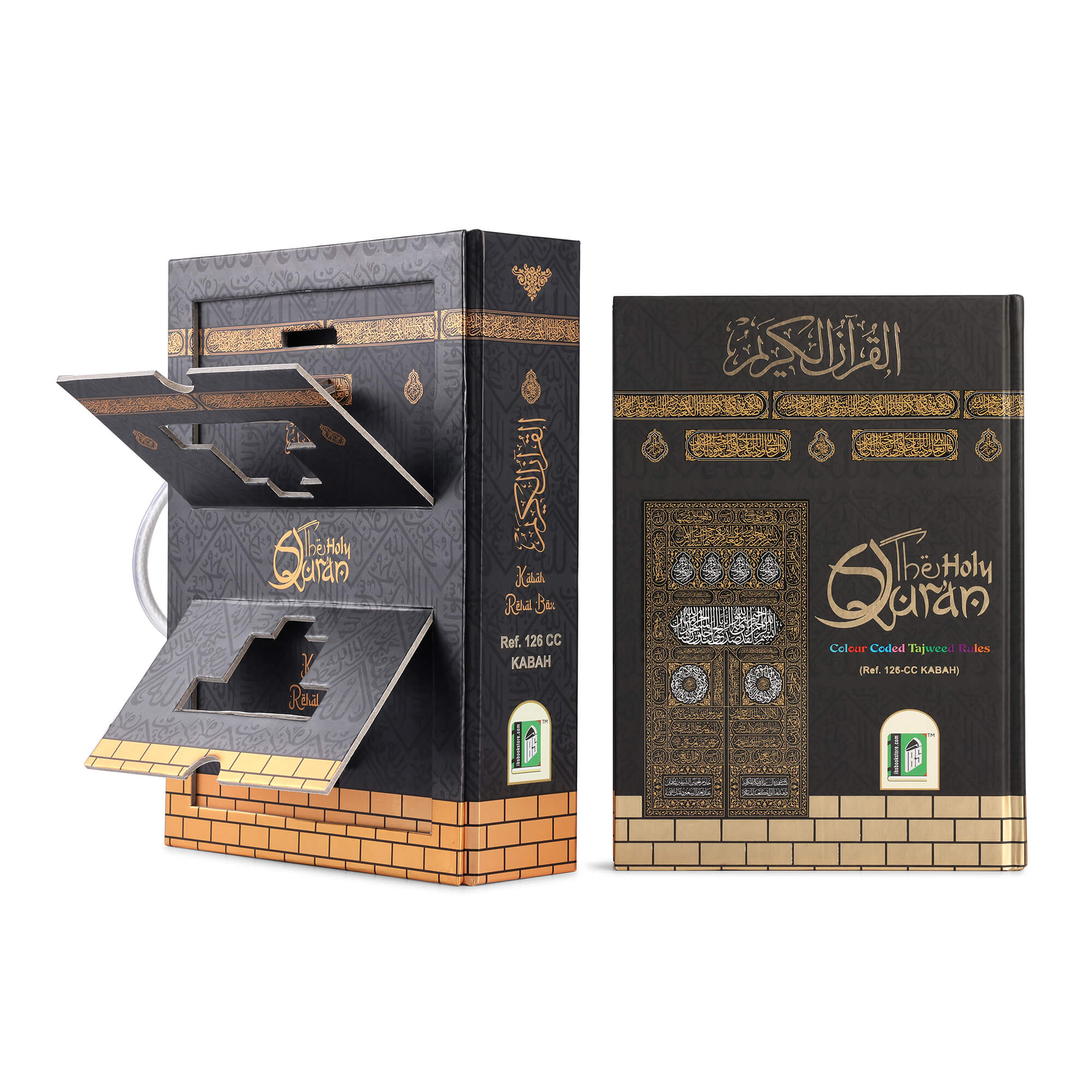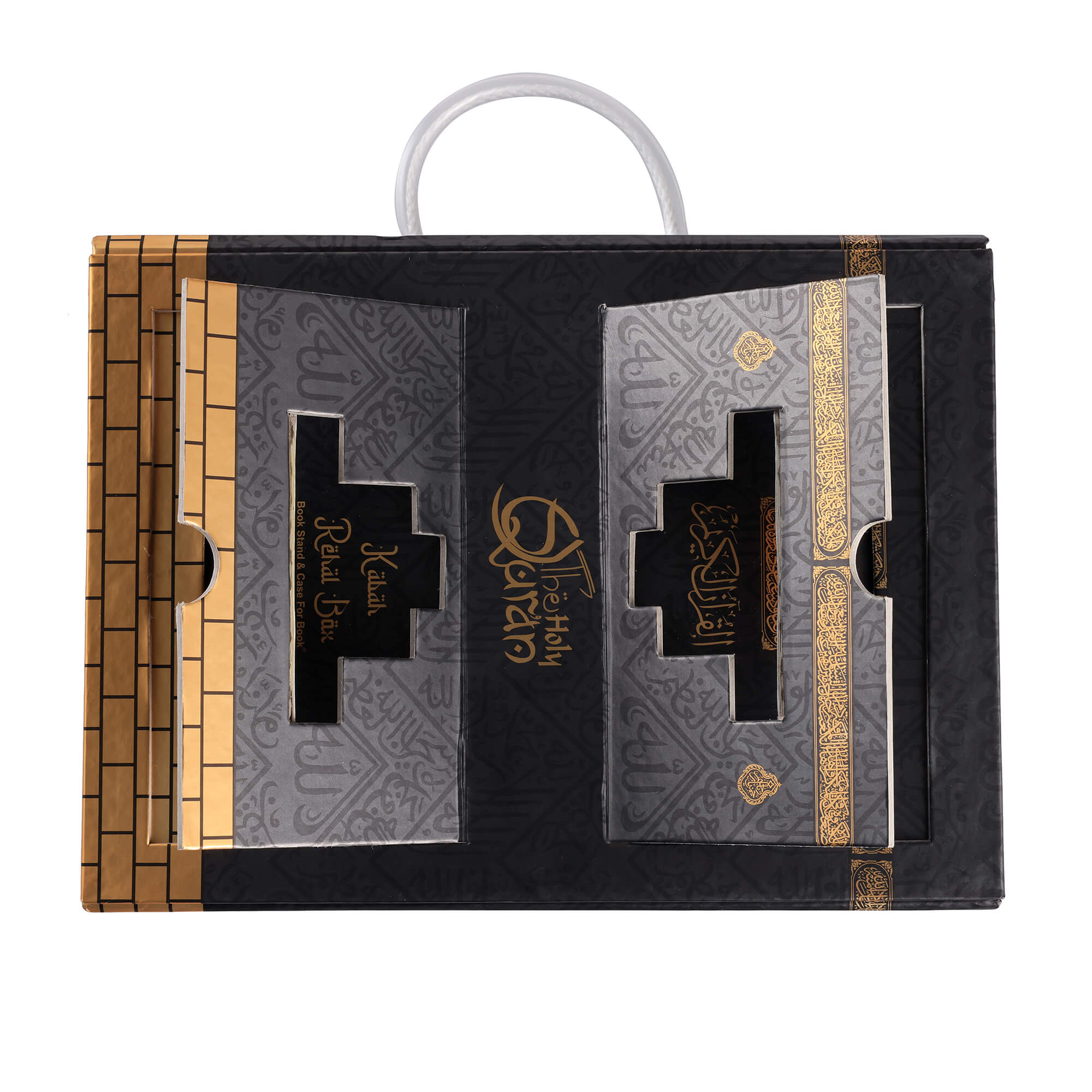 - 🕋Kabah Cover Hardbound with Kabah Rehal Box– A complete set with Kabah-themed cover foldable Kabah-style Rehal box stand