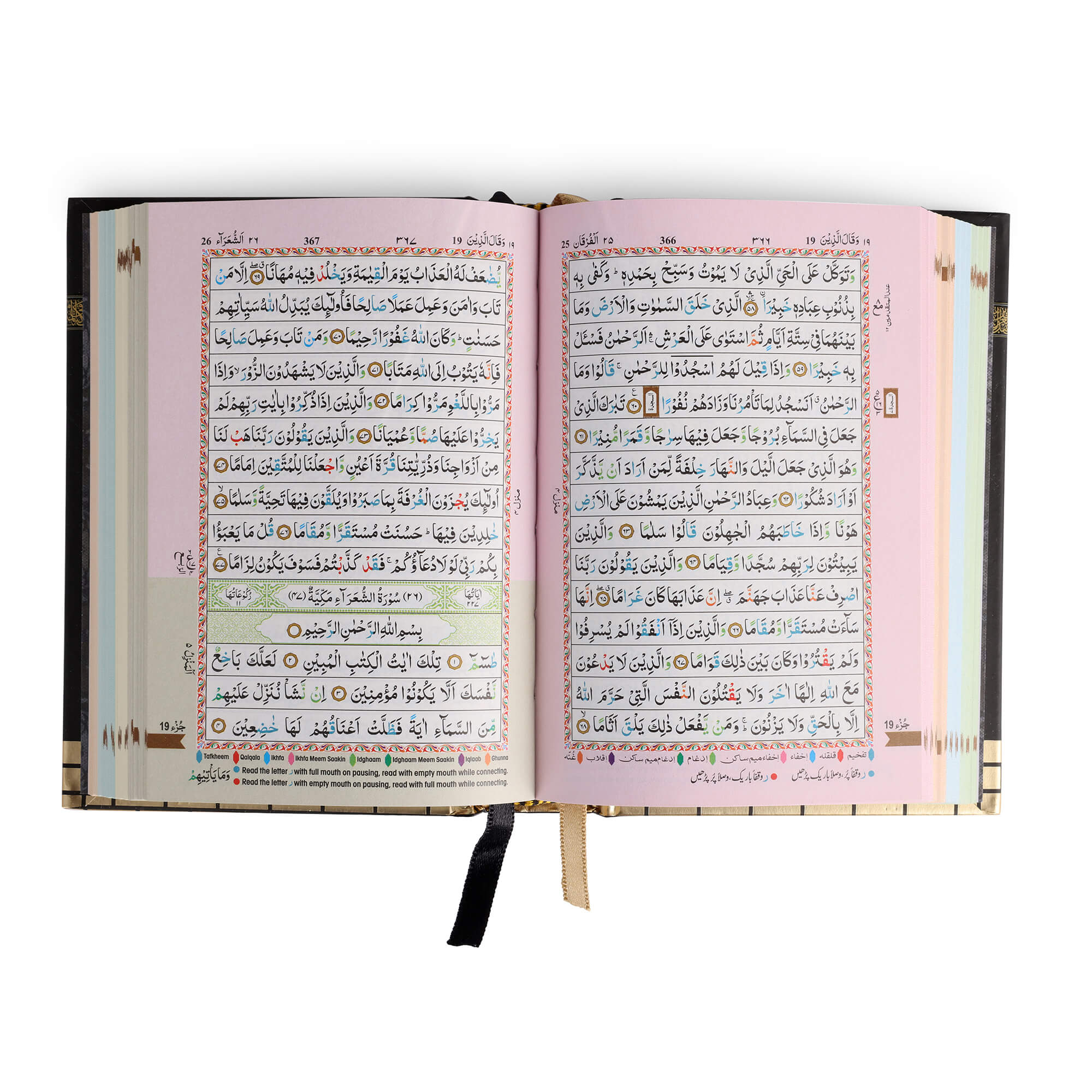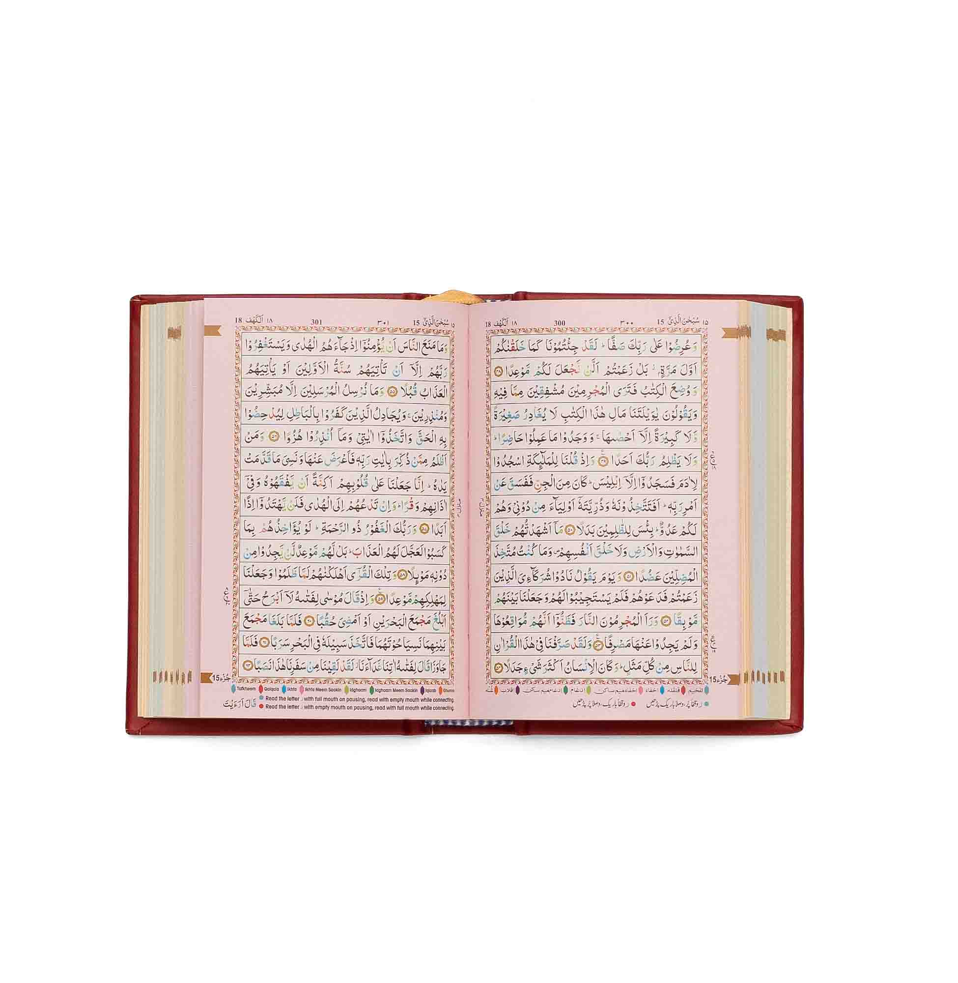 - Colour Coded Tajweed Rules to enhance pronunciation and fluency.