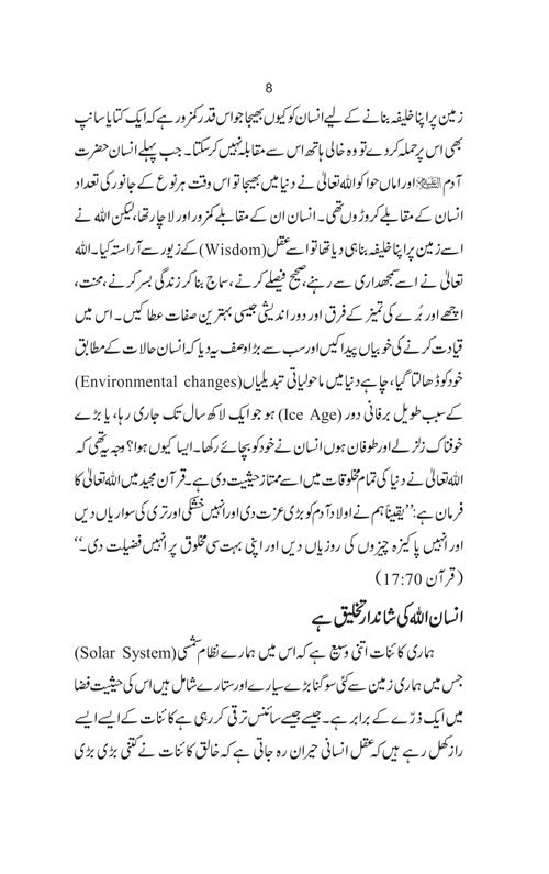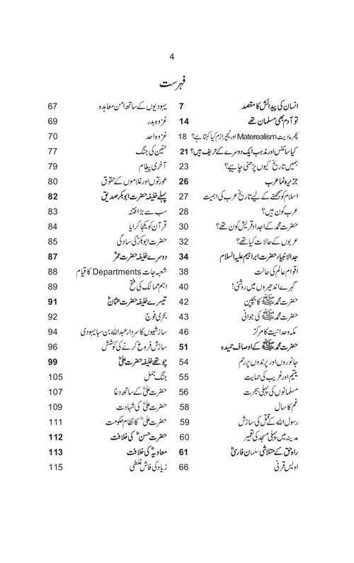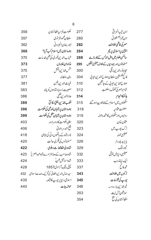 This is a unique book on Islamic History which starts from Adam(A.S) and go through the middle ages and ends 1899. The book has pictures and photographs of important Islamic places,rulers,scholars,scientists,buildings and maps. For readers’ convenience, the soler calender is used besides Islamic dates.