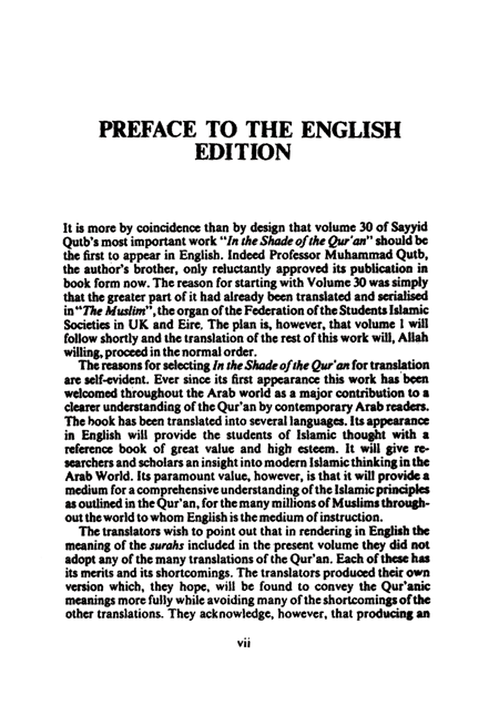 Despite the hard work that has been put into this translation of Sayyid Qutb’s work, this English edition is nowhere near the Arabic original for excellence of style and perfection of expression. Whatever shortcomings this edition suffers from, the translators acknowledge as their own. The Author Name(s) is in no way responsible for them. But those who have had some experience in translation, and in the translation of Islamic texts in particular, recognise the difficulty of the task we have undertaken and will acknowledge that, humble as it may be, the result, in some measure, serves the purpose.