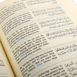 The verses of surahs have been indicated by starting a new line for each verse. Verses, however, do not start with a capital letter except where a verse begins a new sentence. If a verse runs in more than one line the continuity is indicated by giving the second line a wider margin. This arrangement has been followed so as to avoid giving any impression of similarity between the Qur’an and poetry.
