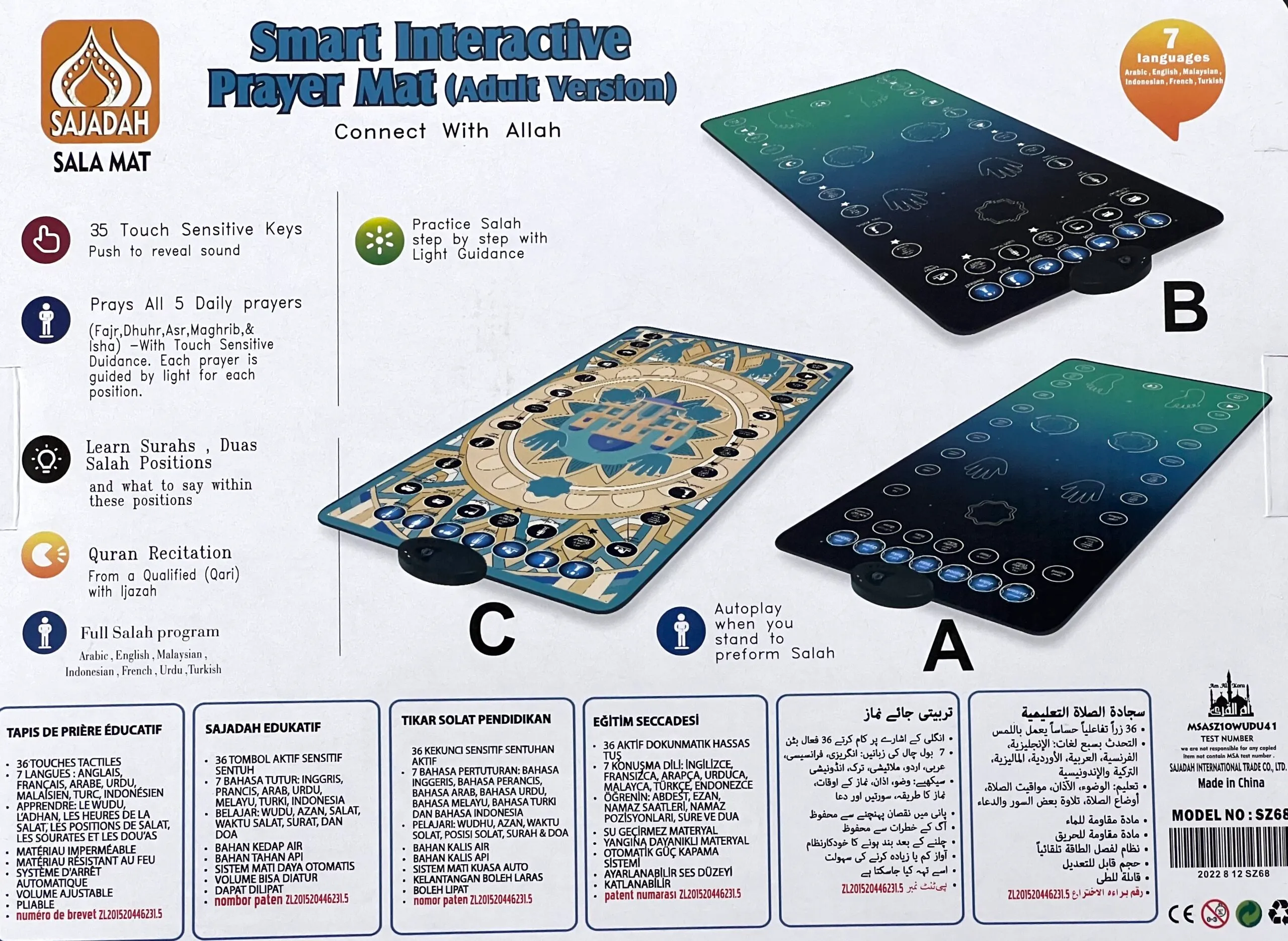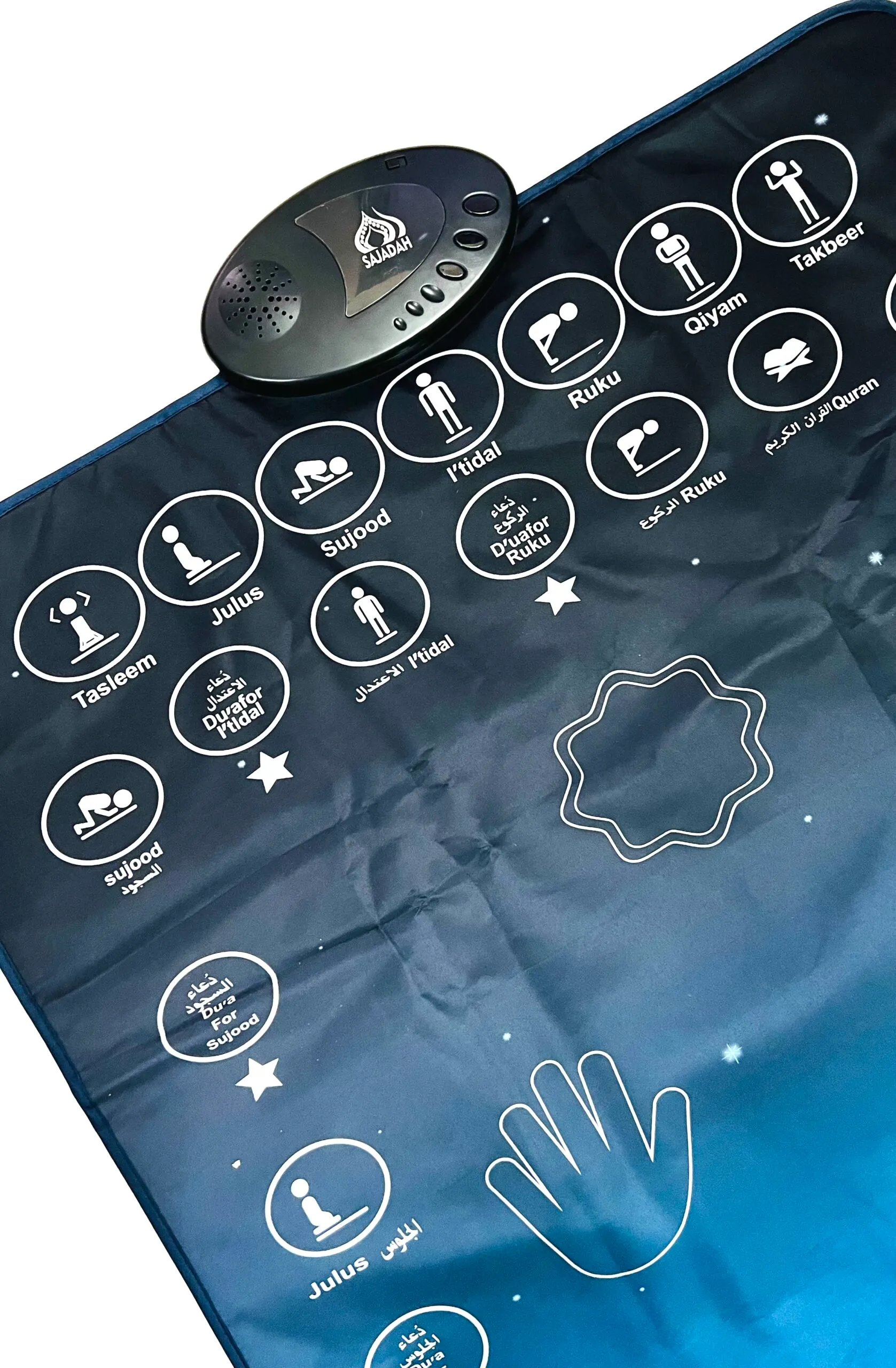 The Interactive Smart Salah Mat by Sajadah International features 35 touch-sensitive keys and light guidance, enabling you to follow along as you learn Salah step by step. With recitations of Surahs, Adhan, and Duas by a qualified Qari with Ijazah, this mat offers an authentic and enriching spiritual experience.