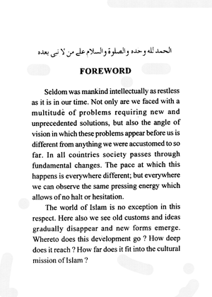 Seldom was mankind intellectually as restless as it is in our time. Not only are we faced with a multitude of problems requiring new and unprecedented solutions, but also the angle of vision in which these problems appear before us is different from anything we were aCCustomed to so far. In all countries society passes through fundamental changes. The pace at which this happens is everywhere different; but everywhere we can observe the same pressing energy which allows of no halt or hesitation. The world of Islam is no exception in this respect. Here also we see old customs and ideas gradually disappear and new forms emerge. Whereto does this development go? How deep does it reach? How far does it fit into the cultural mission of lslam? This book has no pretension to giving an exhaustive answer to all these questions. Owing to its limited space only one of the problems facing the Muslims today, namely, the attitude they should adopt towards Western civilization has been selected for discussion. The vast implications of the subject, however, made it necessary to extend our scrutiny over some basic aspects of Islam, more particularly with regard to the principle of Sunnah. It was impossible to give here more than the bare outline of theme wide enough to fill many bulky volumes. But nonetheless–or, perhaps, therefore I feel confident that this brief sketch will prove, for others, an incentive to further thought on this most important problem. And now about myself because the Muslims have a right, when a convert speaks to diem, to know how and why he has embraced Islam. In 1922 I left my native country, Austria, to travel through Africa and Asia as a Special Correspondent to some of the leading Continental newspapers, and spent from that year onward nearly the whole of my time in the Islamic East. My interest in the nations with which I came into contact was in the beginning that of an outsider only. I saw before me a social order and an outlook on life fundamentally different from the European, and from the very first there grew in me a sympathy for the more tranquil I should rather say, more human-conception of life, as compared with the hasty, mechanized mode of living in Europe. This sympathy gradually led me to an investigation of the reasons for such a difference, and I became interested in the religious teachings of the Muslims. At the time in question, that interest was not strong enough to draw me into the fold of lslam, but it opened to me a new vista of a progressive human society, Organised with a minimum of internal conflicts and a maximum of real brotherly feeling. The reality, however, of present day Muslim life appeared to be very far from the ideal possibilities given in the religious teachings of Islam. Whatever, in Islam, had been progress and movement, had turned, among the Muslims, into indolence and stagnation, whatever there had been of generosity and readiness for self-sacrifice had become among the present day Muslims, perverted into narrow-mindedness and love off easy life. Prompted by the discovery and puzzled by the obvious incongruence between Once and Now, I tried to approach the problem before me from a more intimate point of view that is, I tried to imagine myself as being within the circle of lslam. It was a purely intellectual experiment , and it revealed to me, within a very short time, the right solution. I realised that the one and only reason for the social and cultural decay of the Muslims consisted in the fact that they had gradually ceased to follow the teachings of lslam in spirit. Islam was still there, but it was a body without soul. The very element which once had stood for the strength of the Muslim world was now responsible for its weakness , Islamic society had been built, from the very outset, on religious foundations alone, and the weakening of the foundations has necessarily weakened the cultural structure and possibly might cause its ultimate disappearance immensely practical the teachings of lslam are, the more eager became my questioning as to why the Muslims had abandoned their full application to real life. I discussed this problem with many thinking Muslims in almost all the countries between the Lybian Desert and the Pamirs, between the Bosphorus and the Arabian Sea. It almost became an obsession which ultimately overshadowed all my other intellectual interests in the world of lslam. The questioning steadily grew in an emphasis until I, a non-Muslim, talked to Muslims as if I were to defend Islam from their negligence and indolence. The progress was imperceptible to me, until one day it was in autumn 1925, in the mountains of Afghanistan a young provincial Governor said to me : But you are a Muslim, only you don’t know it yourself. I was struck by these words and remained silent. But when I came back to Europe once again, in 1926, I saw that the only logical consequence of my attitude was to embrace Islam. So much about the circumstances of my becoming a Muslim. Since then I was asked, time and again : Why did you embrace Islam? What was it that attracted you particularly? and I must confess : don’t know of any satisfactory answer. It was not any particular teaching that attracted me, but the whole wonderful, inexplicably coherent structure of moral teaching and practical life-programme. I could not say, even now, Which aspect of it appeals to me more than any other. Islam appears to me like a perfect work of architecture. All its parts are harmoniously conceived to complement and support each other, nothing is superfluous and nothing lacking, with the result of an absolute balance and solid composure. Probably this feeling that everything in the teachings and postulates of Islam is in its proper place. Has created the strongest impression on me. There might have been, along with it, other impressions s also which today it is difficult for me to analyse. After all, it was a matter of love , and love is composed of many things : 