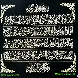 Enhance your home decor with this premium Islamic wall fabric featuring intricate embroidery of Ayat al-Kursi in white thread on black cloth. Installation in a wall frame is required by the customer. Order now for a touch of elegance and spirituality.