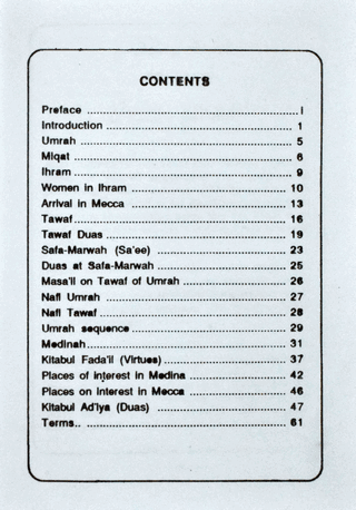 This booklet is intended as a simple and straightforward guide for people going on Umrah. Although many detailed books are available, the prospective Mu’tamir (one performing Umrah) is strongly advised to master certain basic aspects before going into detailed matter and discussion. Another aim of this booklet is to make the prospective Mu’tamir independent of guides and their assistants. lbadat per formed by one’s self With a little understanding is far more satisfying than any impressive exercise performed by third parties.