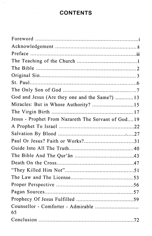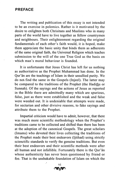 The writing and publication of this essay is not intended to be an exercise in polemics. Rather is it motivated by the desire to enlighten both Christians and Muslims who in many parts of the world have to live together as fellow countrymen and neighbours. Their enlightenment regarding the original fundamentals of each other’s faith would, it is hoped, make them appreciate the basic unity that binds them as adherents of the same original faith, the Universal Religion which teaches submission to the will of the one True God as the basis on which man’s moral behaviour is founded.