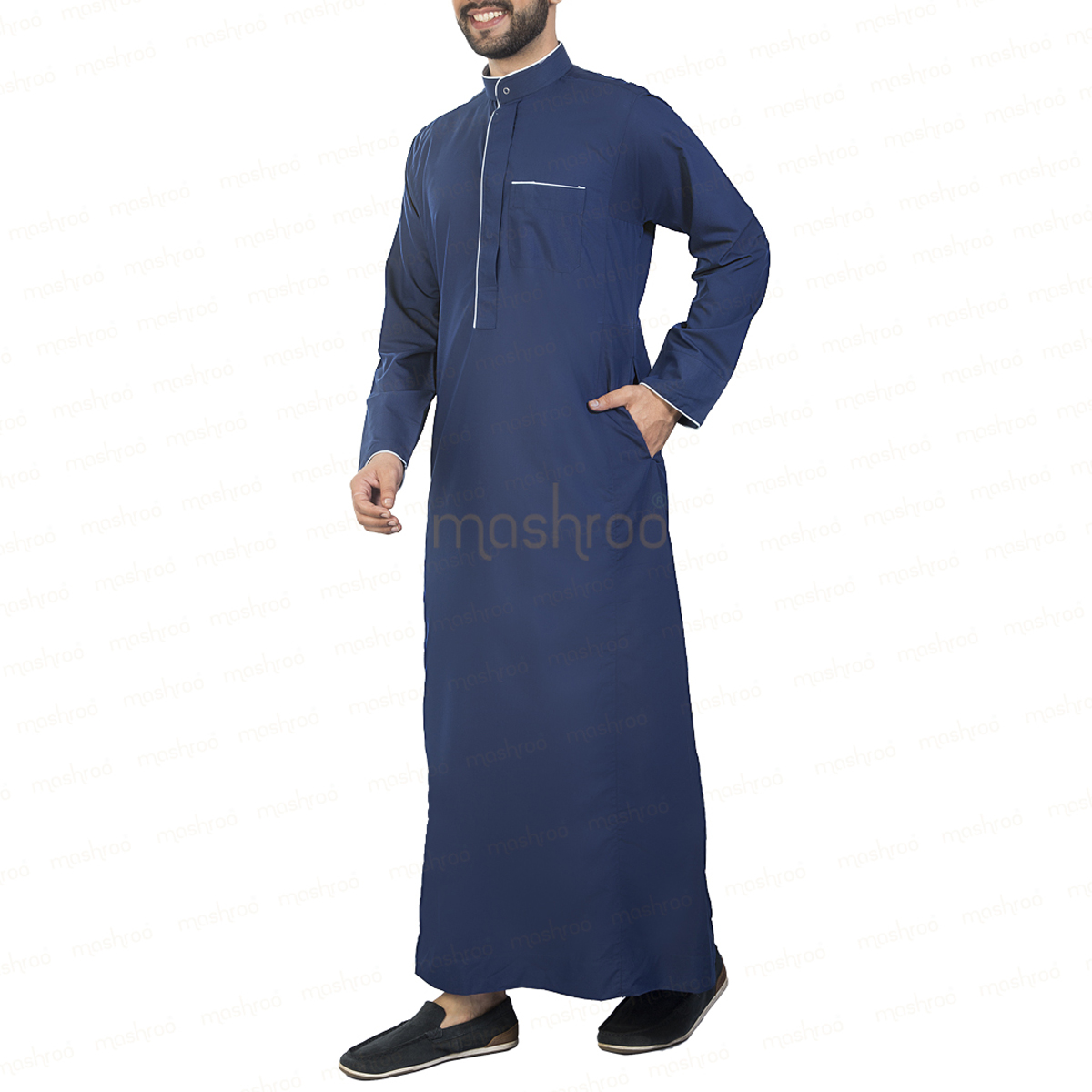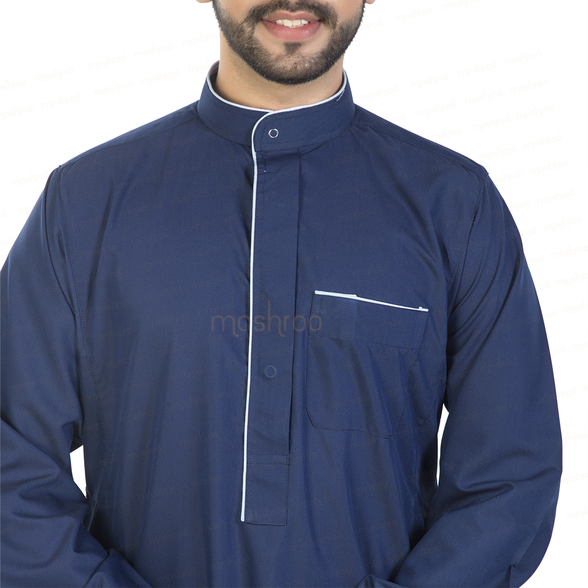 Dipped in sky blue details over the tidy navy blue design, Ashfak Thobe is tailored using 100% cotton and is a commendable blend of class and casual appearance. With its quality fabric and distinct selection of colors, the designer thobe proves to be an unmatched attire for casual outings and semi-formal gatherings.