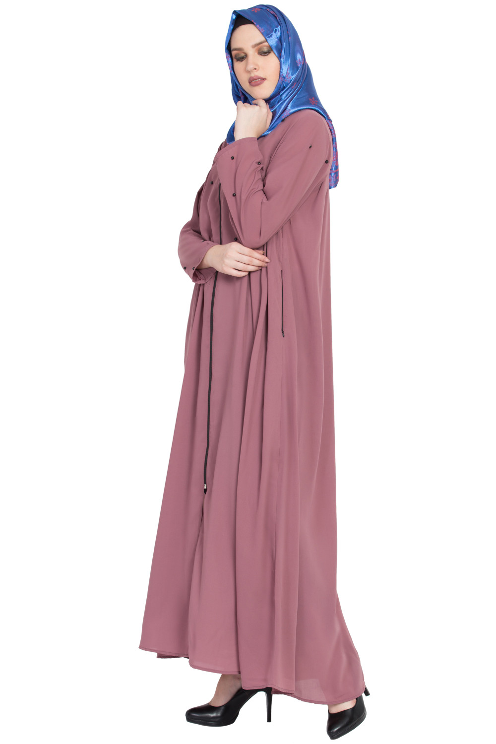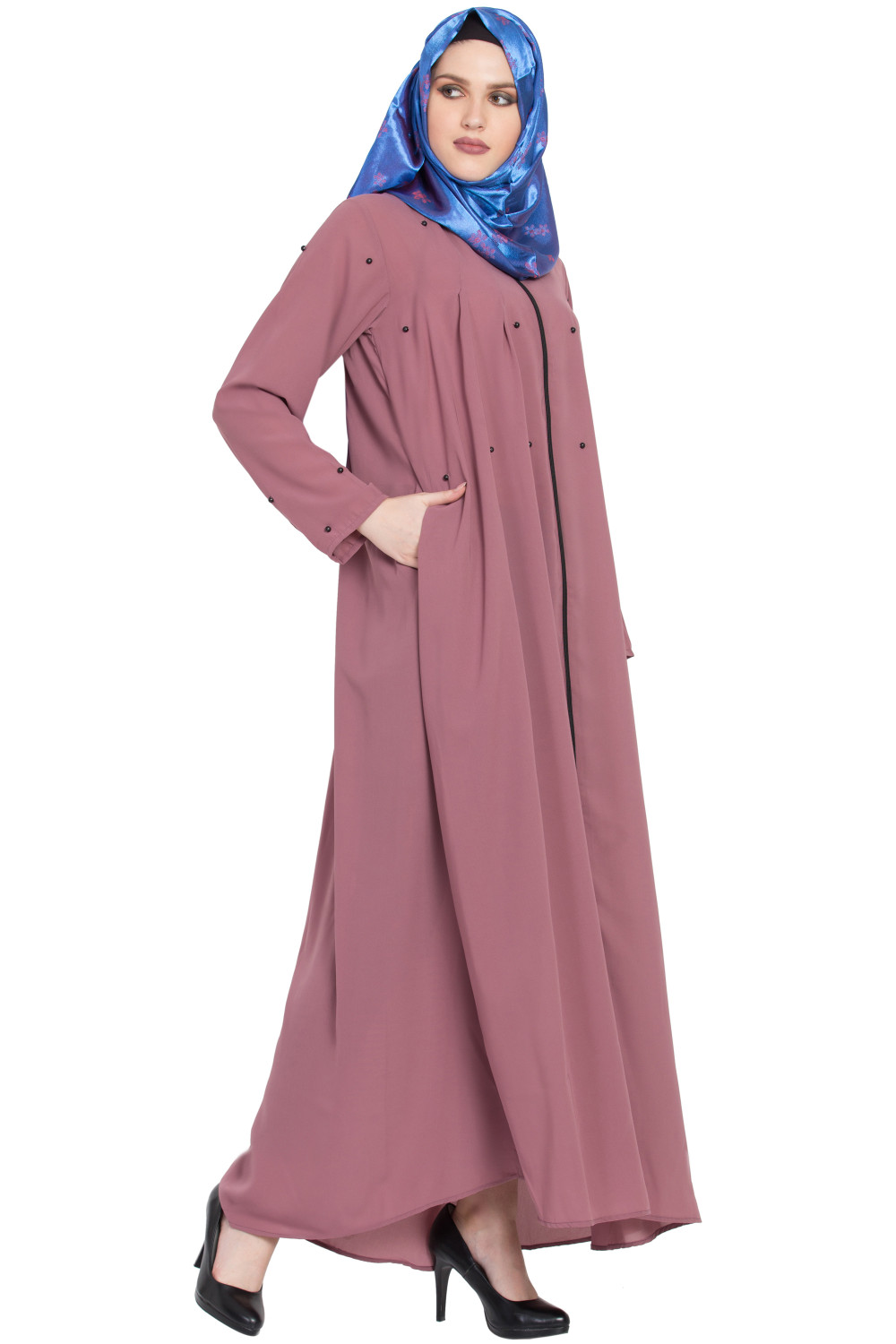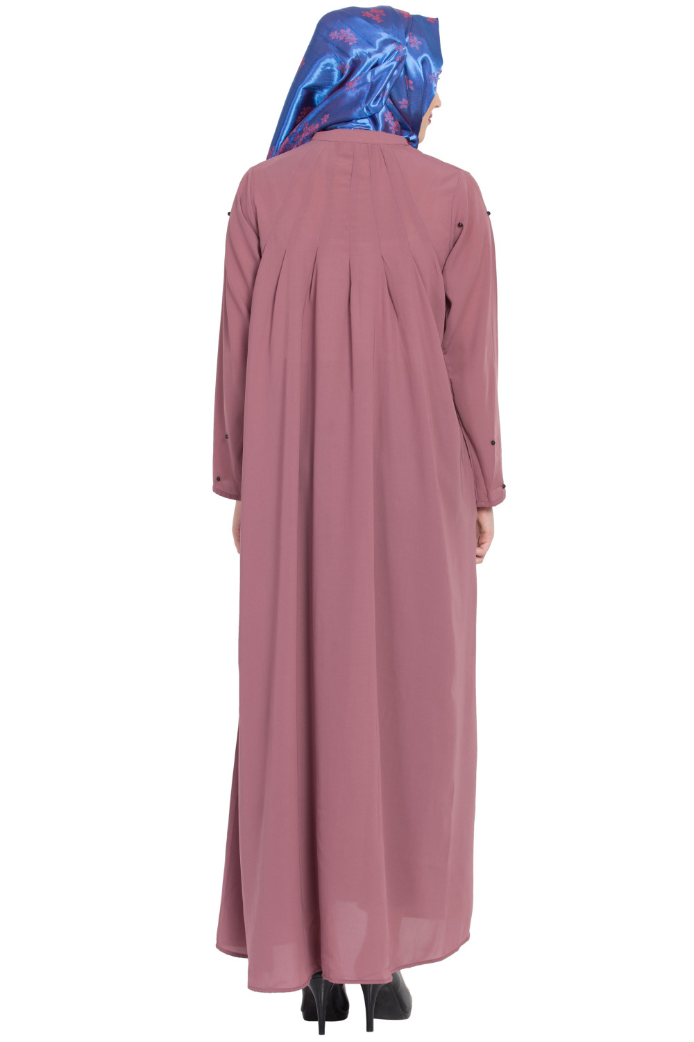 The Pintuck Zipper Abaya blends subtle craftsmanship with a streamlined shape. At the front, neat pintucks add dimension without bulk, creating clean vertical lines that lengthen the frame. A discreet zipper front lets you slip it on and off with ease, while maintaining a smooth, uninterrupted look when closed. Side-button accents are thoughtfully placed for both style and functionality, helping maintain structure and ease of movement.