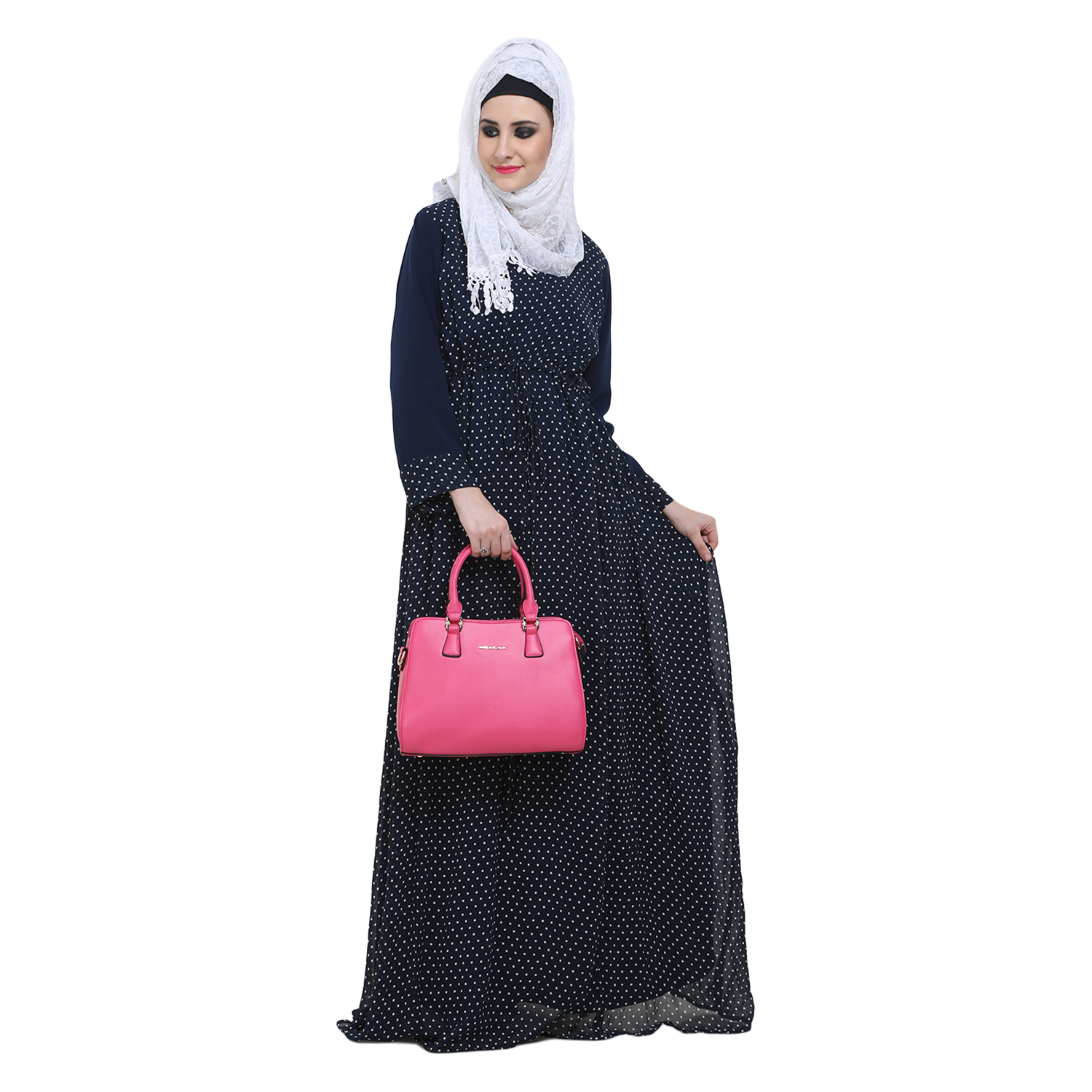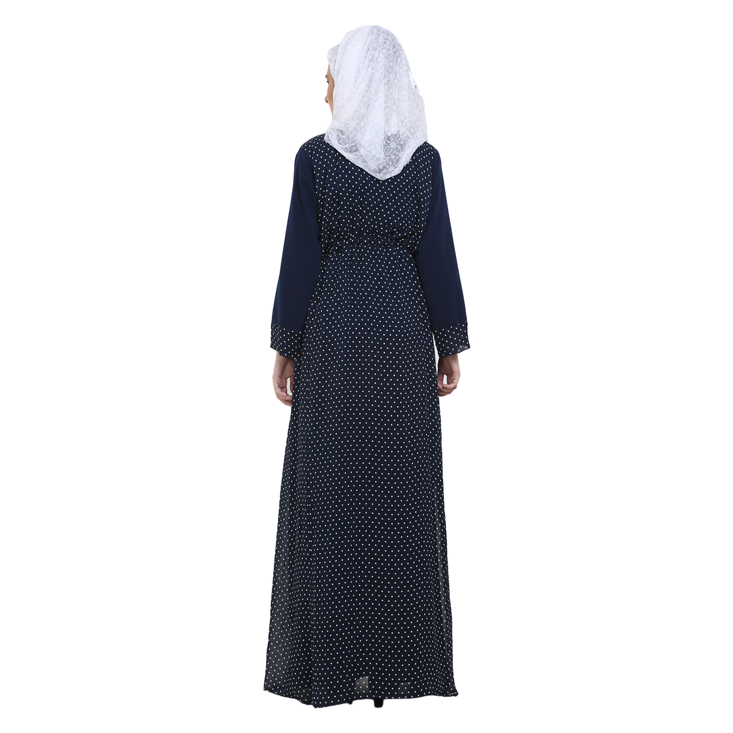 Step into timeless style with this Abaya Dress crafted in a sophisticated navy blue and finished with a playful polka dot overlay. Designed for women who value modest fashion with a refined, designer touch, this closed abaya combines movement, coverage, and texture in a way that feels both contemporary and enduring. The double-layer construction—crepe beneath and polka dot georgette above—delivers a graceful drape and an eye-catching flare, making it a versatile choice for everyday wear, special gatherings, or modest evening looks.