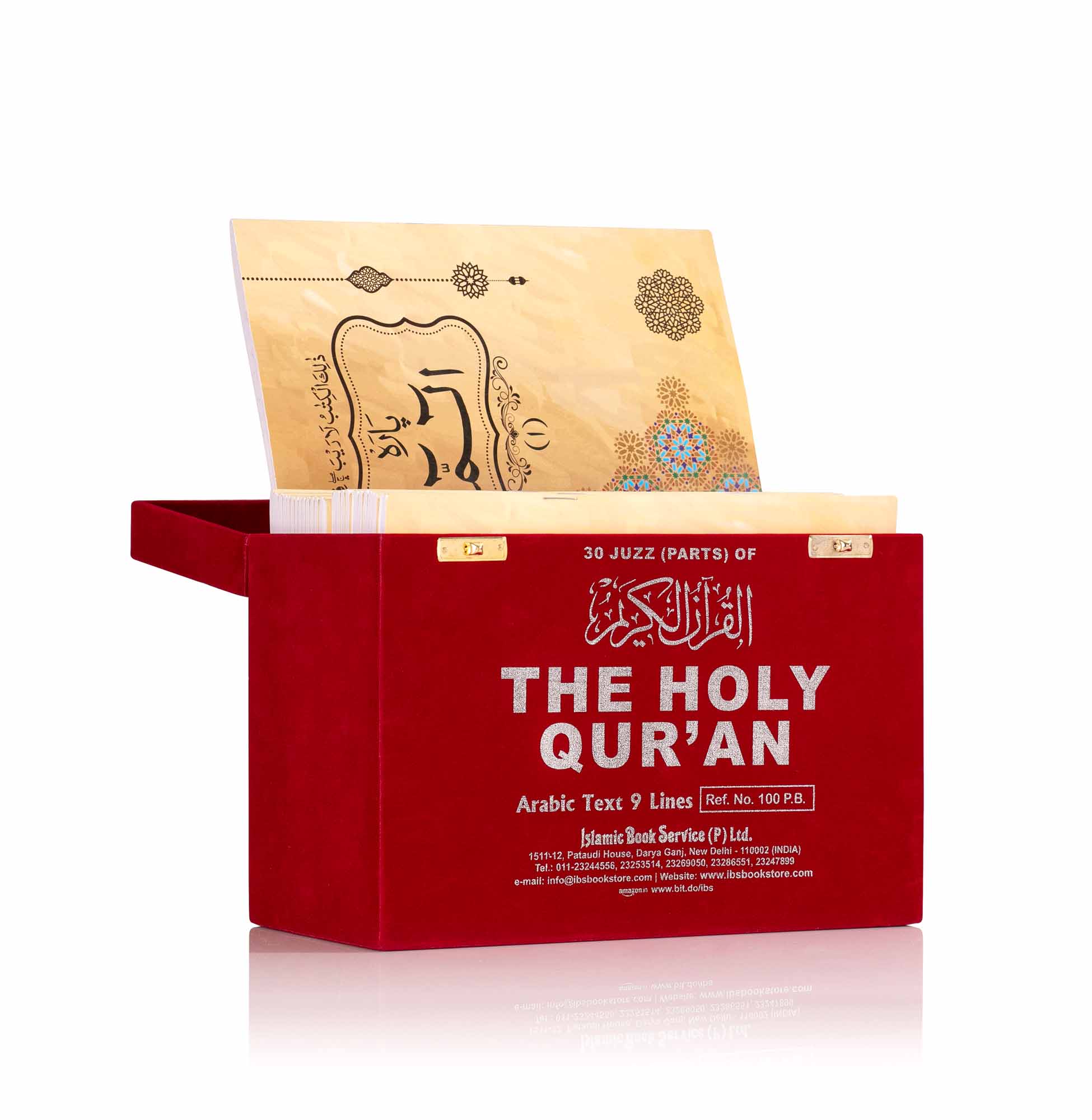 Para Set (Every chapter of the Quran as a separate booklet). Reference number – 100. Readability – 9 lines. Comes with Soft Cover and Velvet Box. Language – Arabic. Paperback.