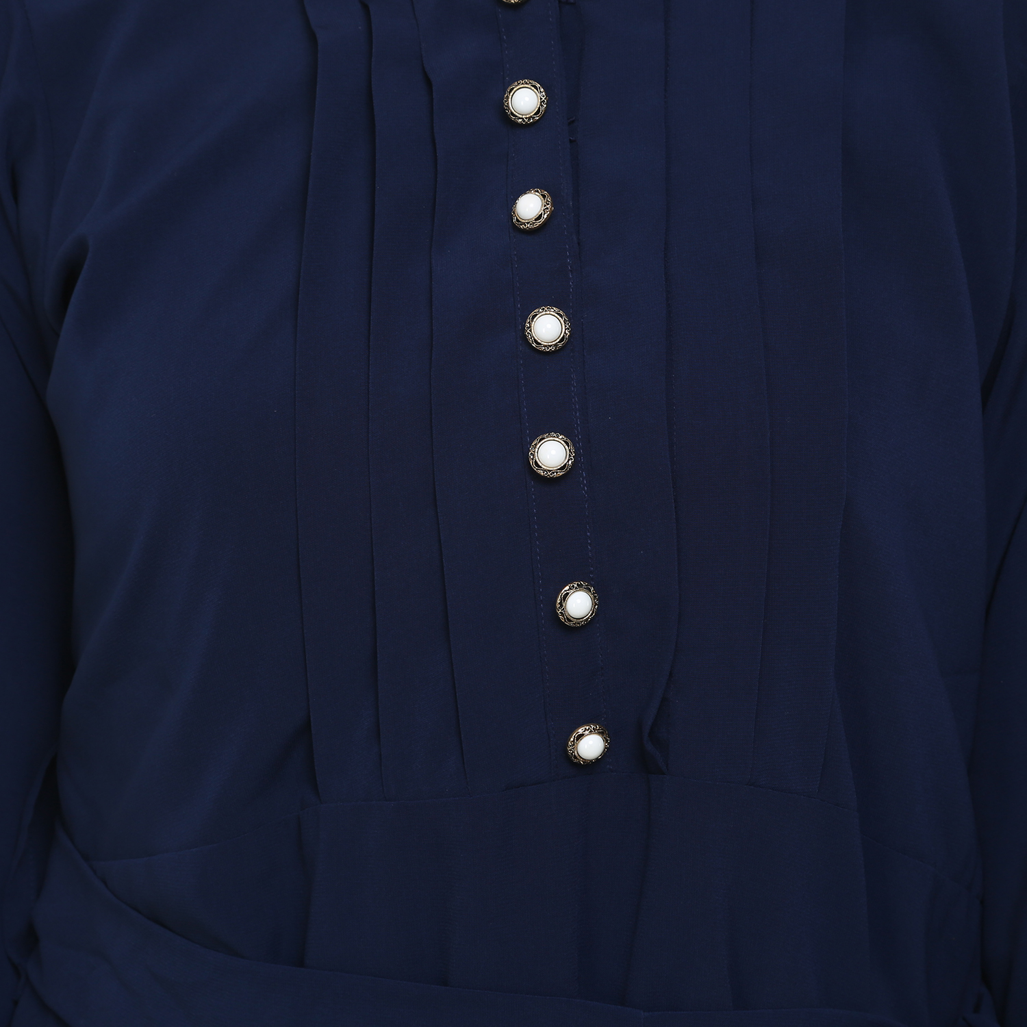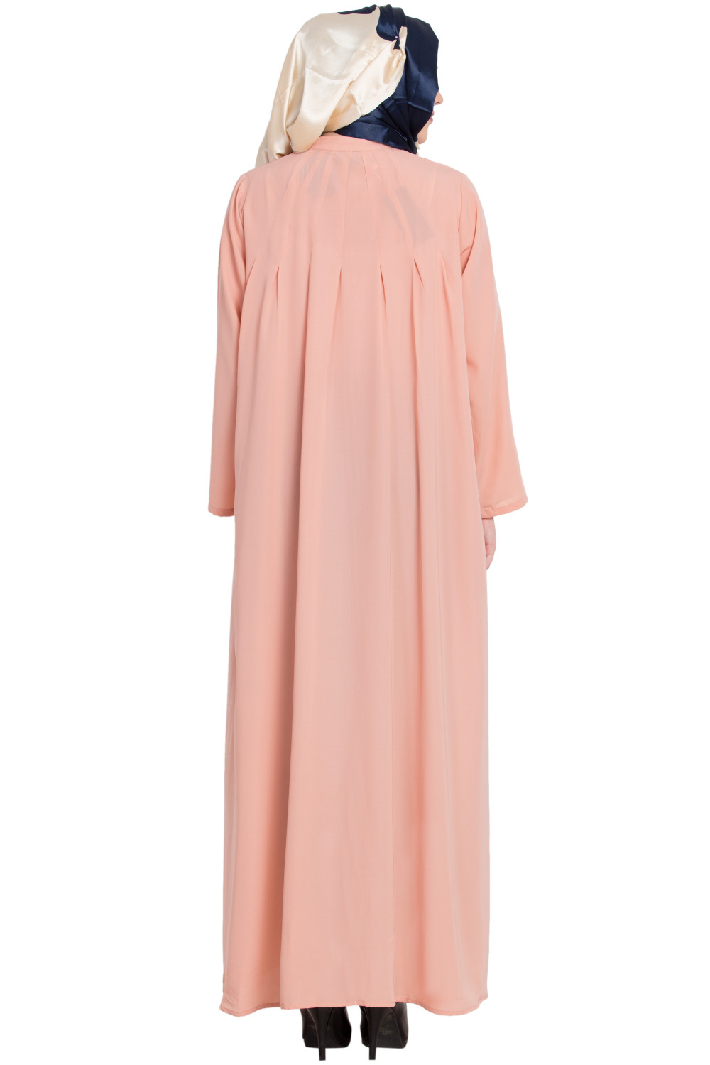 Subtle yet striking, the pintuck detailing on the front and back adds depth and sophistication without overwhelming the minimalist silhouette. These fine tucks create visual interest, enhance the vertical line of the garment, and help the abaya fall neatly for a tailored look. The neutral beige tone pairs effortlessly with a wide range of accessories and layers—think colorful scarves, neutral hijabs, structured handbags, or statement shoes—so you can style it to suit your mood and occasion.