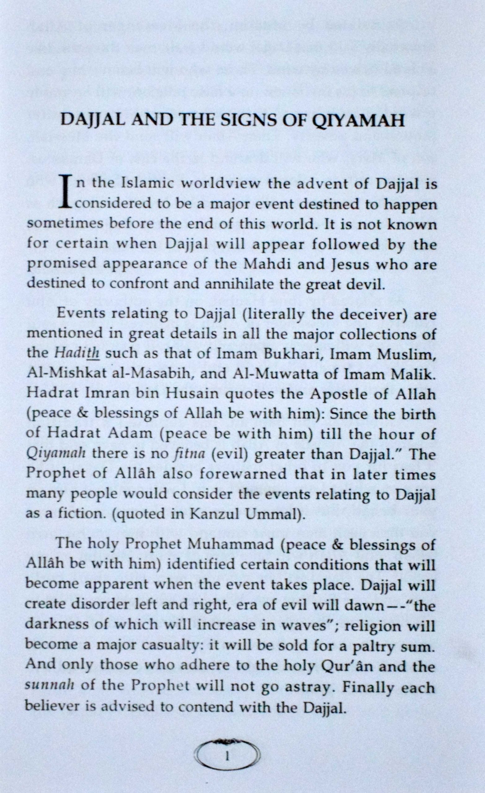 The need for this book was oCCasioned by the quick suCCession of events in the beginnings of the new millennium. The new century no less than the new millennium also call for taking stock of what has happened in our recent past and relate it to our own Islamic traditions. The attempt being made here is to understand the significance and meanings of happenings of the recent past that are ominous for the present and future of the Islamic Ummah. Moreover there appear to be disturbing trends within sections of the community at a time when its enemies are in a position of ascendancy. The idea of the Dajjal and Imam Mahdi appear relevant in these times of irreligiosity, ascendancy of anti-God ideologies, moral degeneracy and social-political disorder. In the Islamic tradition Dajjal symbolizes the devil with whom are associated, oppression, injustice, strife, falsehood and deception. On the other hand, the expectation for the advent of the Mahdi among Muslims reflects a deep-rooted desire for a future- oriented ideal- the establishment of a just social order and a moral system of governance. The wait for the Mahdi also symbolizes the idea of hope, that enduring force which drives humans to overcome challenges of life in expectation of a just future and the final indication preceding the end of time. Our world, as we know in, may be nearing its end. This does not purport to be a Doomsday theory but a recapitulation of the indications and warnings as mentioned in the Quran and Prophetic traditions (Hadith) about the end of our world. Some signs are apparent to all those who know about them while others are not so apparent but are threatening to become apparent, slowly but definitely. While numerous indications as foretold by the Apostle of Allah (peace & blessings of Allah be withhim) have come true, the major event before the end of this world, that is, the advent of Dajjal- the final deceiver is yet to happen. However the situation and conditions forthe appearance of the Dajjal appear to be in place in our own times. Dajjal’s followers have arrived and are in control of our world before the final deceiver makes his appearance on the world’s stage; Dajjalic ideas have become dominant and have already declared their victory. The final deception is threatening to become the final reality of our times.