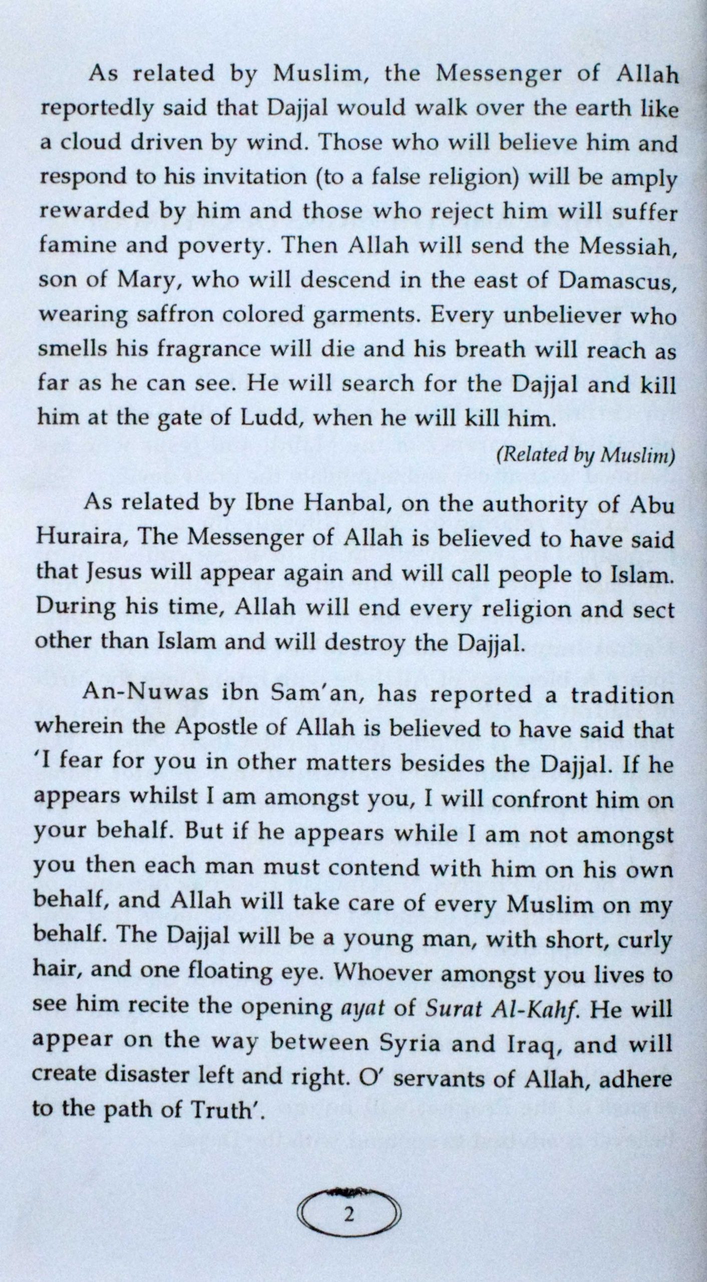 These and other signs of the impending Doomsday were foretold by the Messenger of Allah (peace and blessings of Allah be with him) more than fourteen hundred years ago. However, other events foretold such as the advent of one-eyed Dajjal, appearance of the Mahdi (AS) – and the resurrection of ]esus Christ (peace be with him) is yet to take place.
